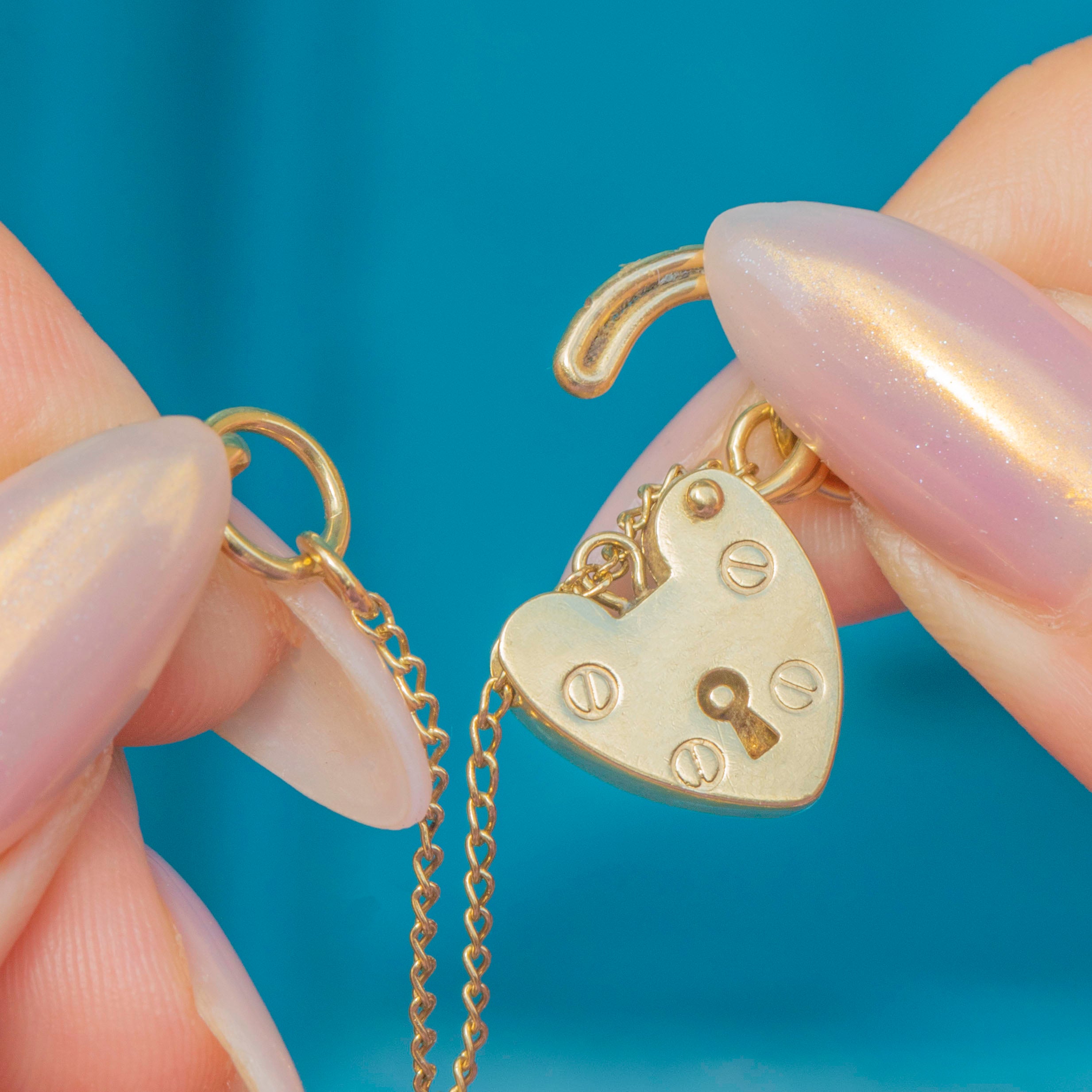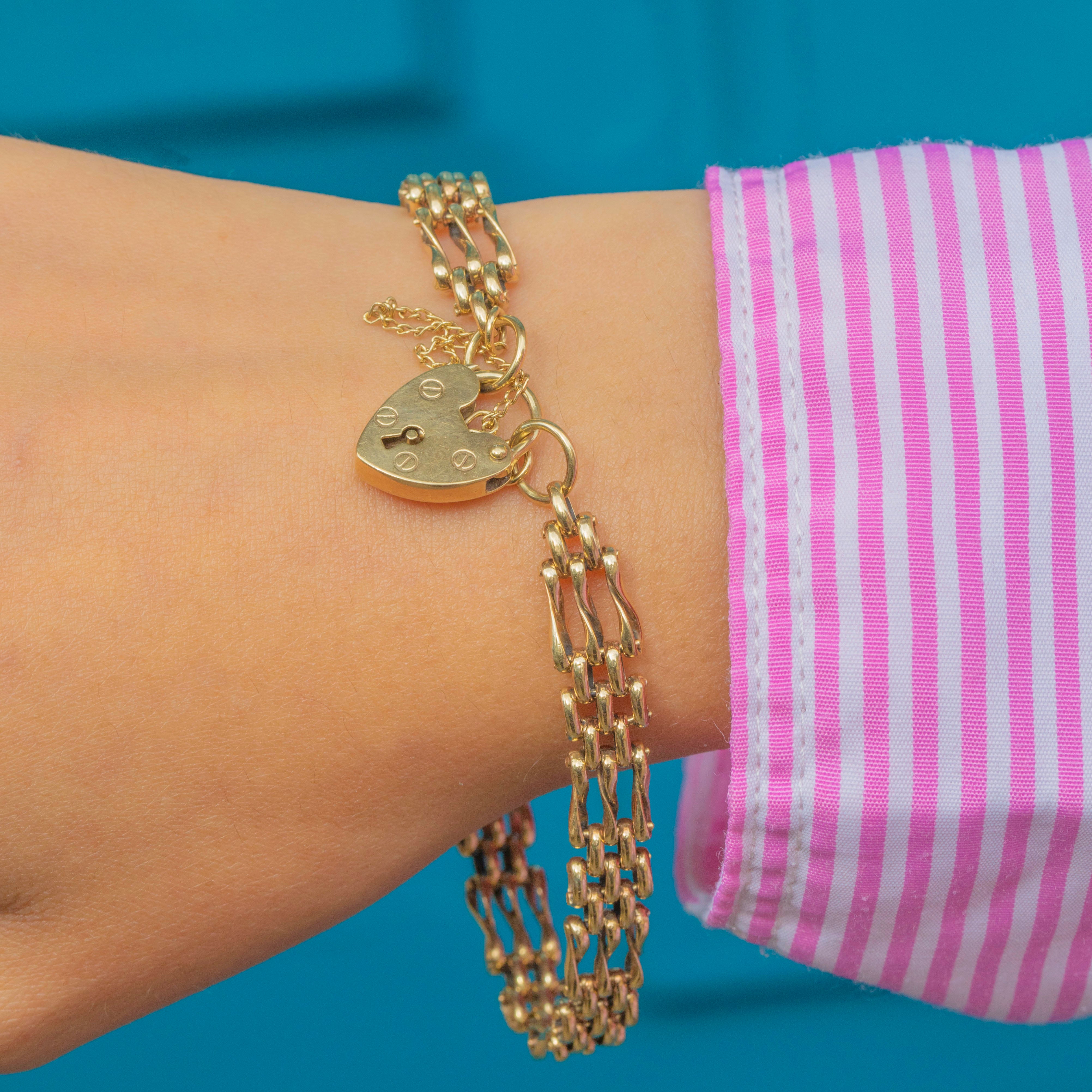 The bracelet closes securely with a functioning heart padlock, a later addition, which can be removed and worn on other jewels if desired.