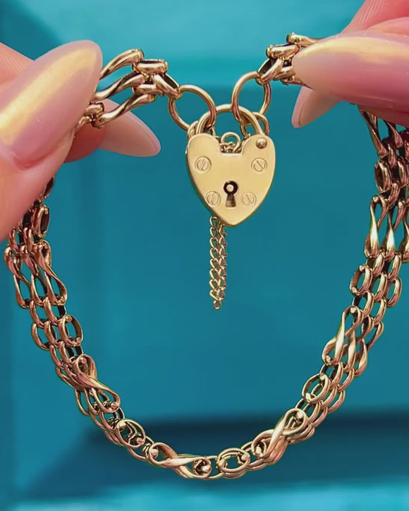 Antique 9ct Gold Gate Bracelet, Heart Padlock Clasp, 13.1g