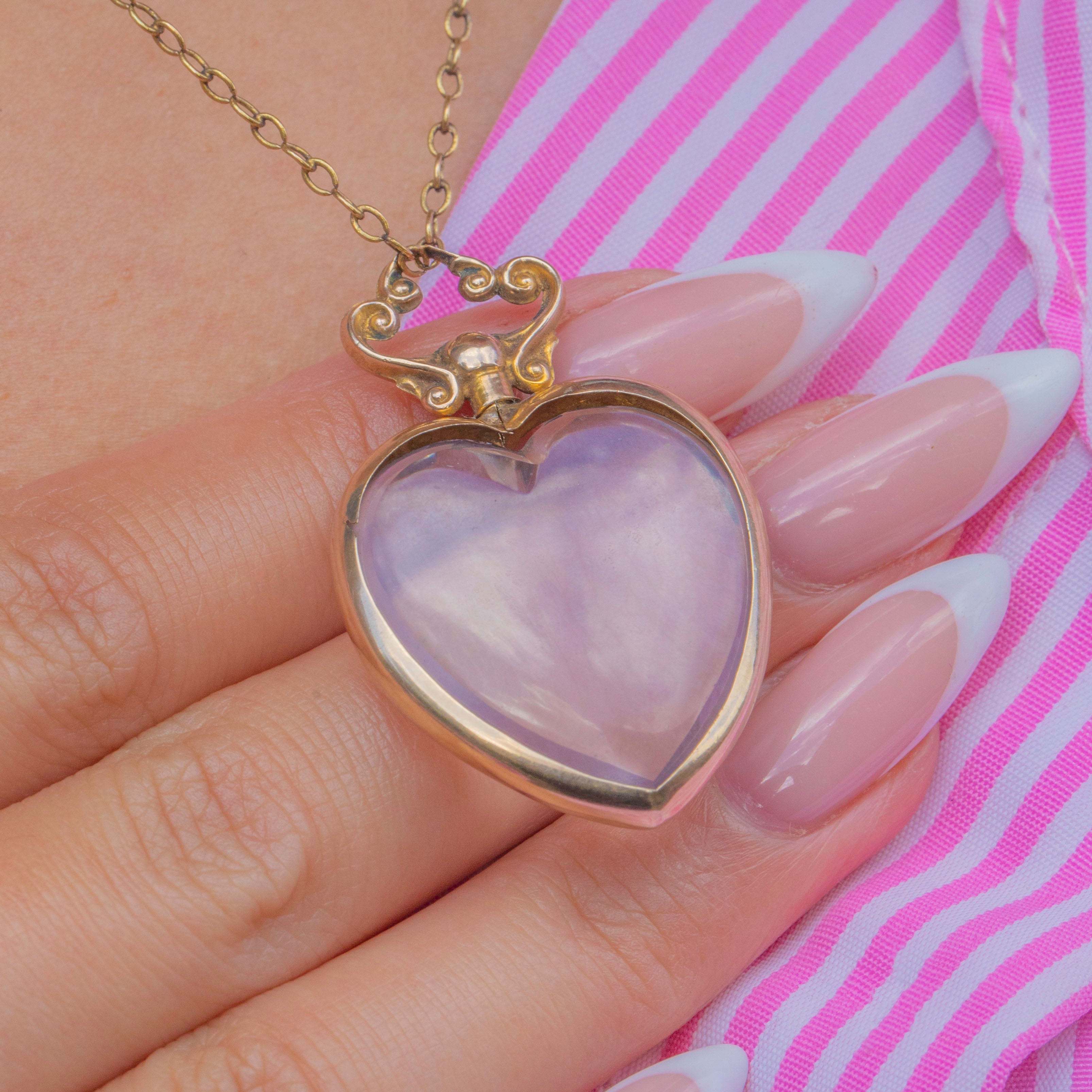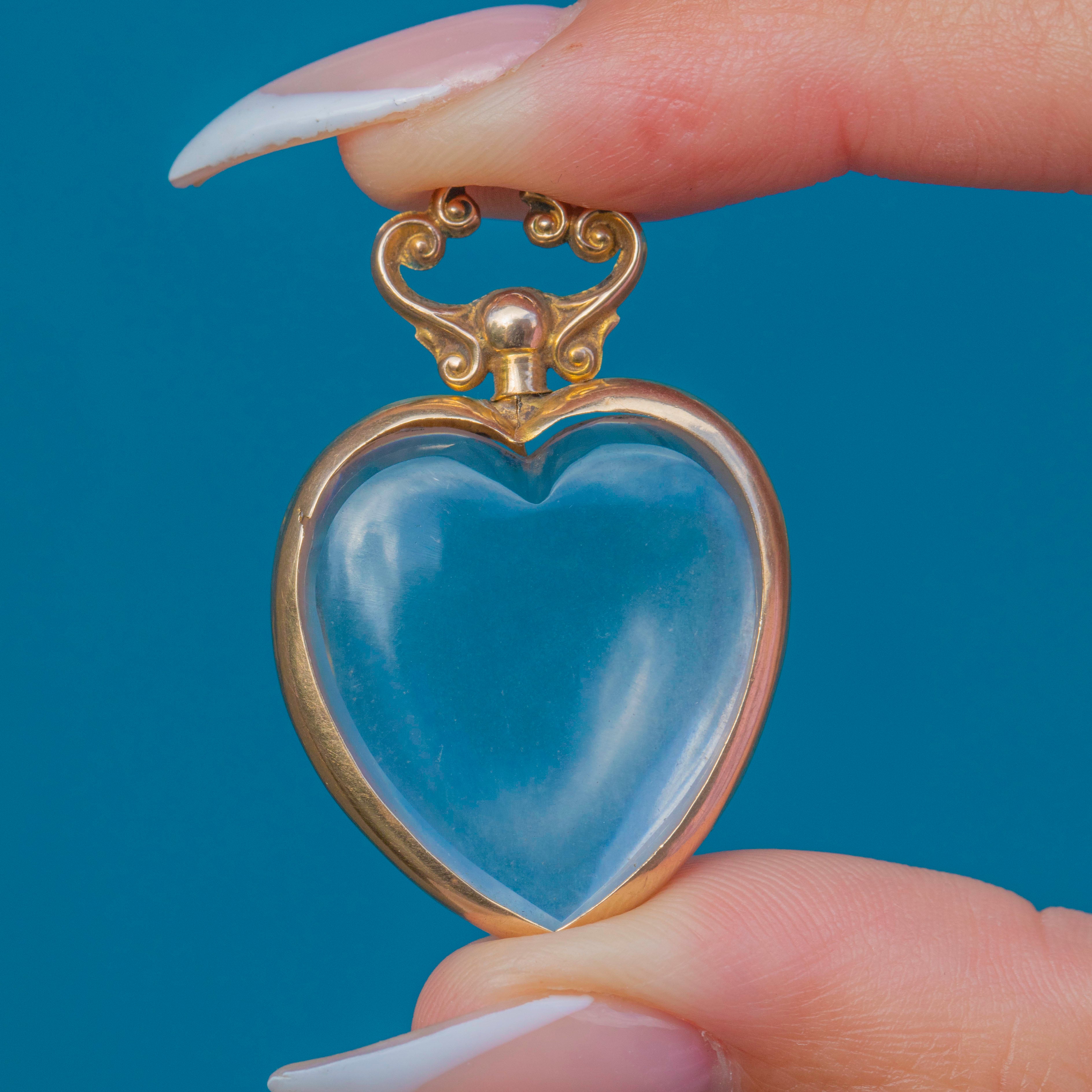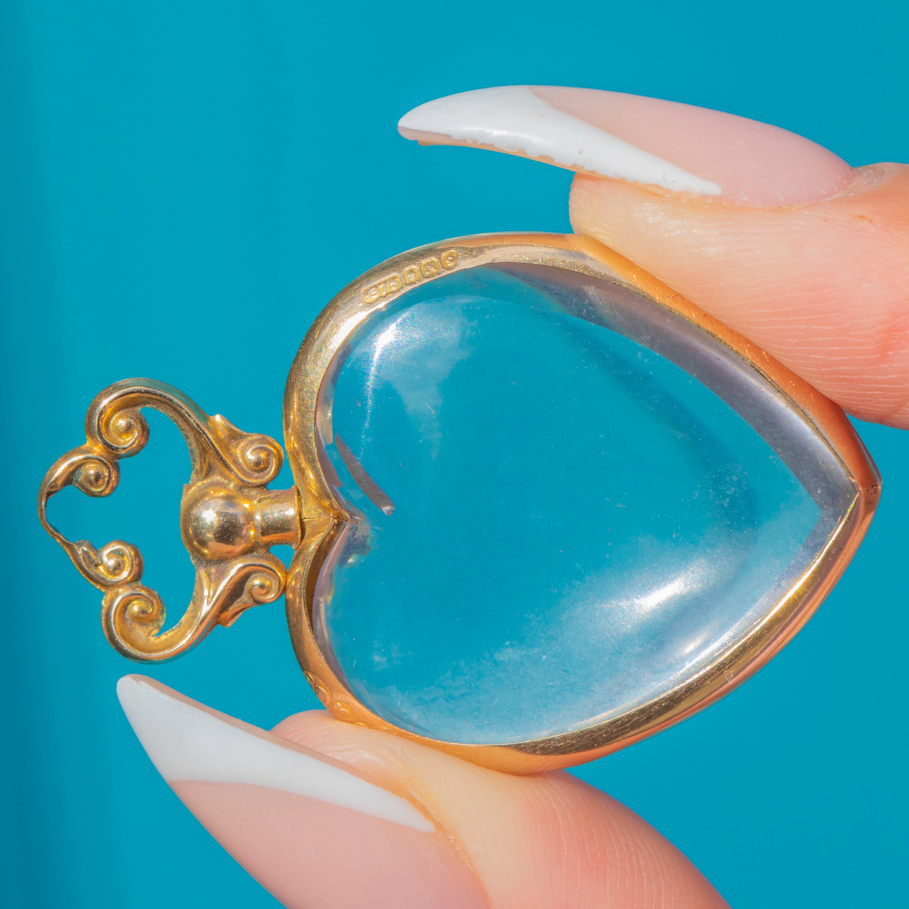 This exquisite antique heart locket is a beautiful example of early 20th-century craftsmanship. Made in 9ct Gold, the locket features two clear glass frames designed to hold cherished photographs or mementos. The elegant heart shape is finished with a scrolled Gold bail, enhancing its romantic charm.