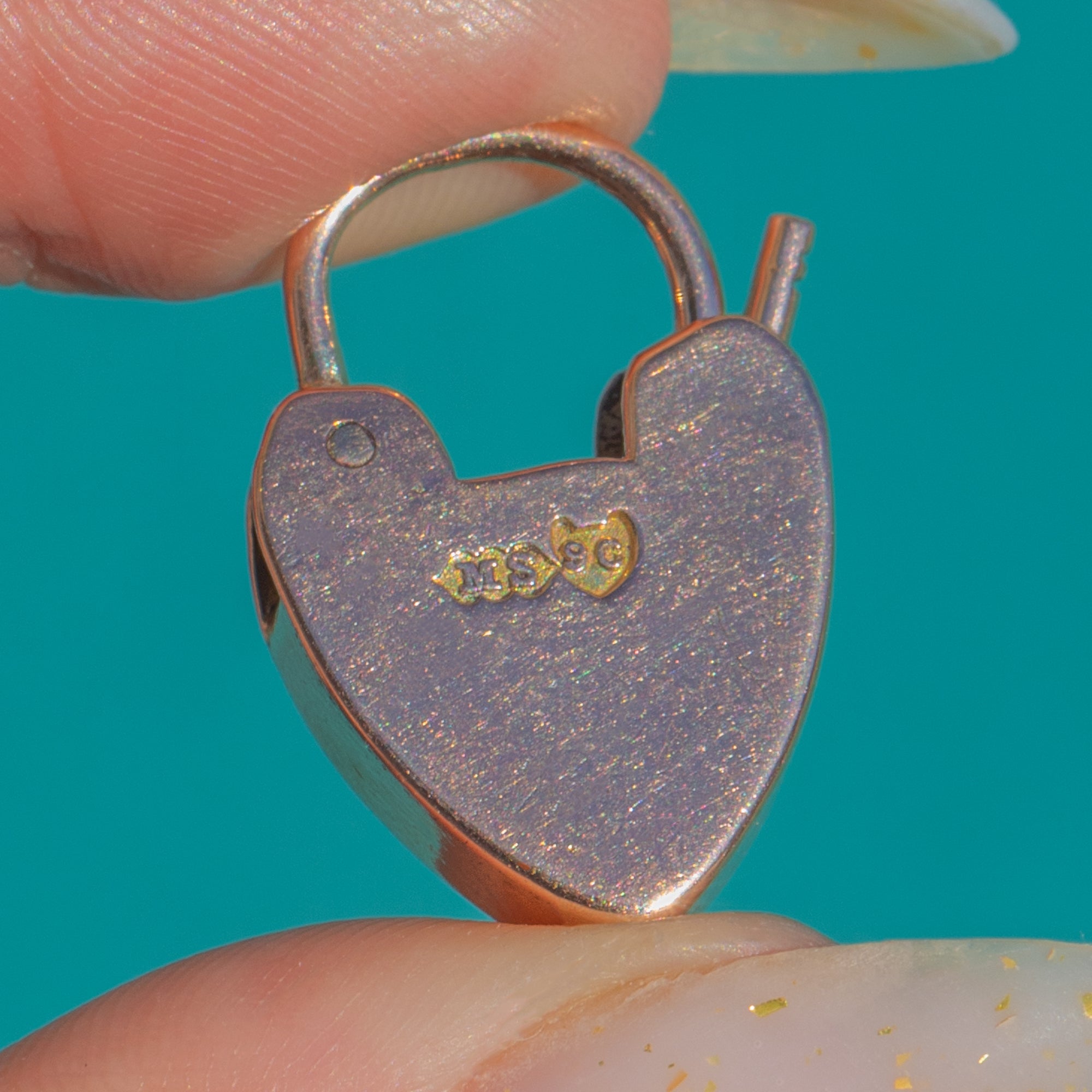 A classic Victorian sweetheart, this functional heart padlock charm is crafted in glowing 9ct Gold. The face is detailed with a pierced keyhole and tiny faux screw rivets; its softly rounded contours and warm hue make it an effortless everyday treasure.