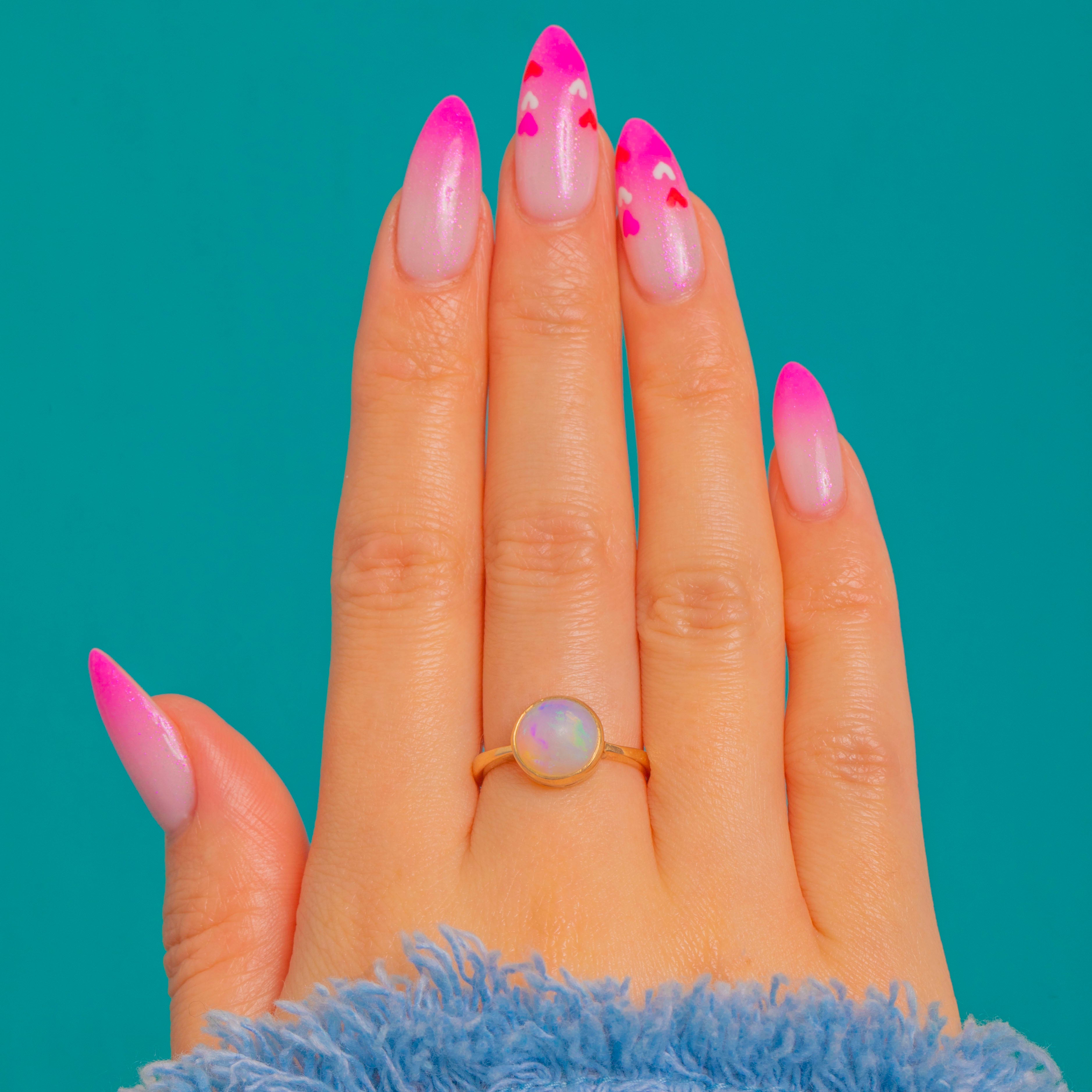 A luminous antique Opal solitaire, crafted in 9ct Gold with timeless Victorian poise. The high-domed cabochon shimmers with an enchanting play-of-colour—flashes of green, blue, pink and lilac dance beneath the surface—nestled securely within a smooth, full bezel for an elegant, effortless silhouette.