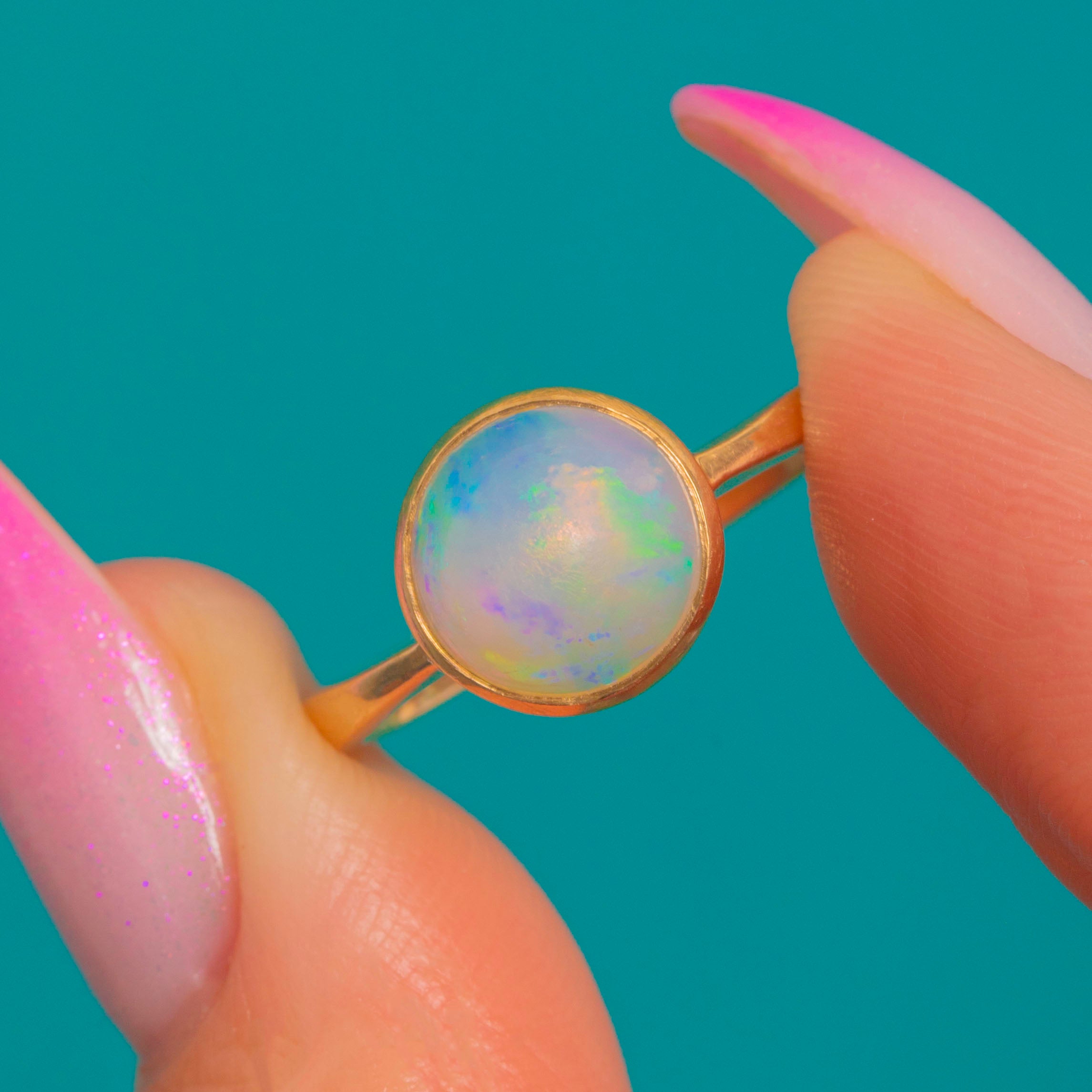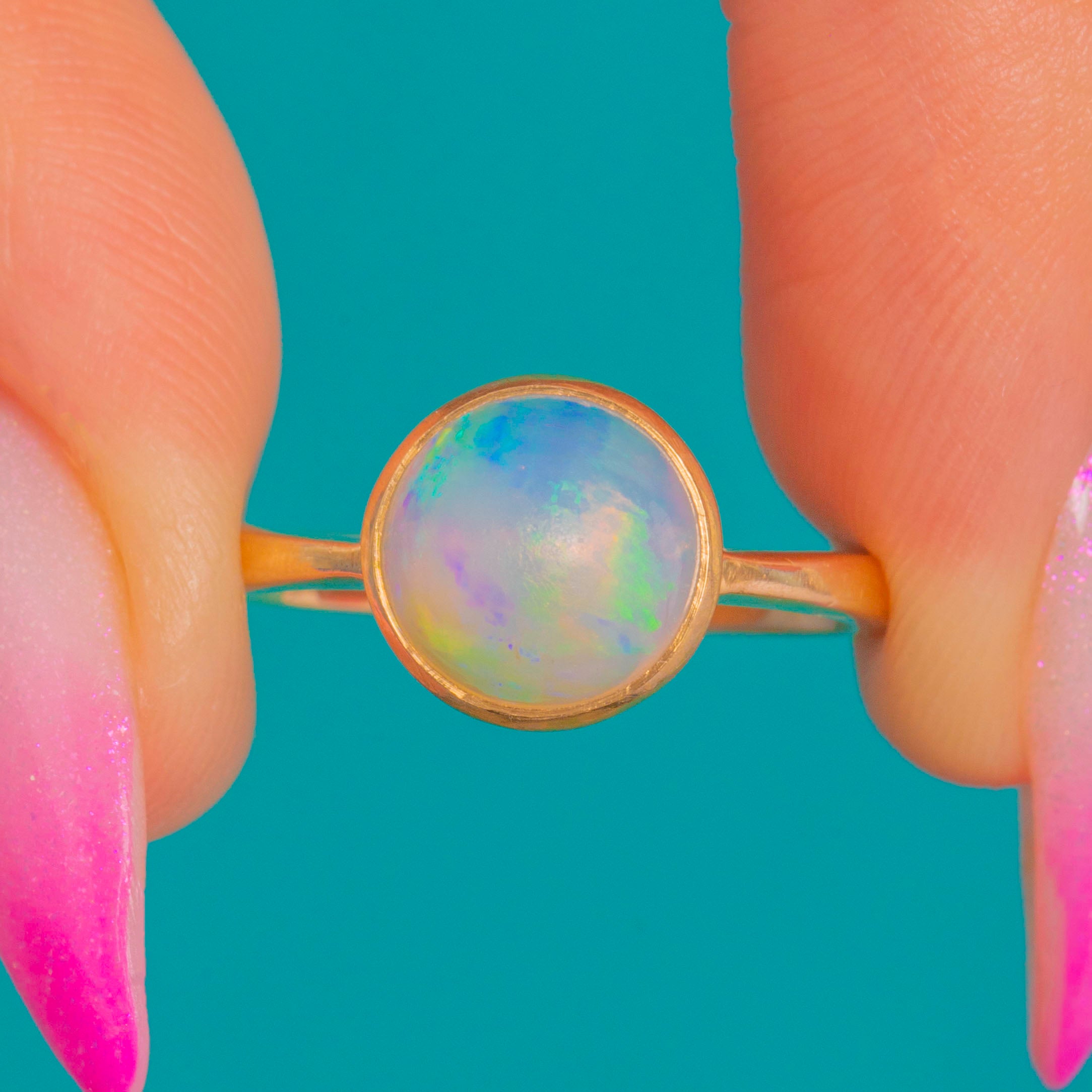 EXCELLENT: The Opal is bright with a smooth domed surface and no visible chips or cracks. The 9ct Gold bezel and slender shank are crisp with only fine surface marks commensurate with age. Overall beautifully preserved and ready to wear.
