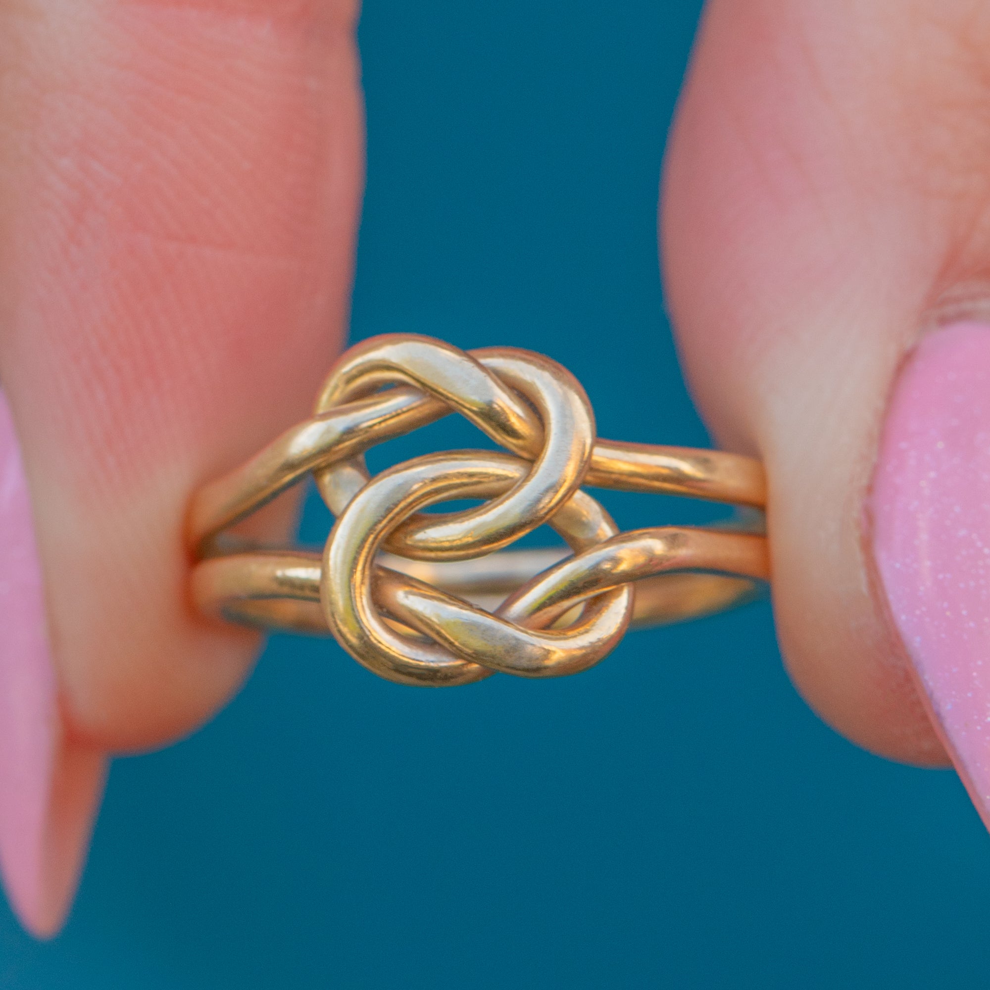 Steeped in romantic sentiment, this quintessentially Victorian ring features a lover's knot in her centre, interlocking two separate bands, symbolising two people coming together.