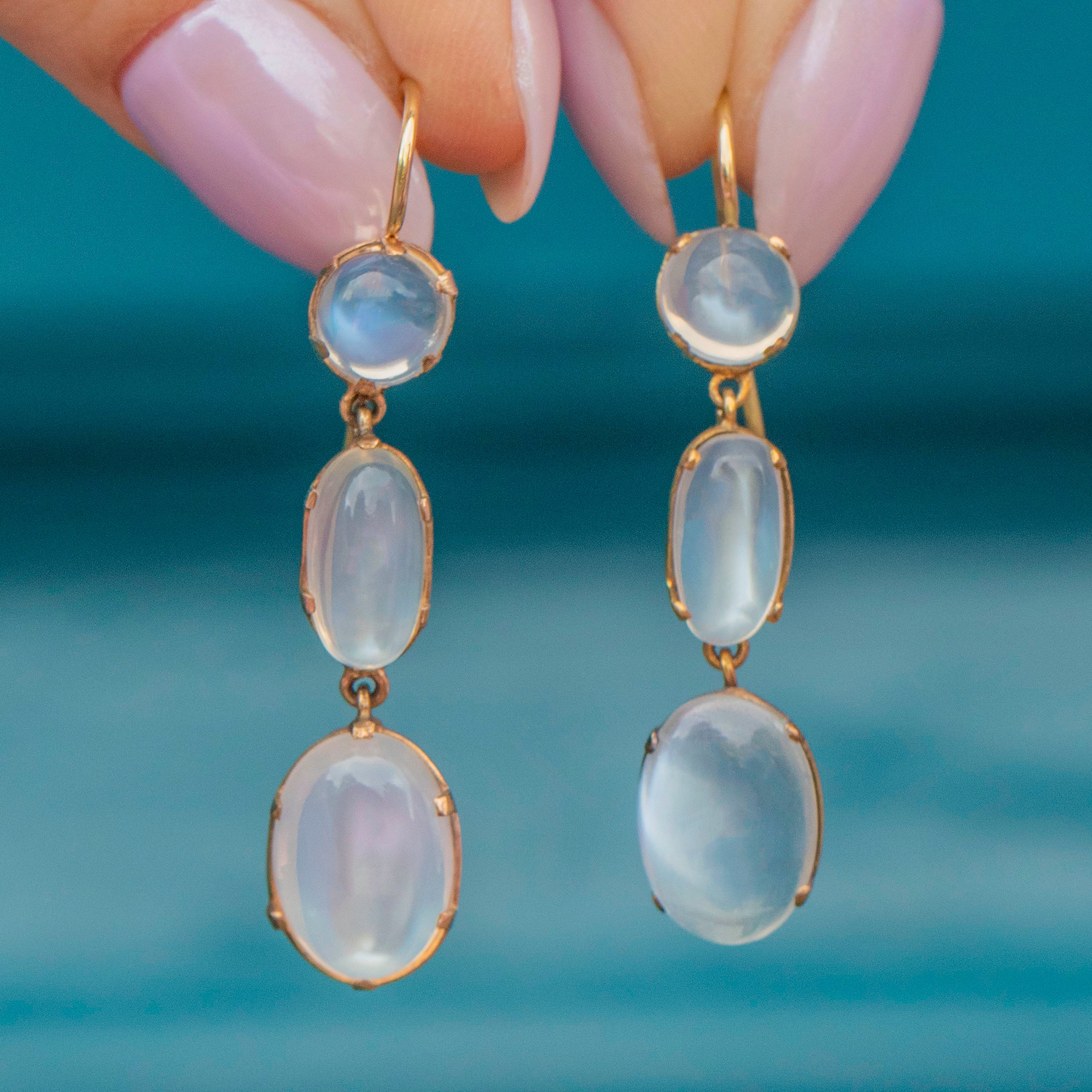 EXCELLENT. These antique 9ct Gold Moonstone drop earrings are in excellent condition throughout. The Moonstones all have a beautiful glow and are held securely in place by their settings. Her 9ct Gold is saturated with a wonderful glow and generously sized earring hooks; these Victorian earrings are ready to be worn with pride for many years to come!