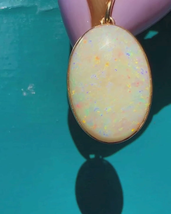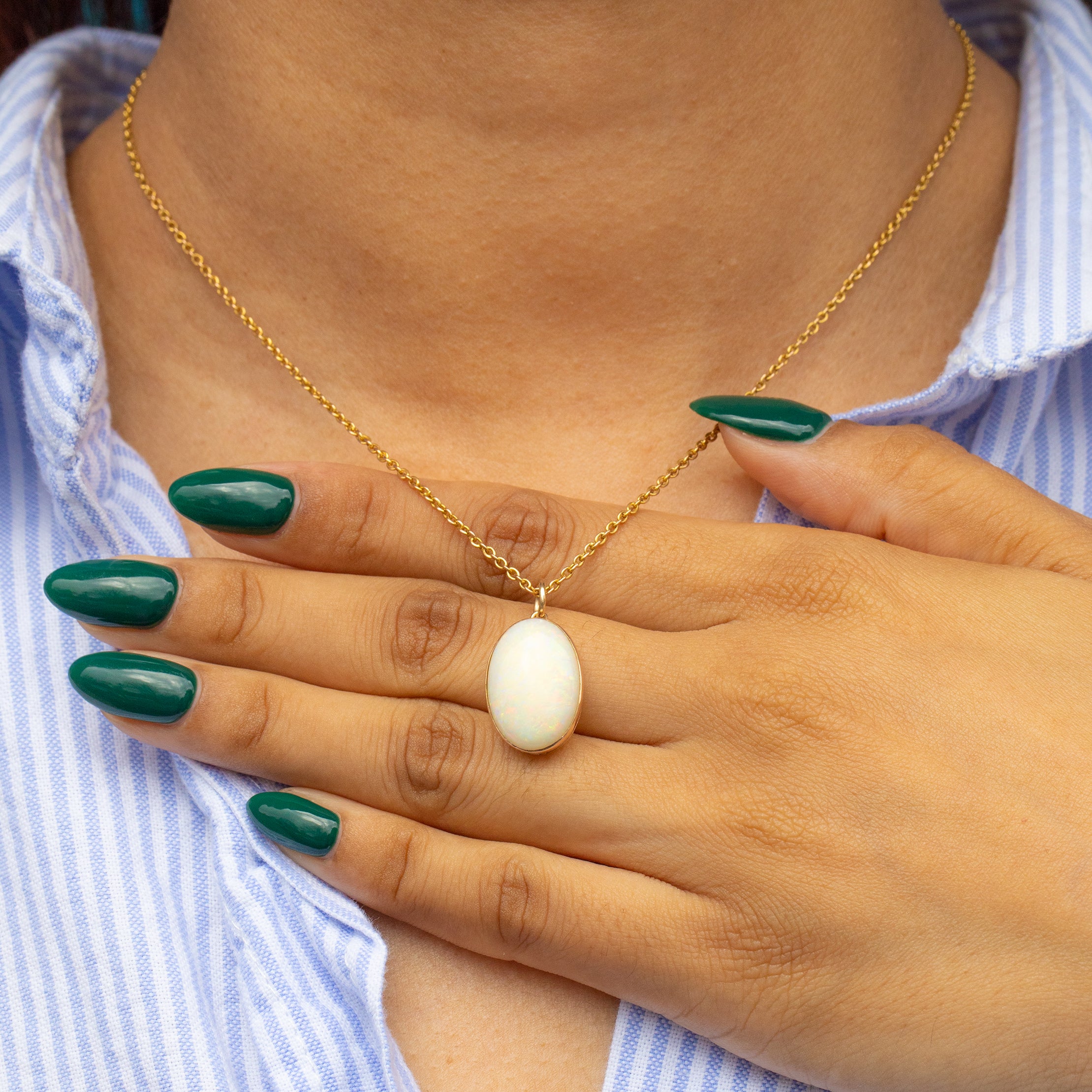 This antique 9ct Gold Opal cabochon pendant is full of fire! With vivid flashes of electric blue, lime green, and neon orange, you'll easily get lost in her iridescent depths.