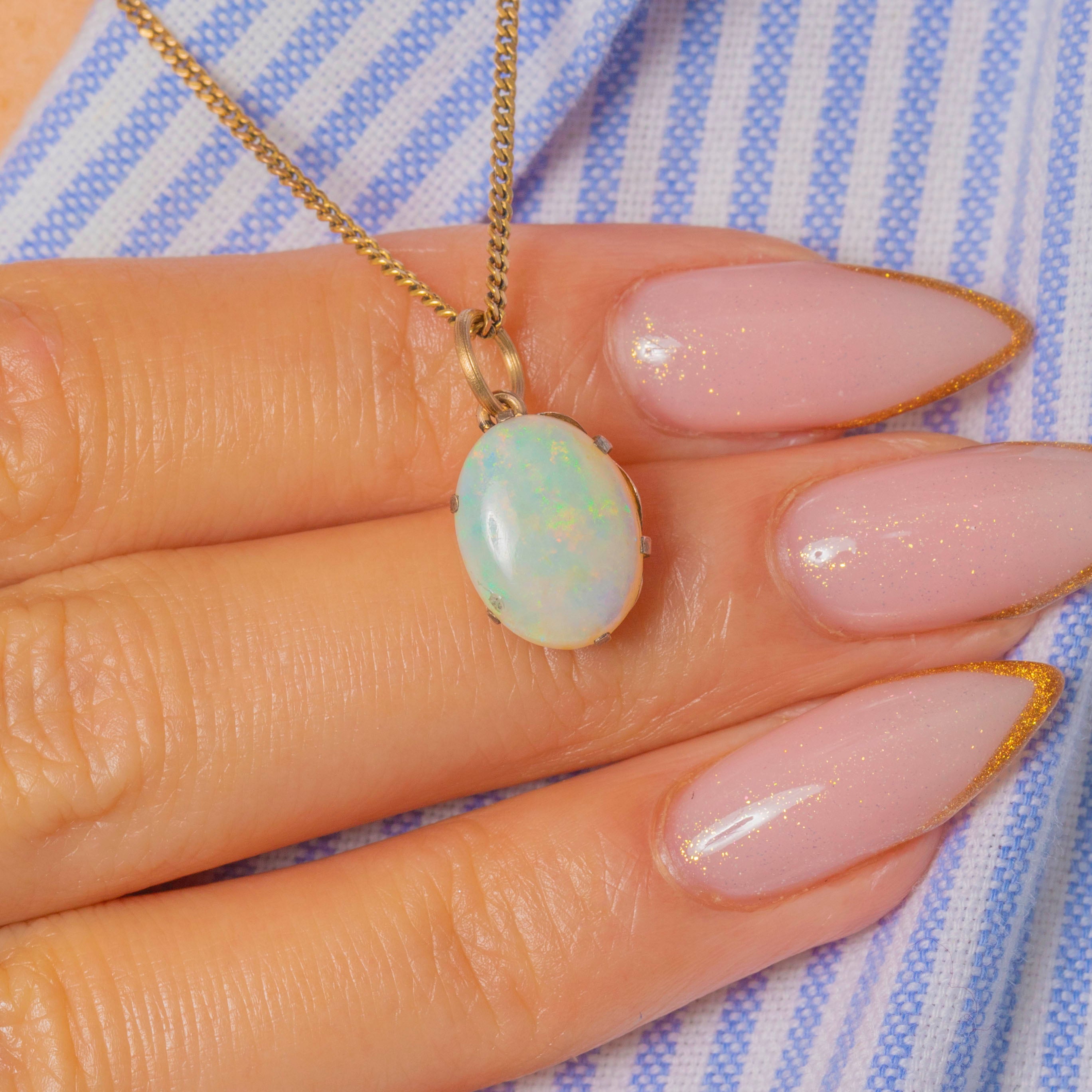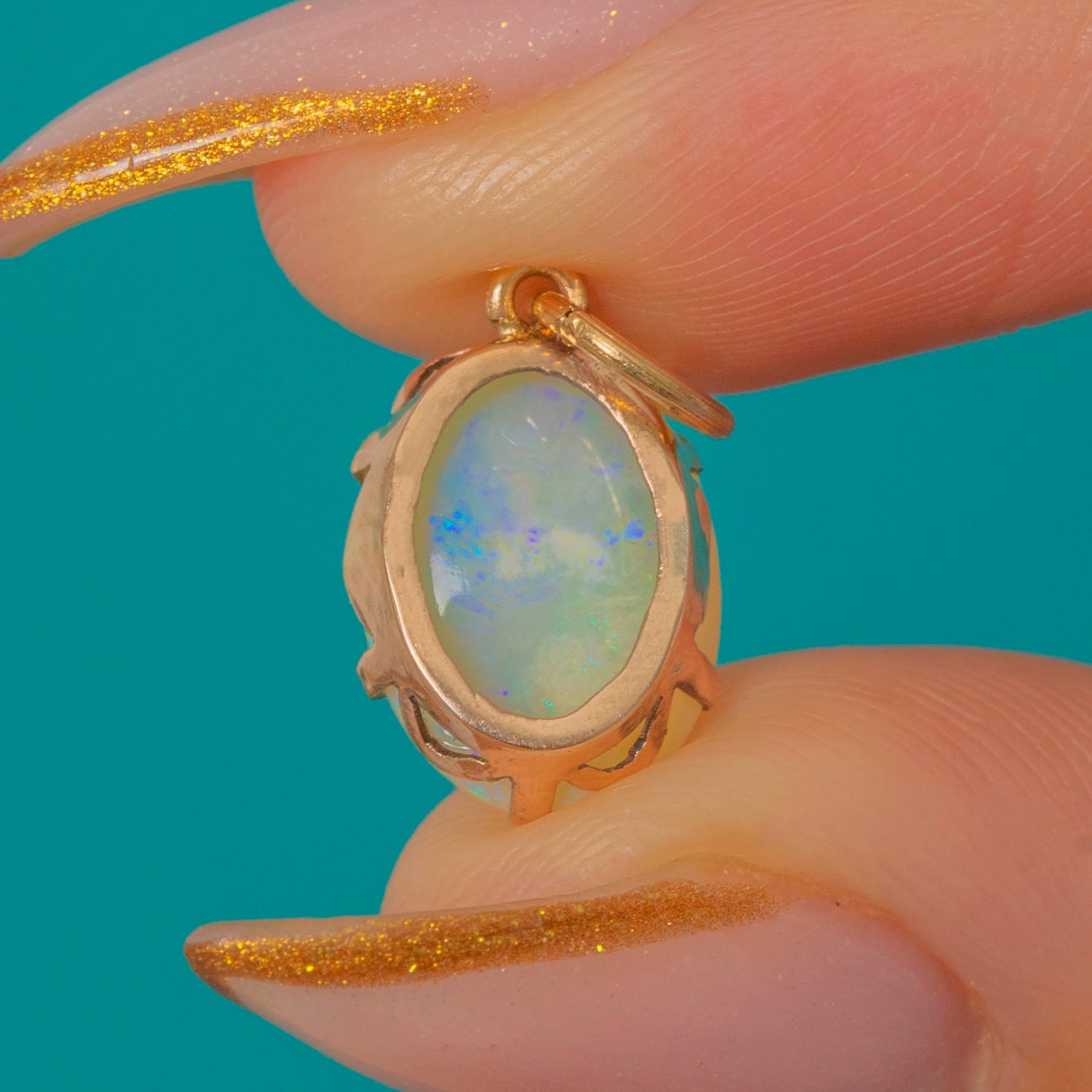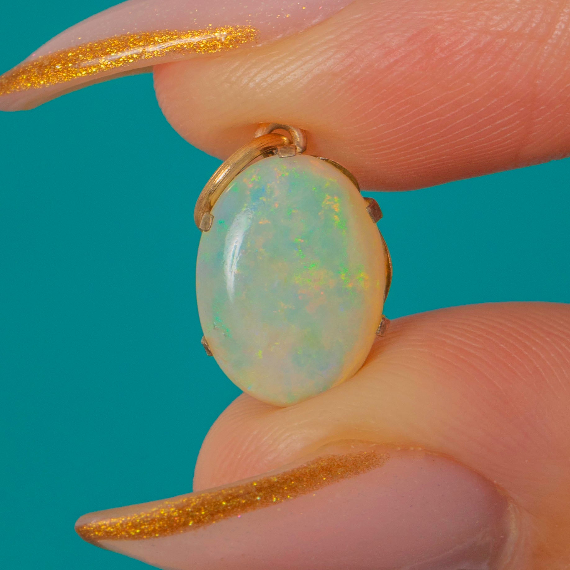 A beautiful antique Opal charm from the Art Deco era, glowing with soft pastel fire. The natural solid Opal, weighing approximately 1.60ct, displays a captivating play-of-colour — flashes of green, pink, and blue shimmer across its surface as it moves.