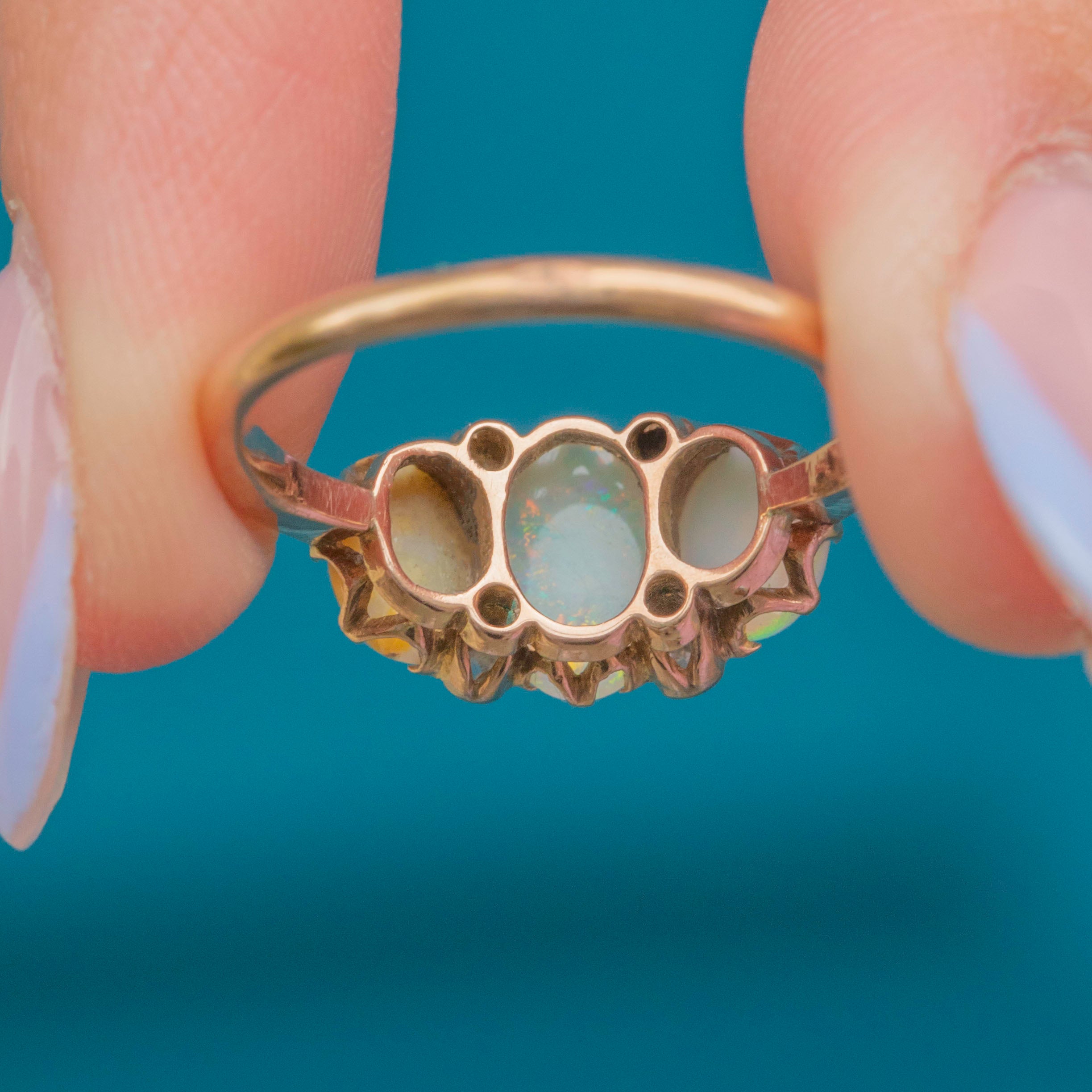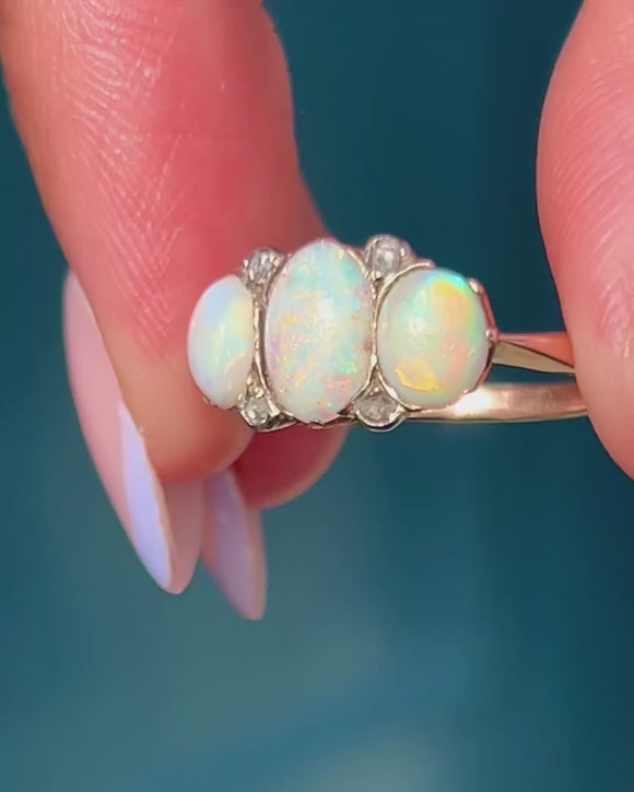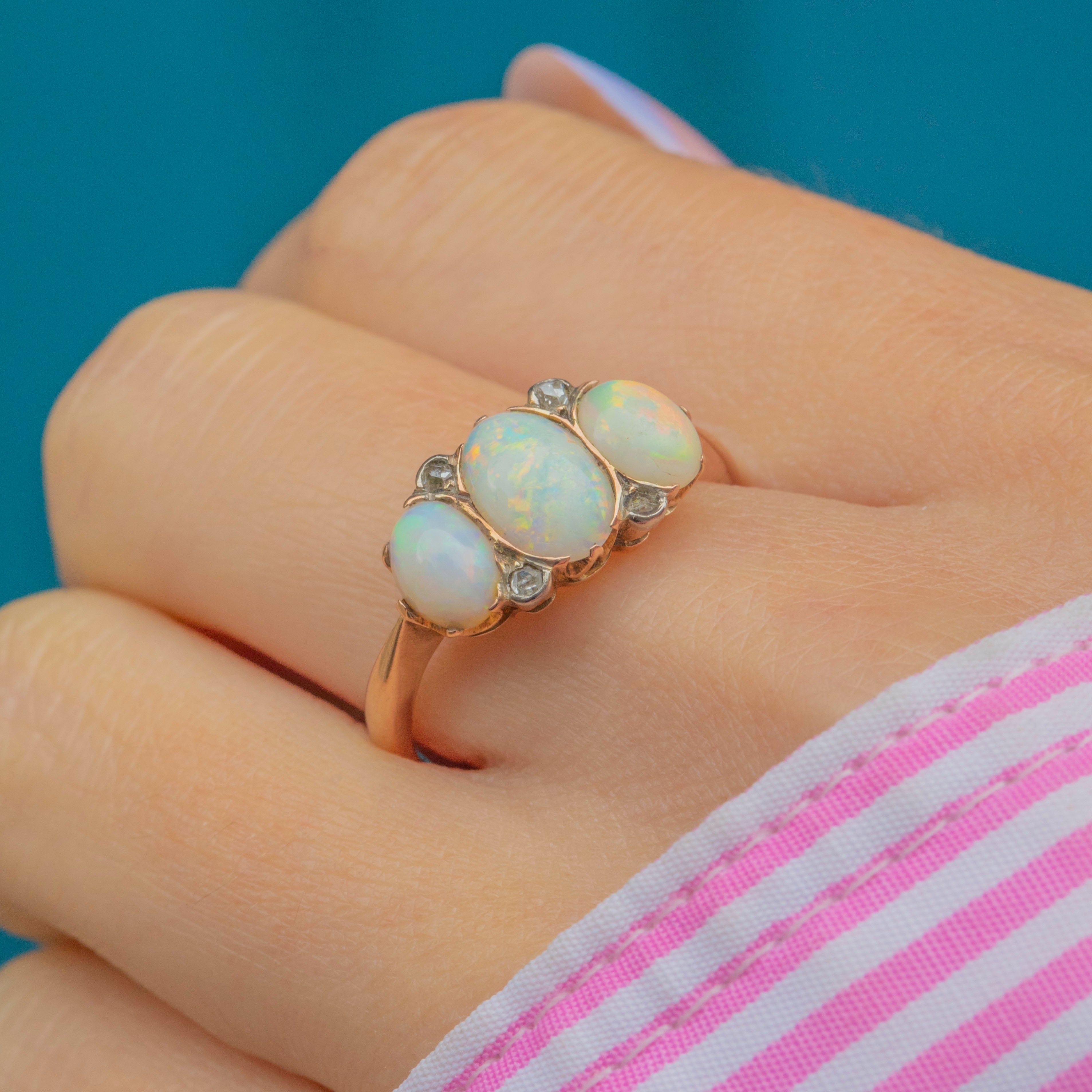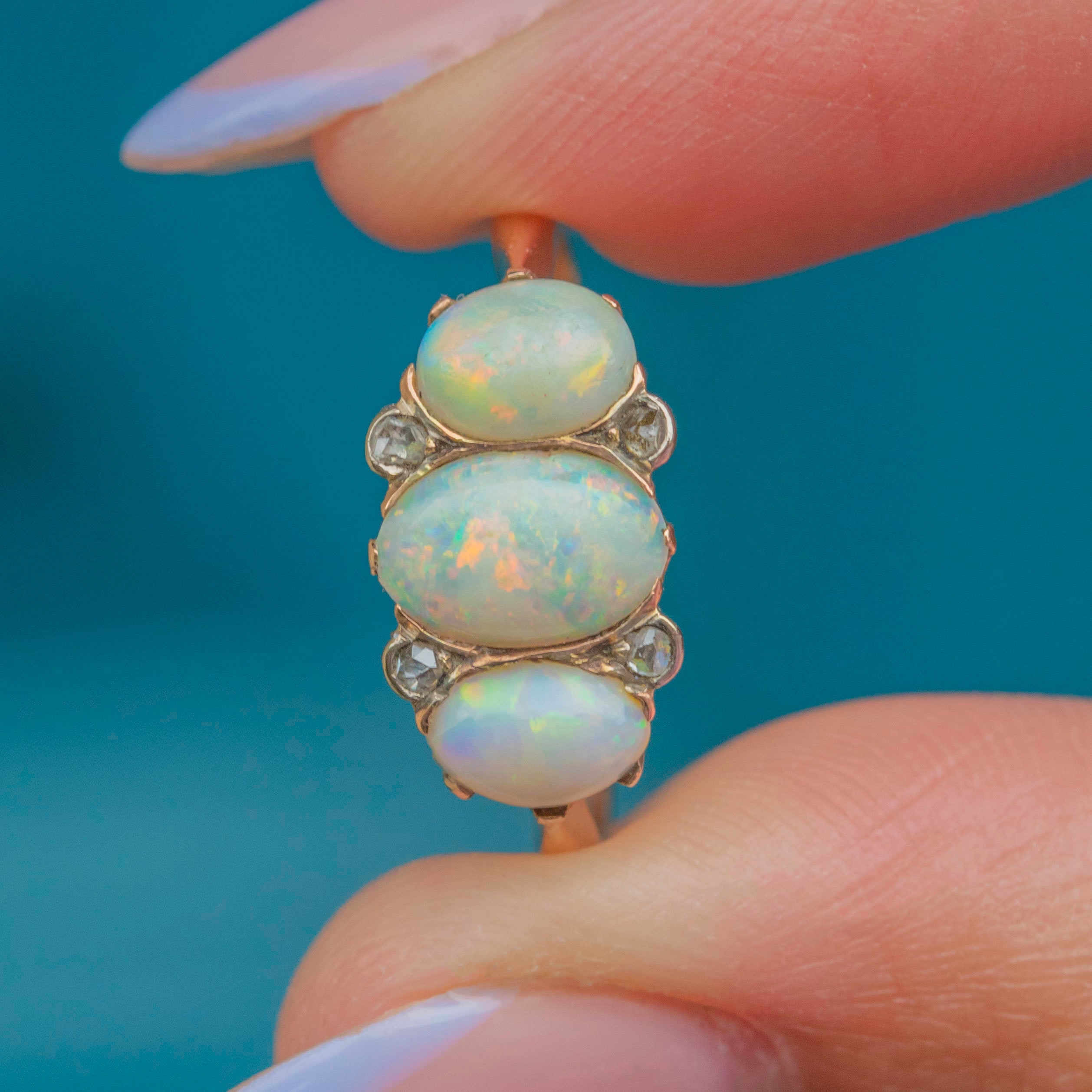 VERY GOOD: This antique 9ct Gold Opal Diamond trilogy ring is in very good condition. The Gold is bright and buttery with only minor surface wear throughout, and the band robust, promising confident wear. The gemstones are all present and securely set, and although the Opals have some mild surface wear, commensurate with age, they still have a fiery play-of-colour. If you have a penchant for exquisite jewels, this Victorian Opal ring is a must for your collection!