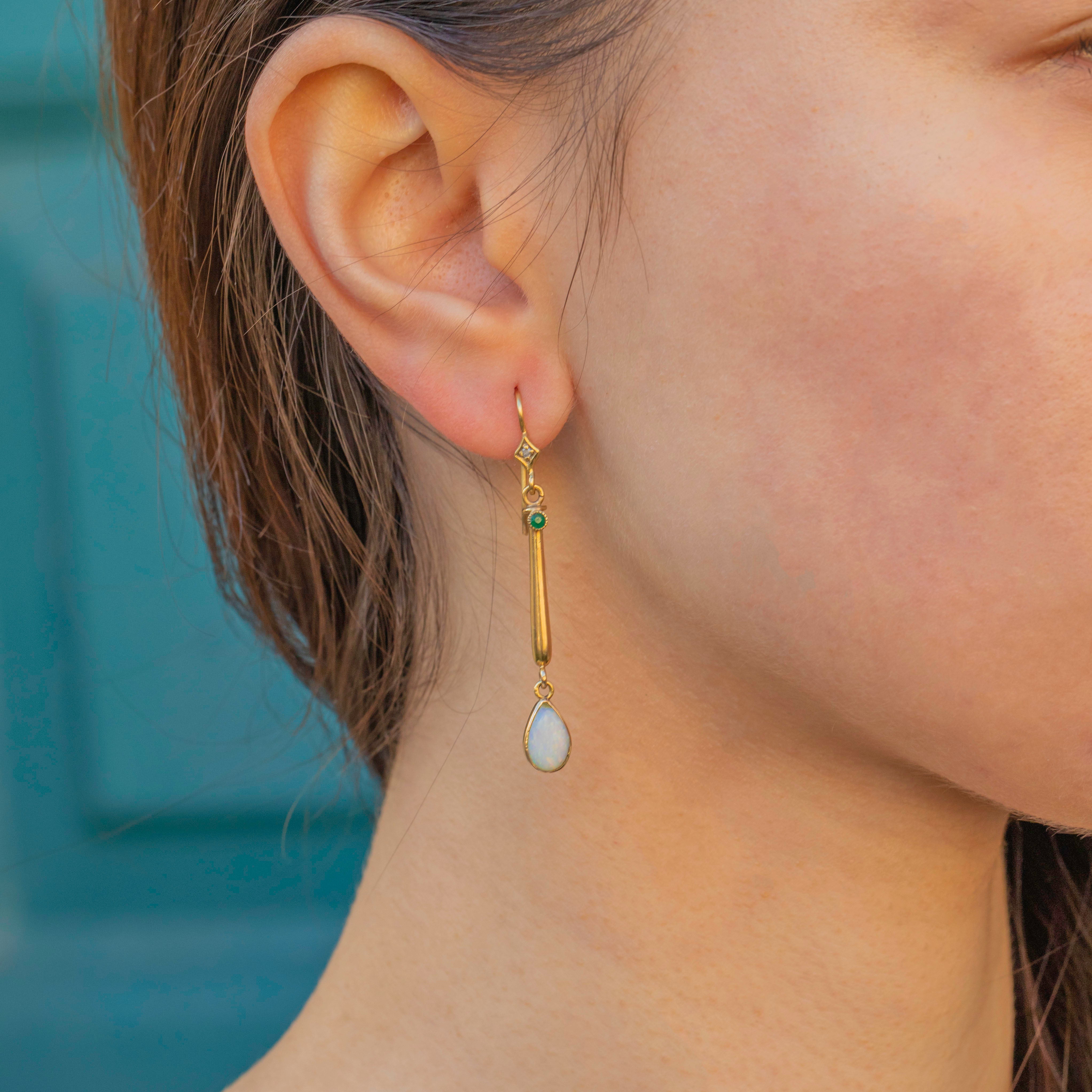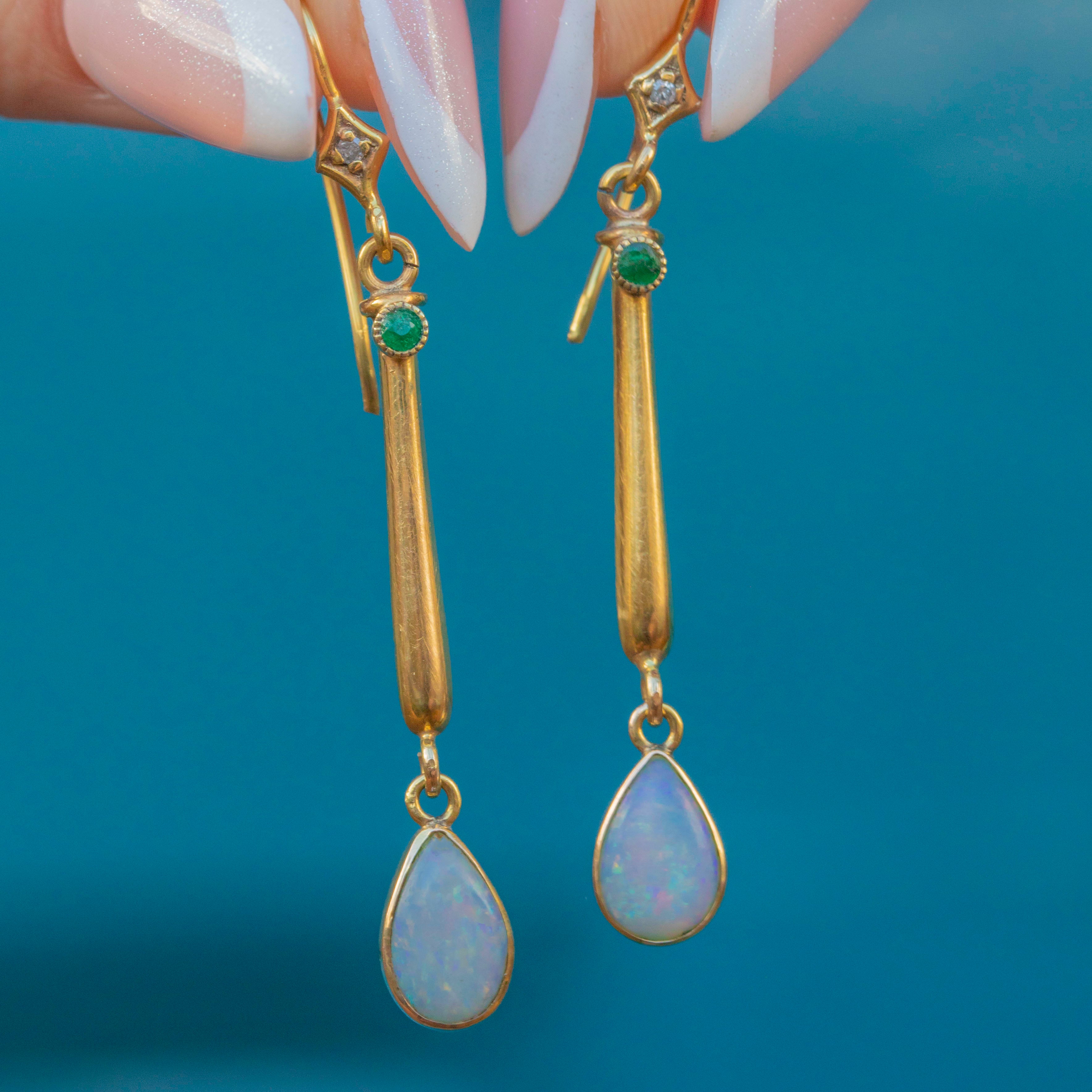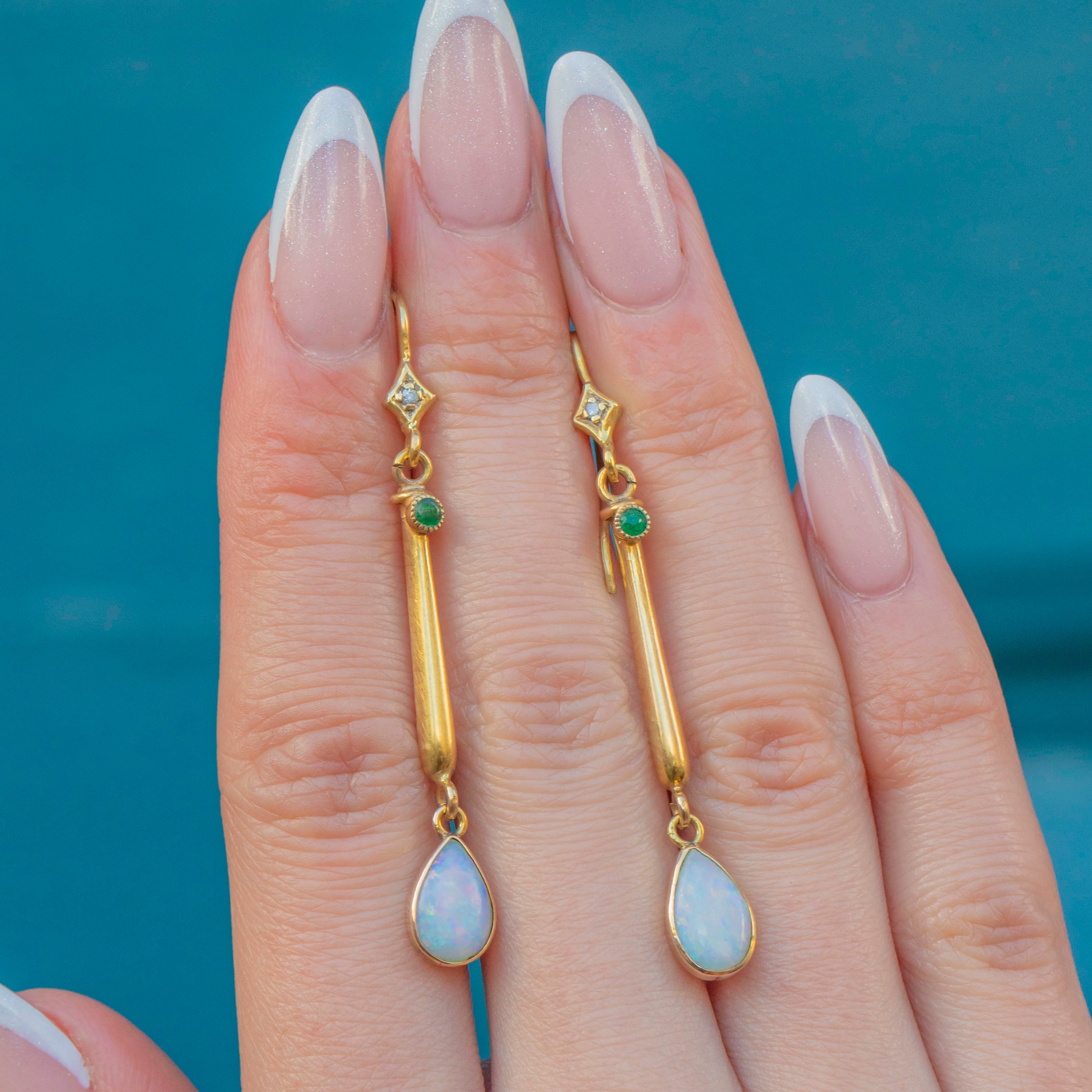 Dainty rose-cut Diamonds sit just below the lobes, accompanied by vibrant green Paste gems leading to curvaceous bars that suspend teardrop Opal cabochons. The Opals reveal flashes of neon orange, green and pink as they catch the light, adding an ethereal finish to this refined pair of antique Gold earrings!