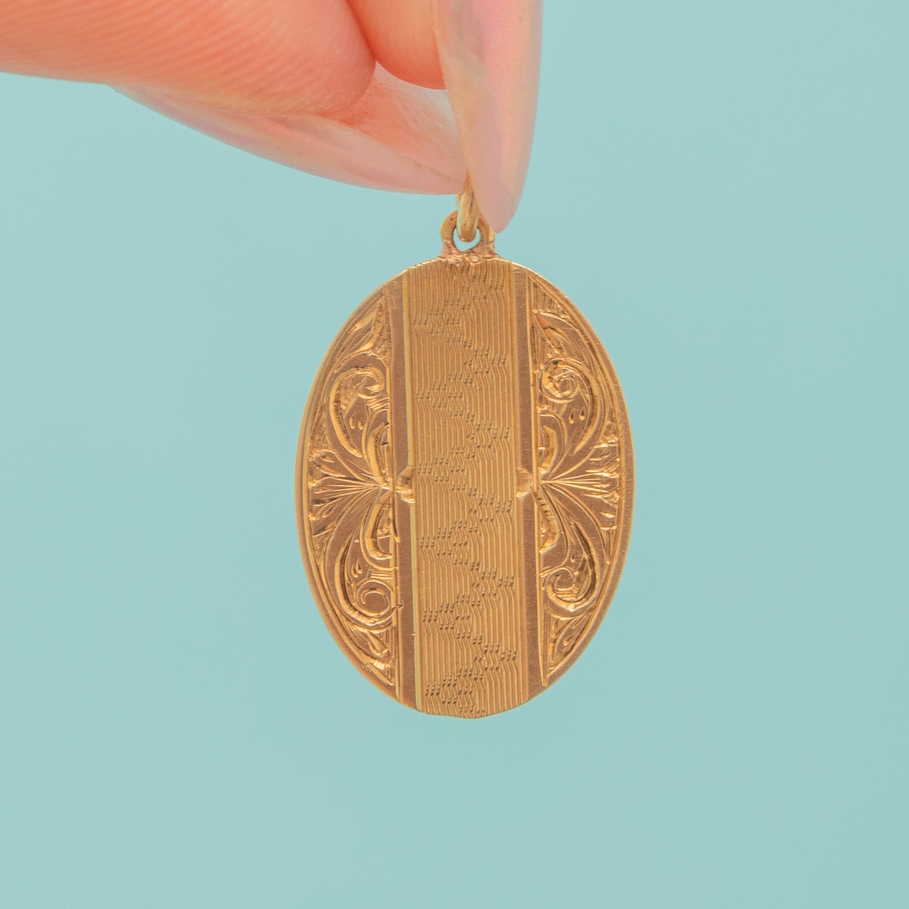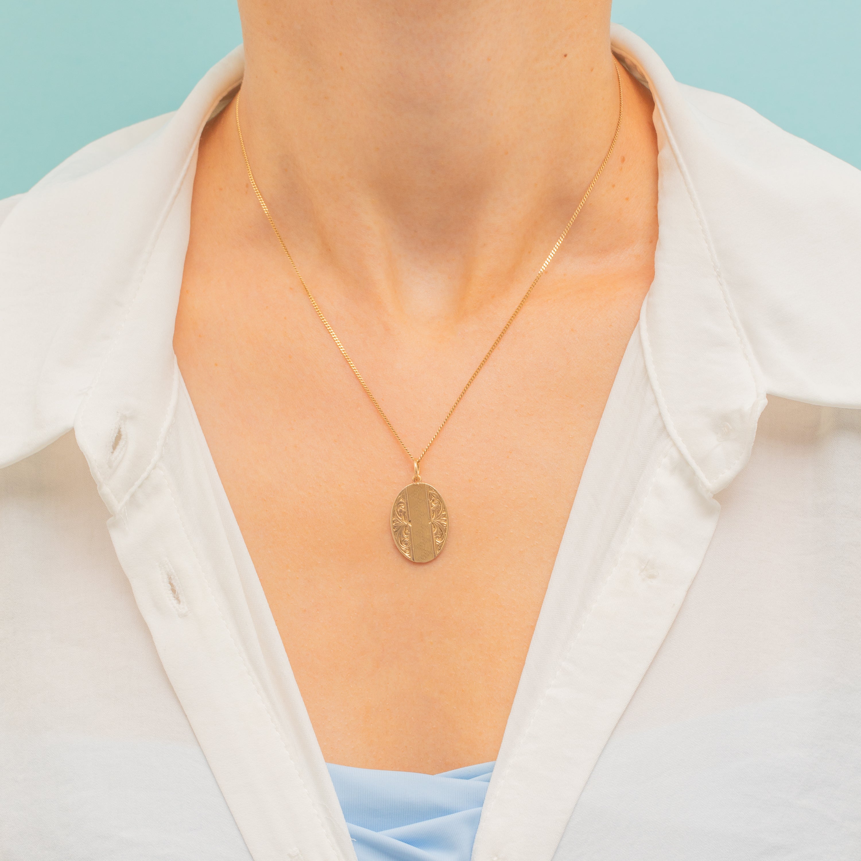 This Art Deco 9ct Gold oval engraved pendant is a slice of sunshine! Crafted from bright and buttery 9ct Gold, her front is adorned with ornate baroque-style engravings and a zig-zag design running through her centre.