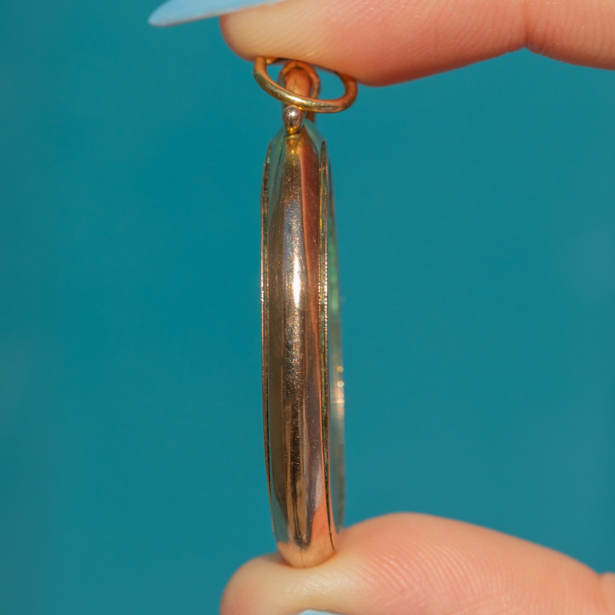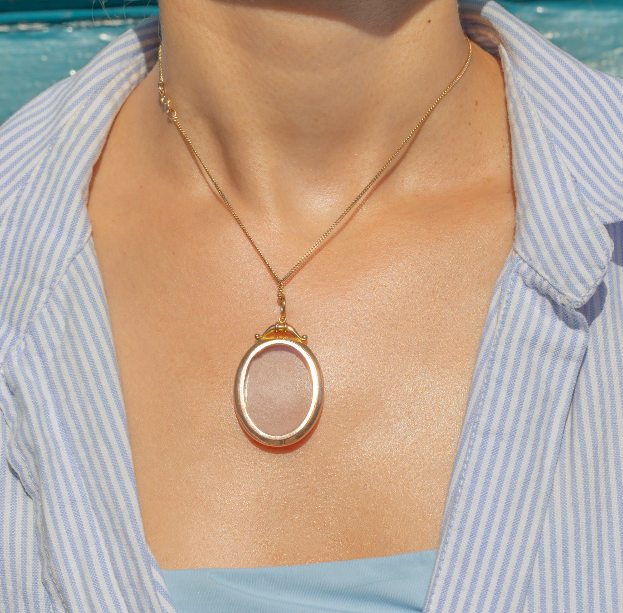 The solid 9ct Gold frame has developed a soft rosy hue over time, perfectly complementing the delicate, translucent glass. Complete with a decorative bale, this locket provides a lovely space for a cherished photograph to be displayed, or you can fill it with meaningful items like dried flowers, strands of hair, or other personal mementos.