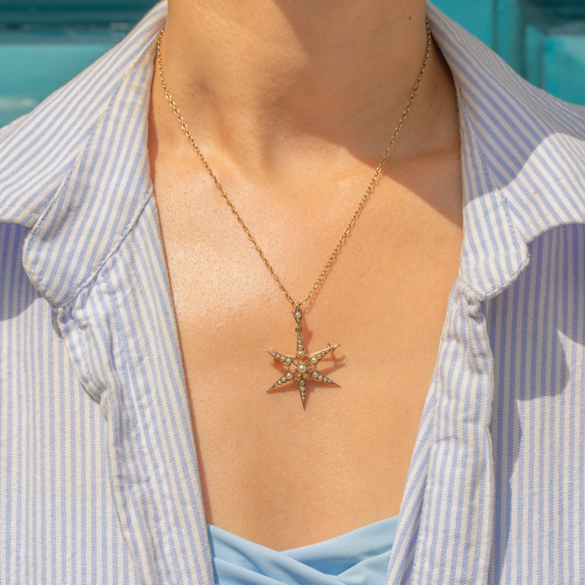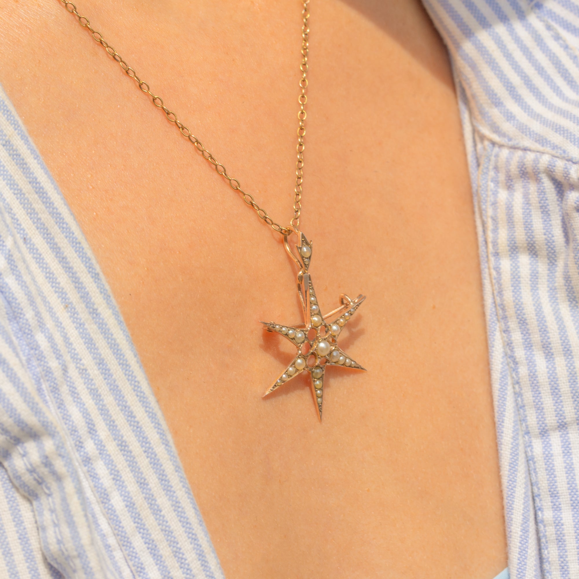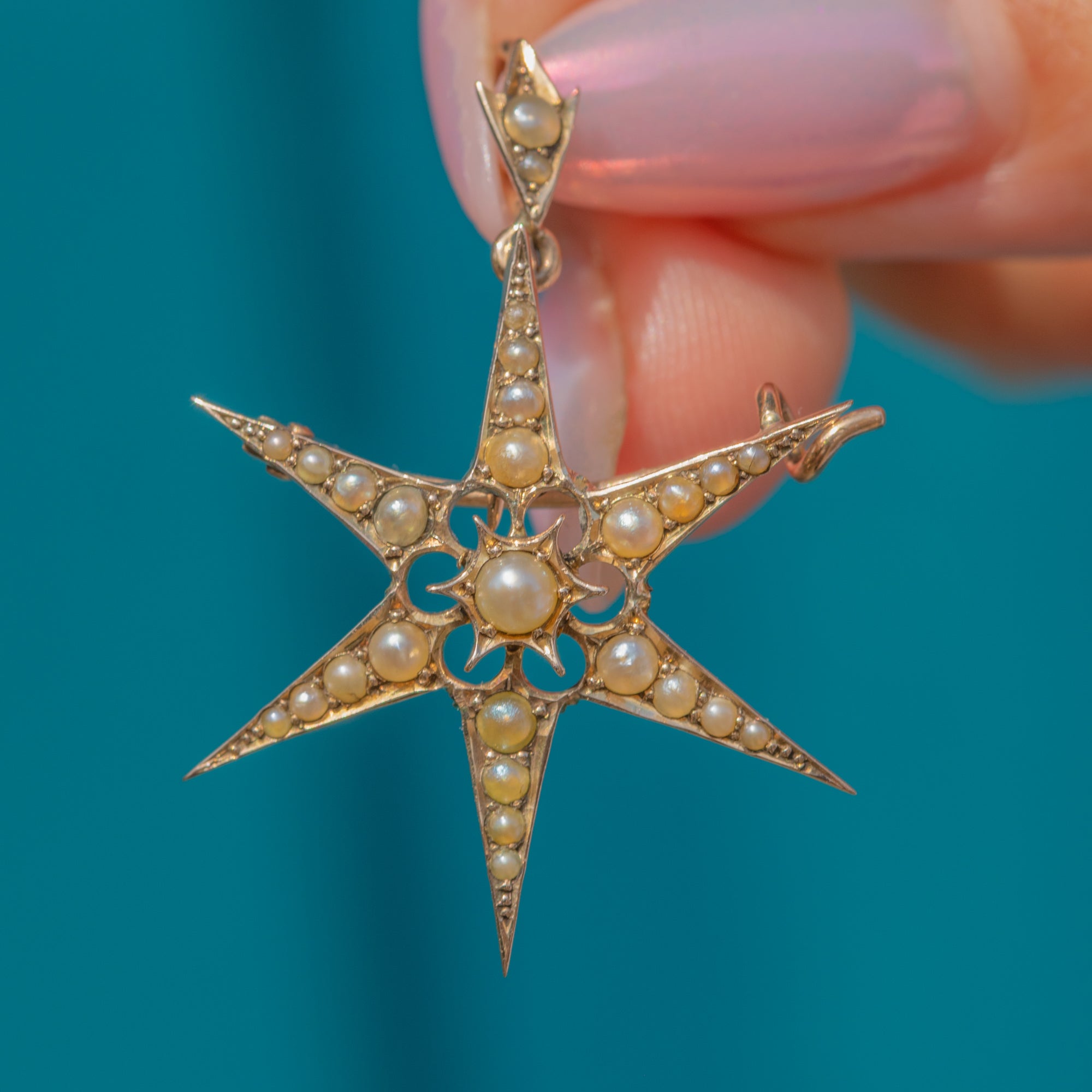 This gorgeous six-pointed star will add bundles of celestial charm to your outfit! Finely crafted from radiant 9ct Gold and studded with shimmering Pearls, this piece of Victorian jewellery can be worn as a pendant suspended from a chain or pinned to your lapel with use of the brooch fittings.