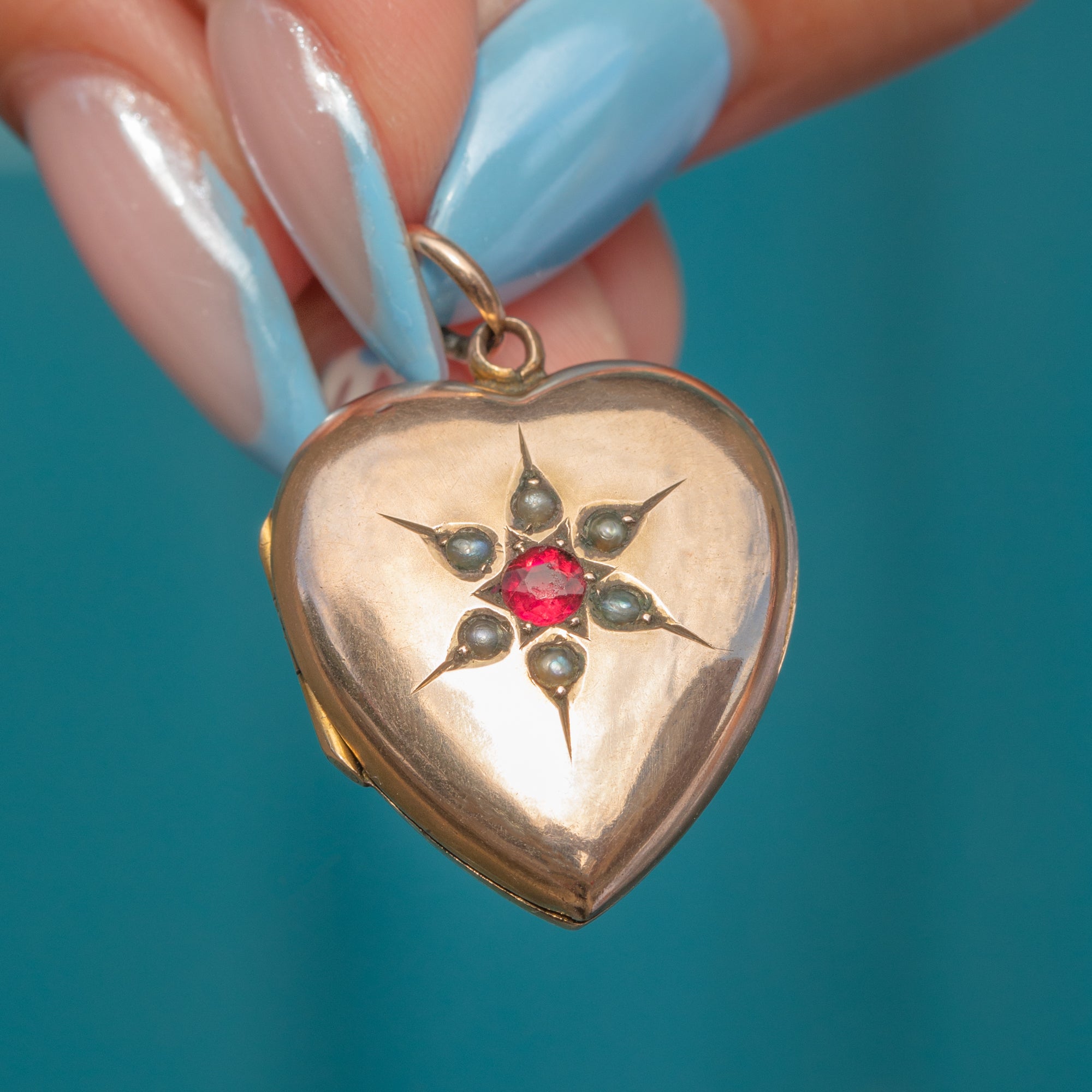 This Victorian heart locket is a sweet find! The locket has been inlaid with six Seed Pearls and a glace cherry red Paste, forming a starburst motif that is striking to look at!