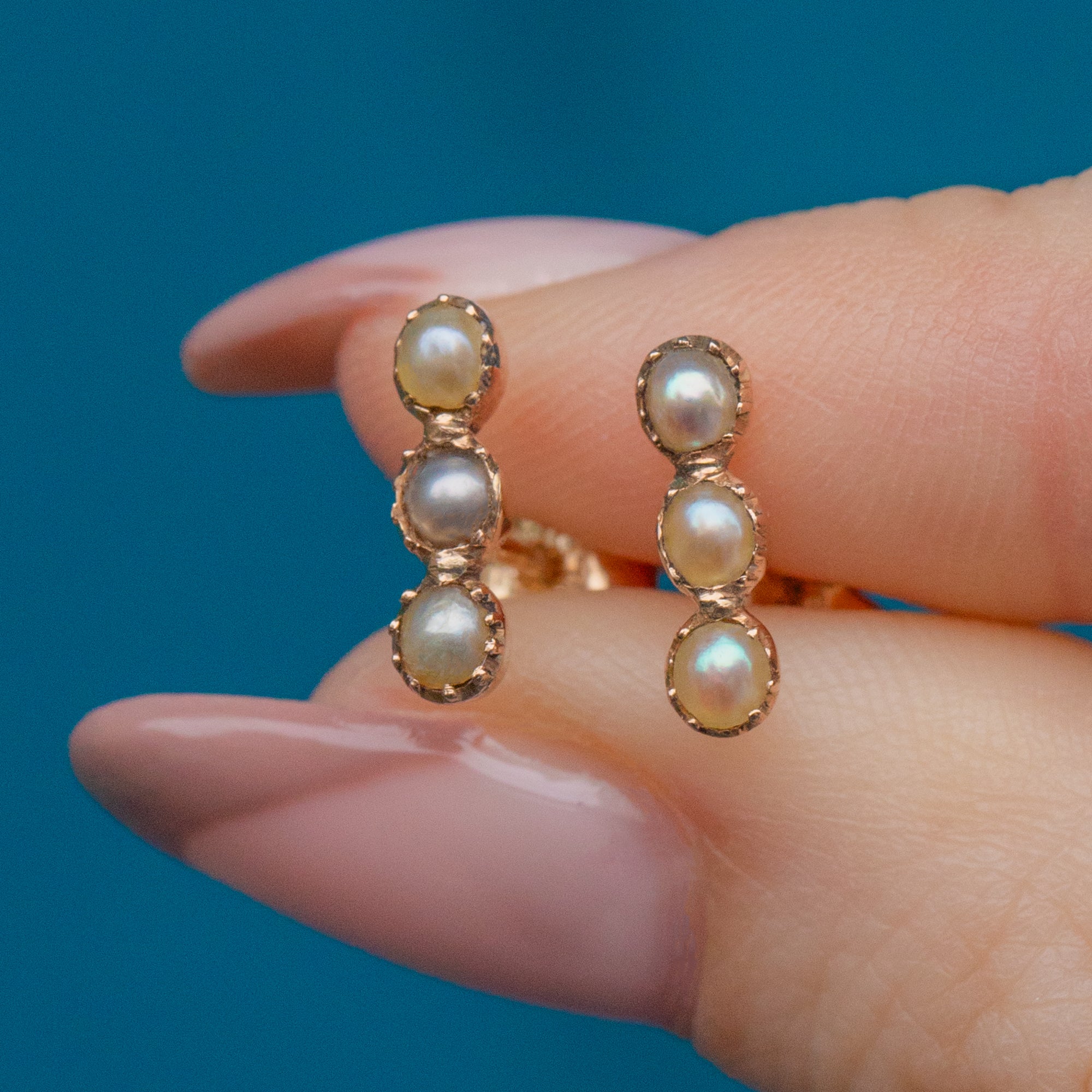 Each Victorian stud earring features three lustrous Pearls, each with a rich natural glow, set within buttery 9ct yellow Gold settings, creating a timeless and sophisticated pair.