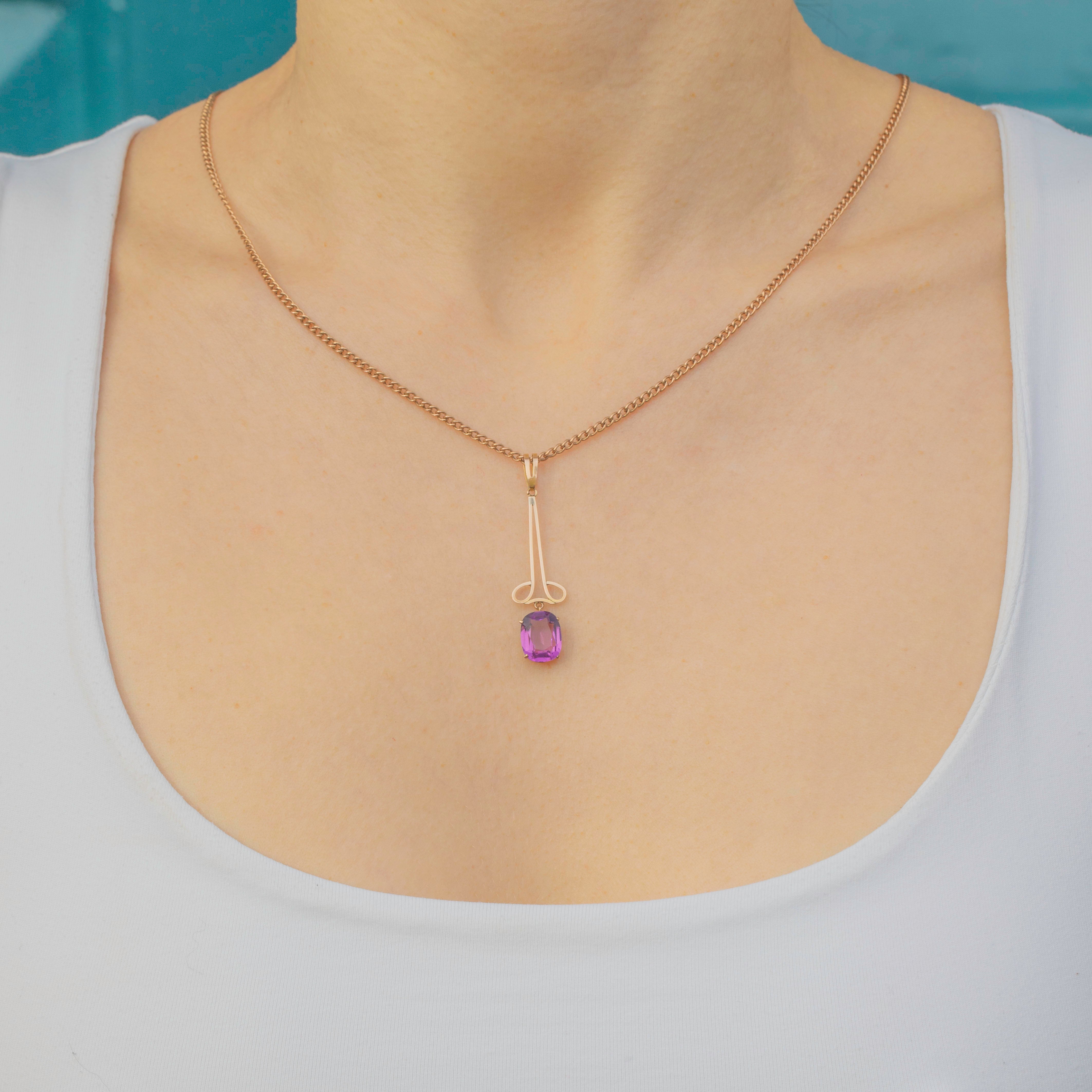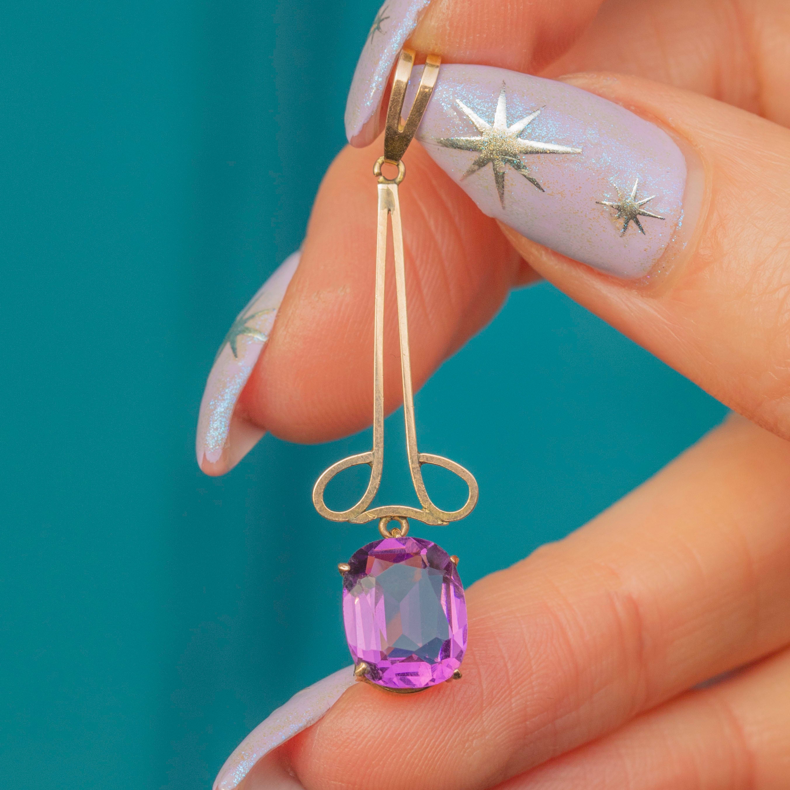 This antique 9ct Gold pink Amethyst drop pendant will look striking suspended from a skinny Gold chain across your décolletage! The 1.64ct Amethyst falls elegantly from the curvaceous Gold wirework, twinkling with gorgeous lilac hues as its crisp facets dance in the light.