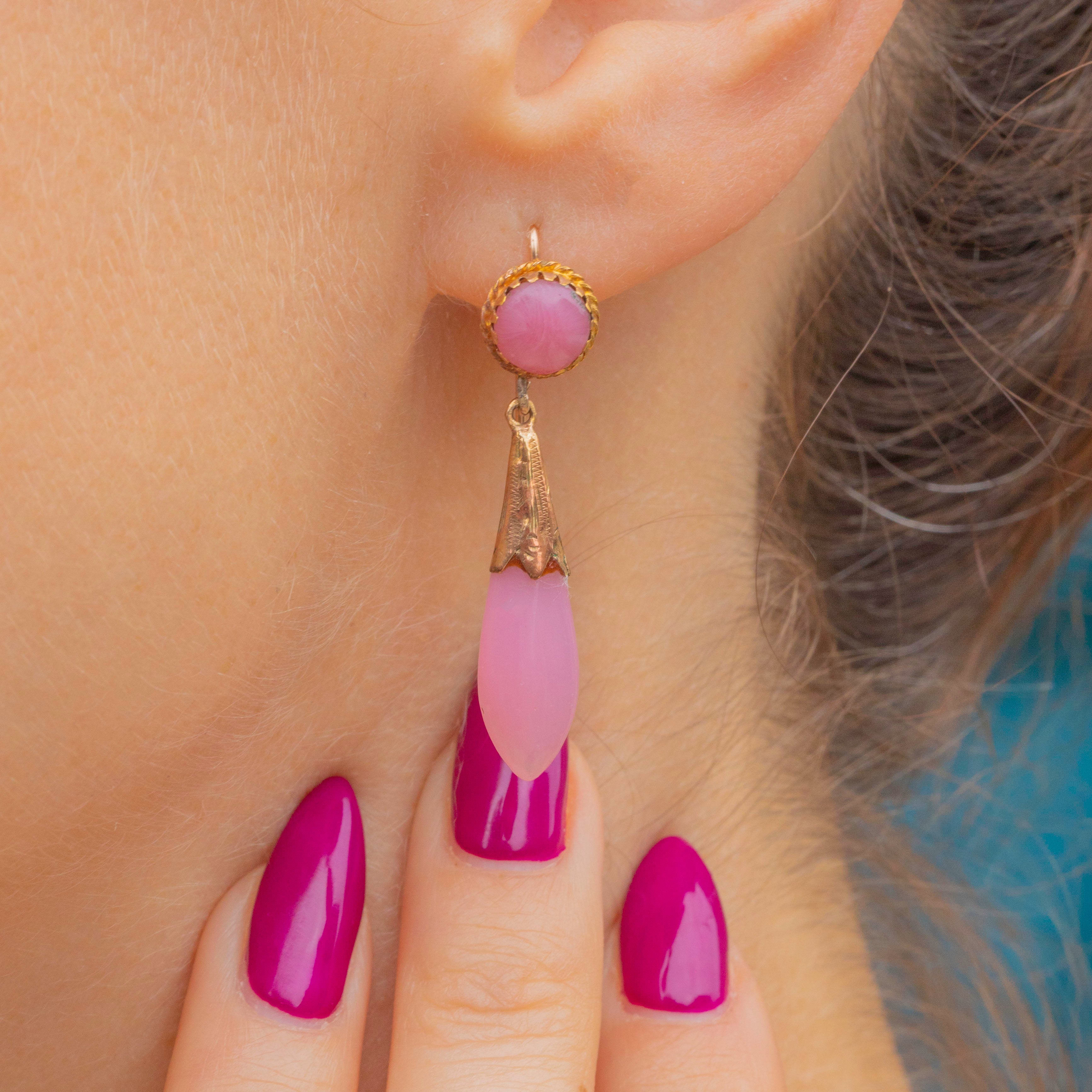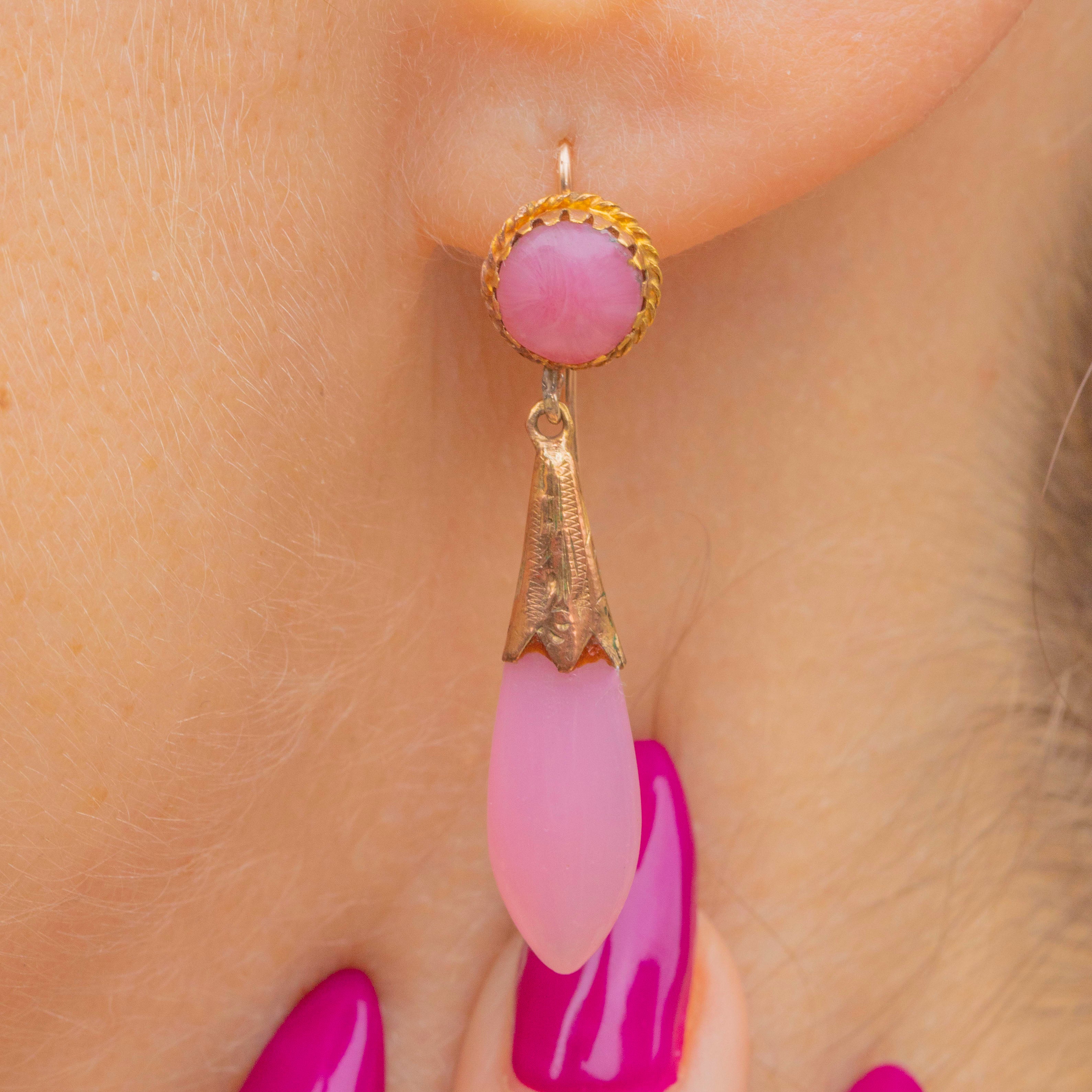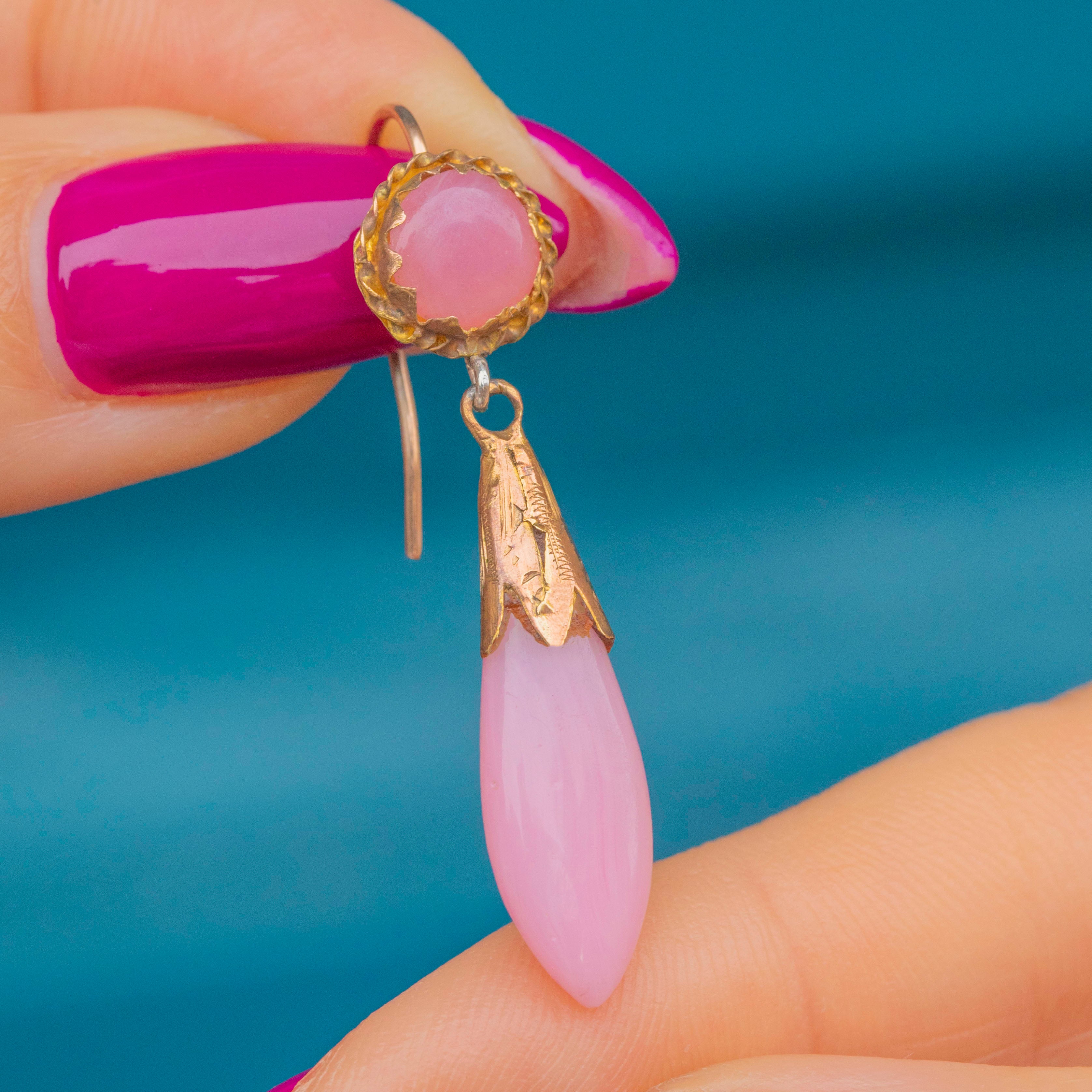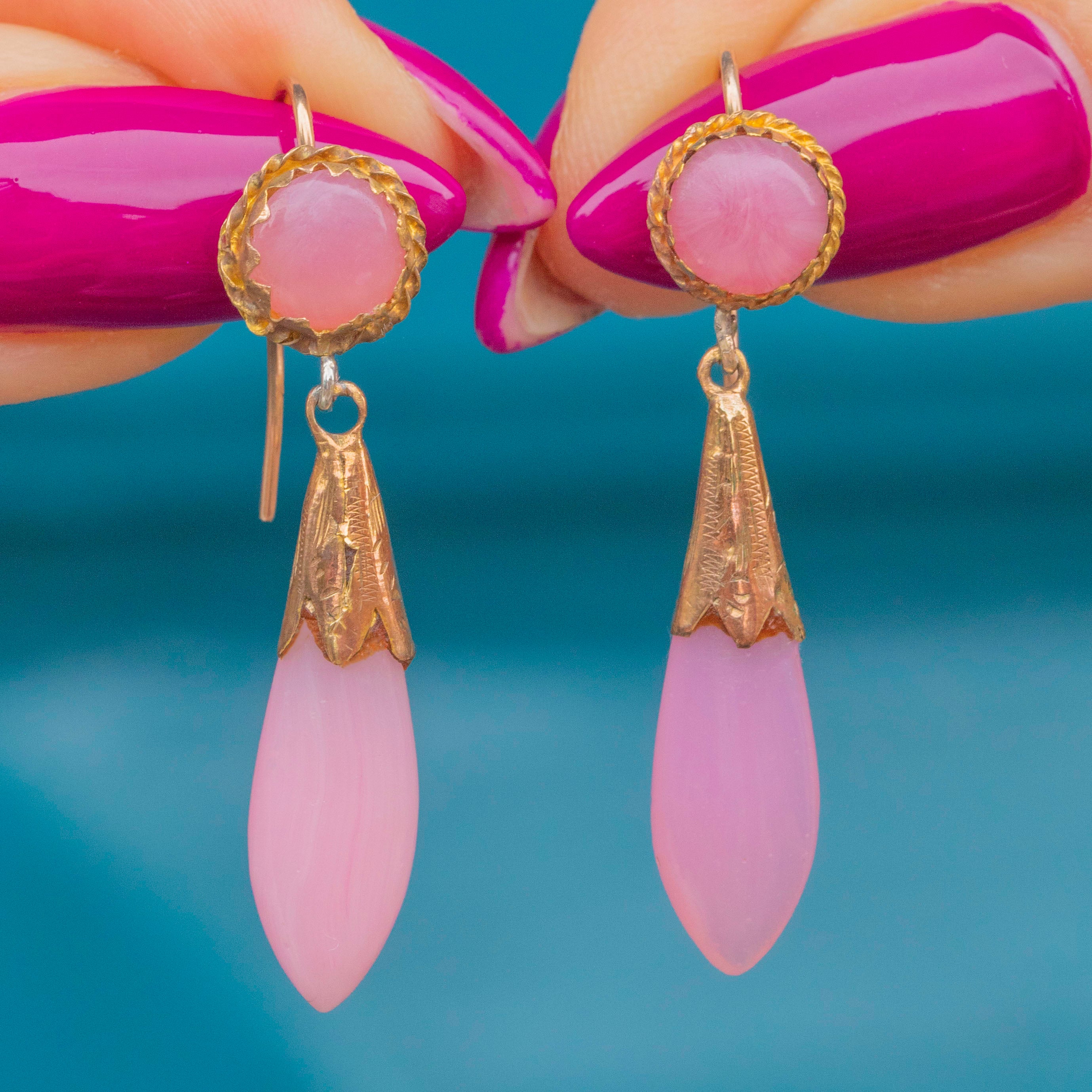 These Victorian earrings are undeniably feminine, boasting baby pink Venetian glass displayed within buttery 9ct Gold, with their articulated torpedo drops providing a lovely movement as they suspend from your lobes.