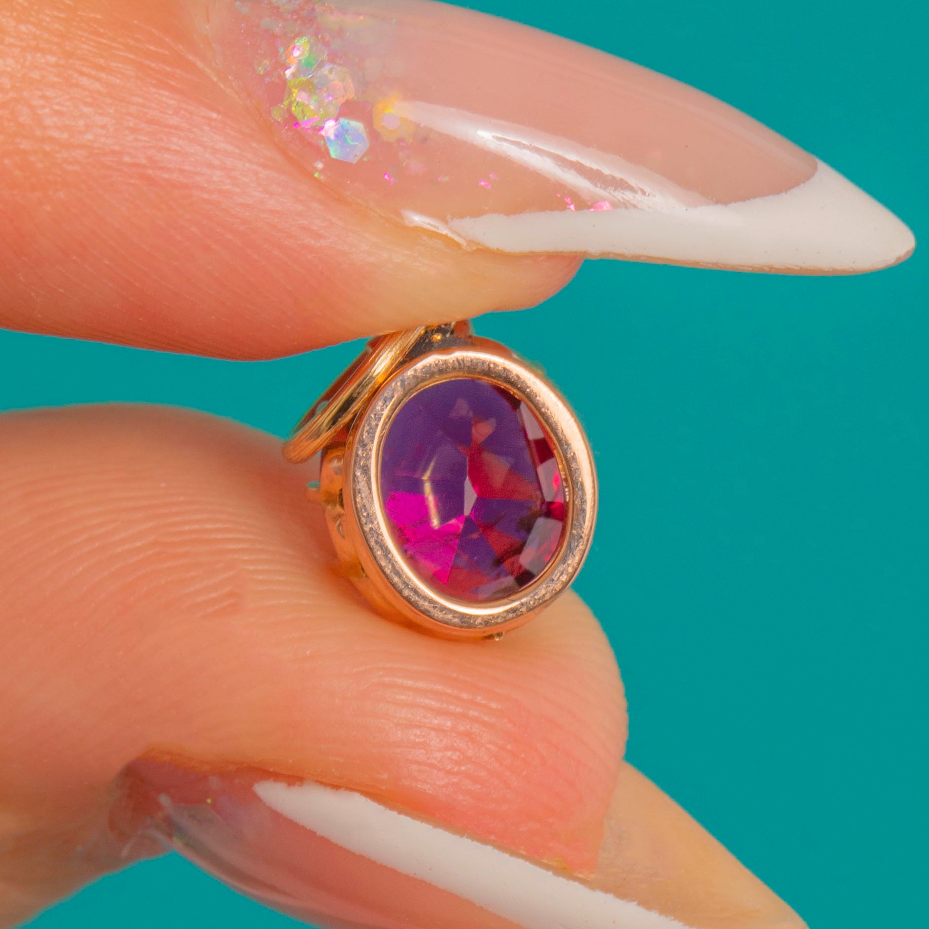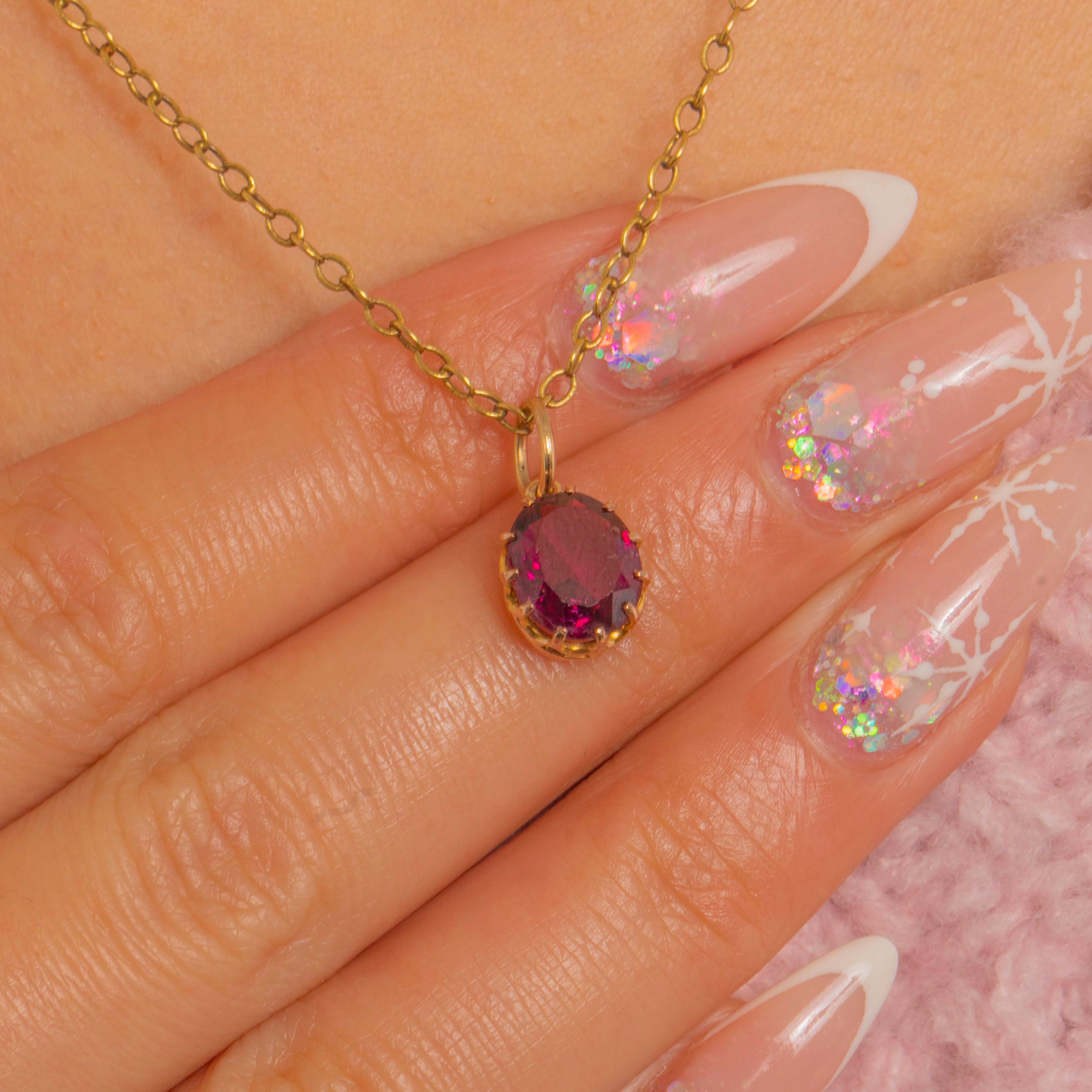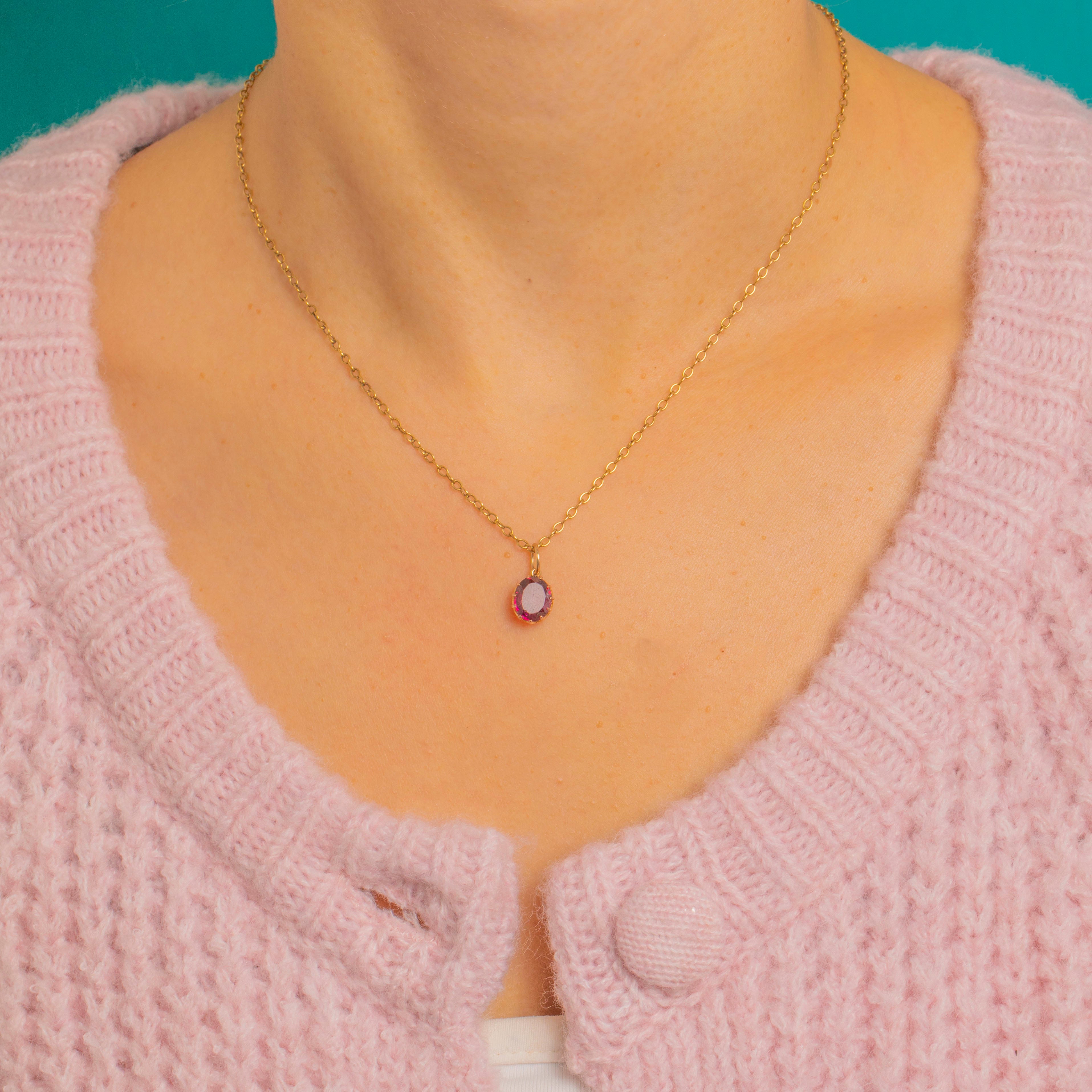 A dainty Victorian treasure, this petite charm showcases an oval faceted Rhodolite Garnet glowing with rich raspberry-pink to purple tones. The gemstone’s lively colour is beautifully complemented by warm 9ct Gold, with a neat, refined claw setting and a simple jump ring for effortless styling.