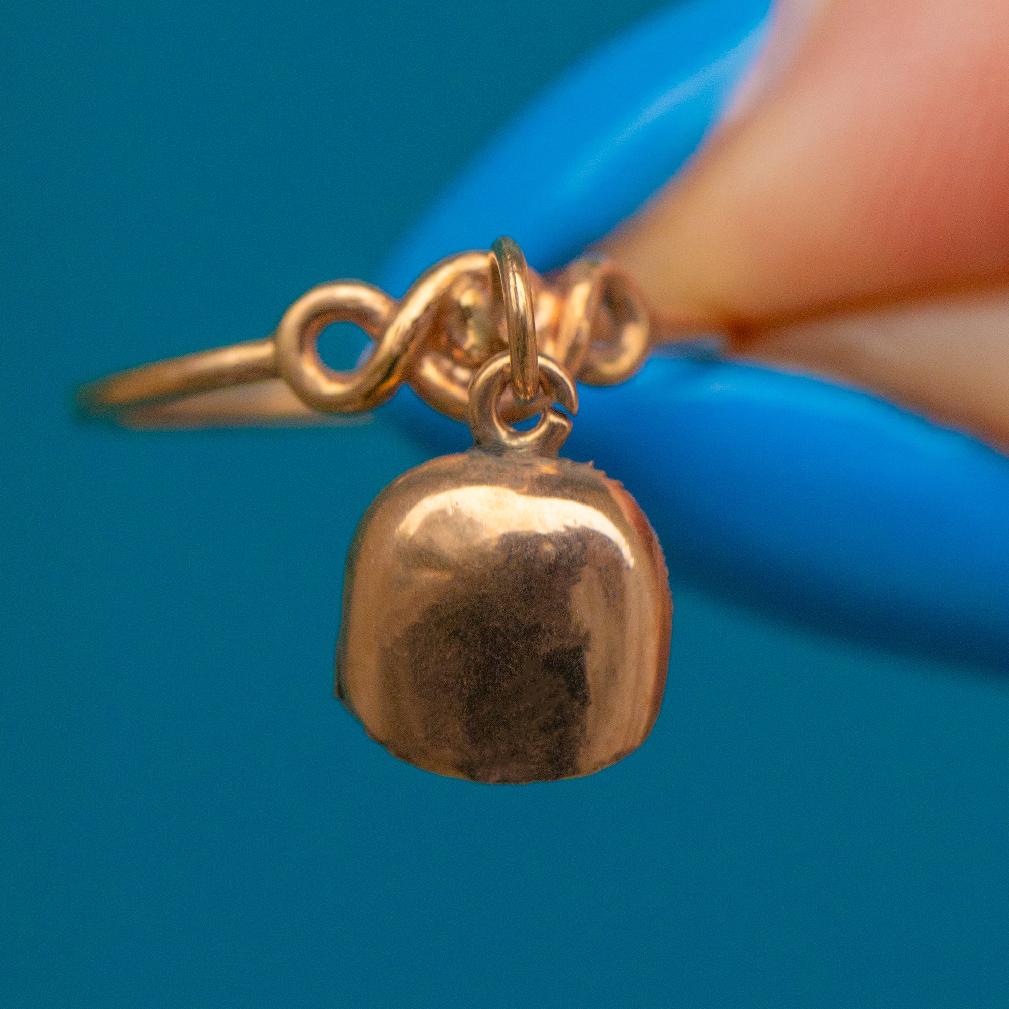 EXCELLENT. This antique 9ct Gold ring is in excellent condition, which is no mean feat when considering her grand age! The Gold is buttery and the band has retained its form well over the years. The engraved details have remained defined, with only some light dings on the back of the bell noticeable under close scrutiny. The bell still works, providing a playful touch to this antique Gold ring.