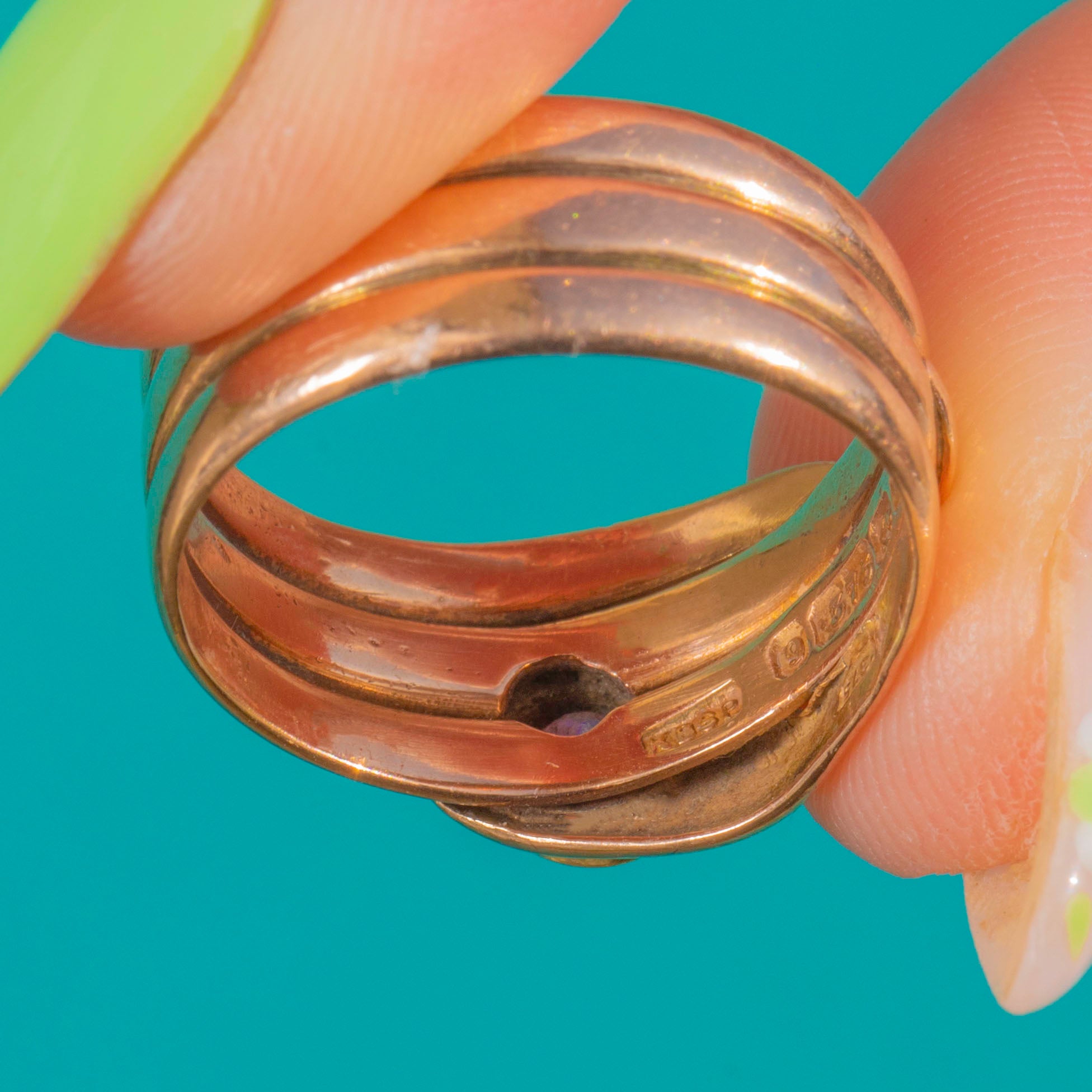 A sinuous 9ct Gold snake ring with a bold triple-coil shank, crowned by a bezel-set Ruby in the serpent’s head. The warm Gold and sculptural wrap-around silhouette give this piece wonderful presence on the hand.