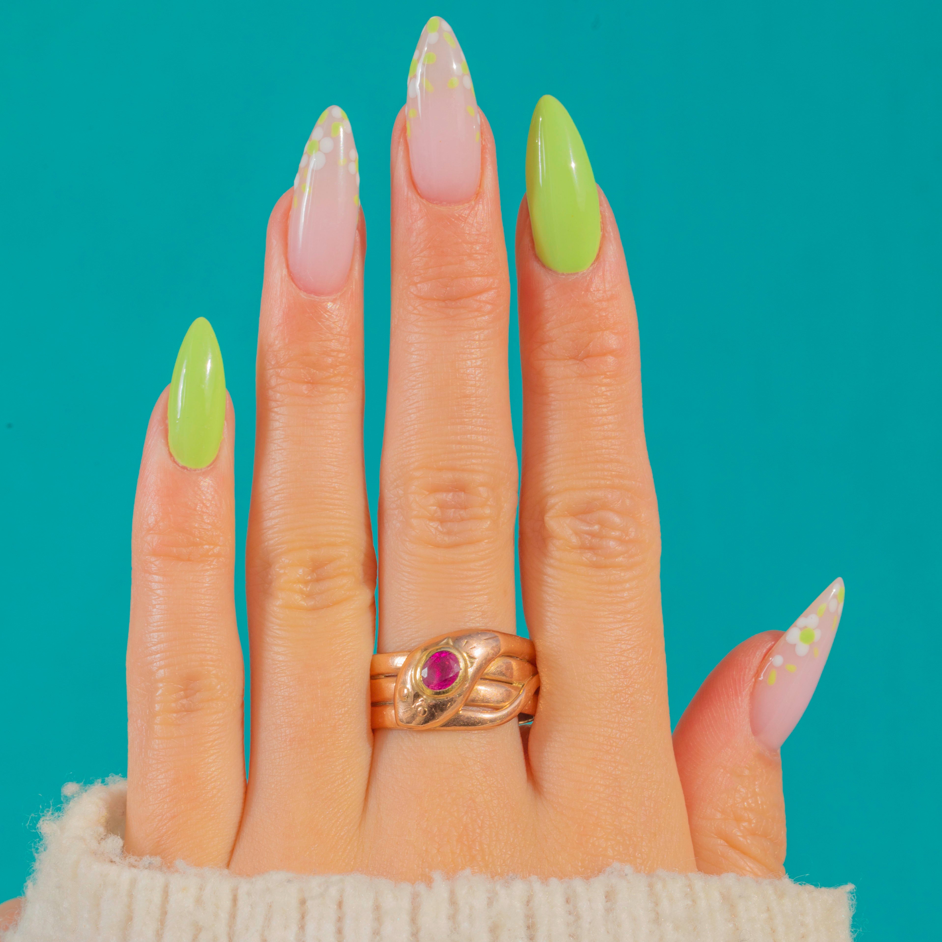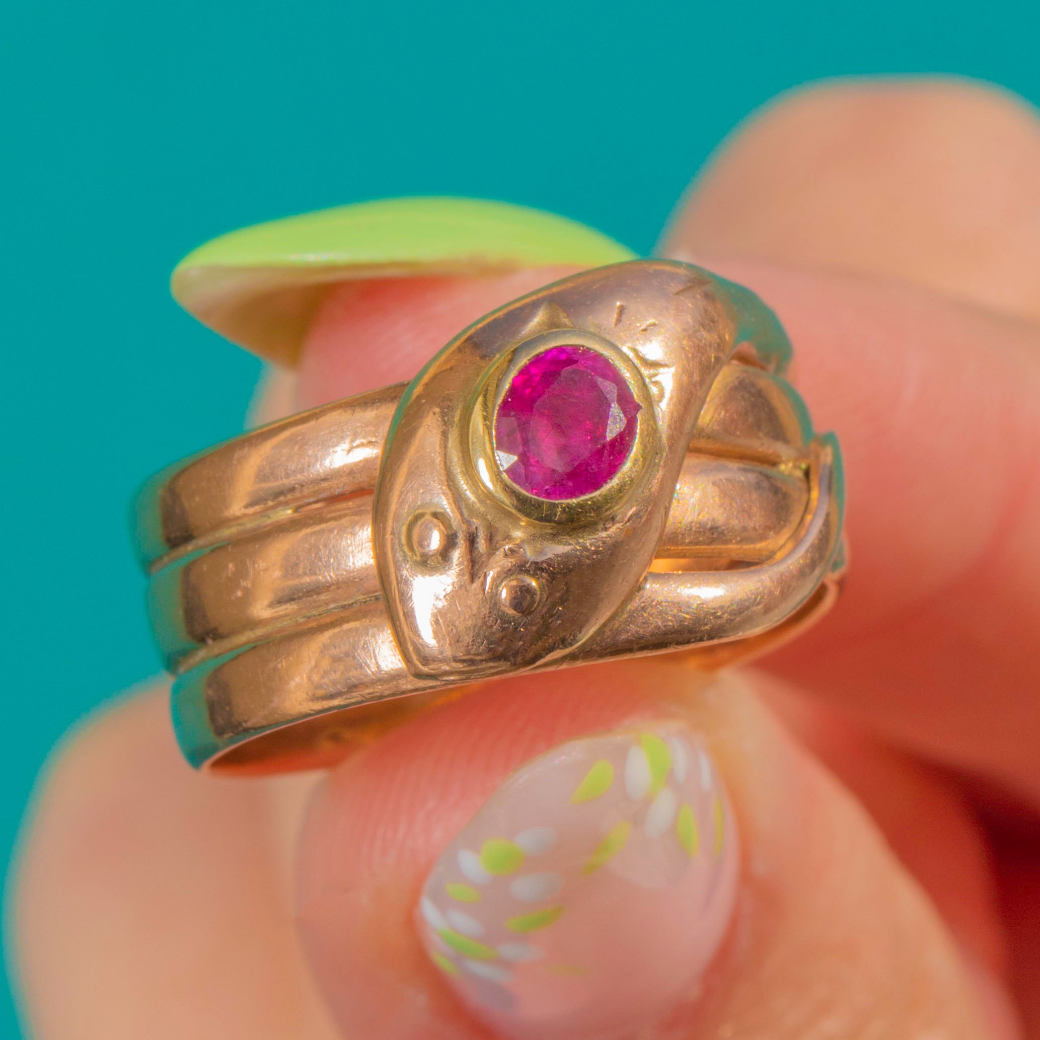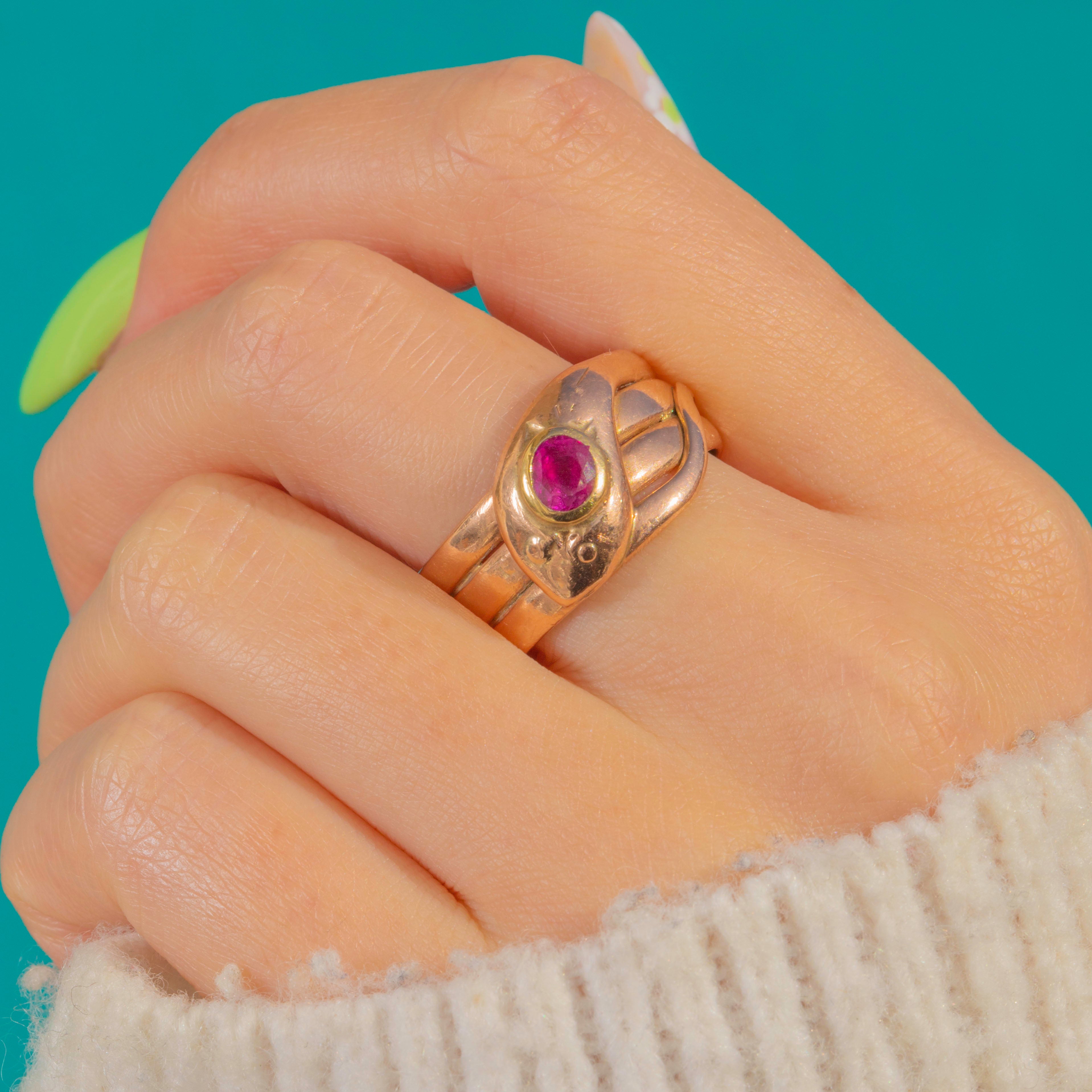 Hallmarked for Birmingham 1919, this design nods to the Victorian love of serpentine jewels, with subtle engraved details and dot “eyes” adding character. The pink-red Ruby glows beautifully against the Gold, while the softly aged patina enhances its antique charm.