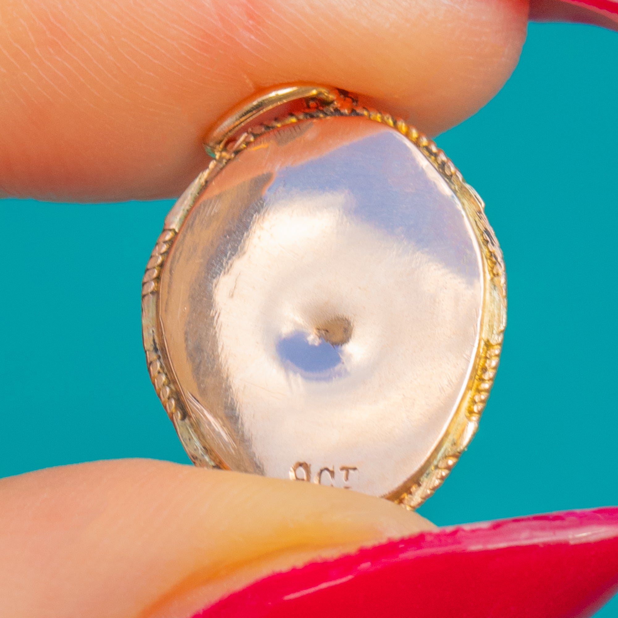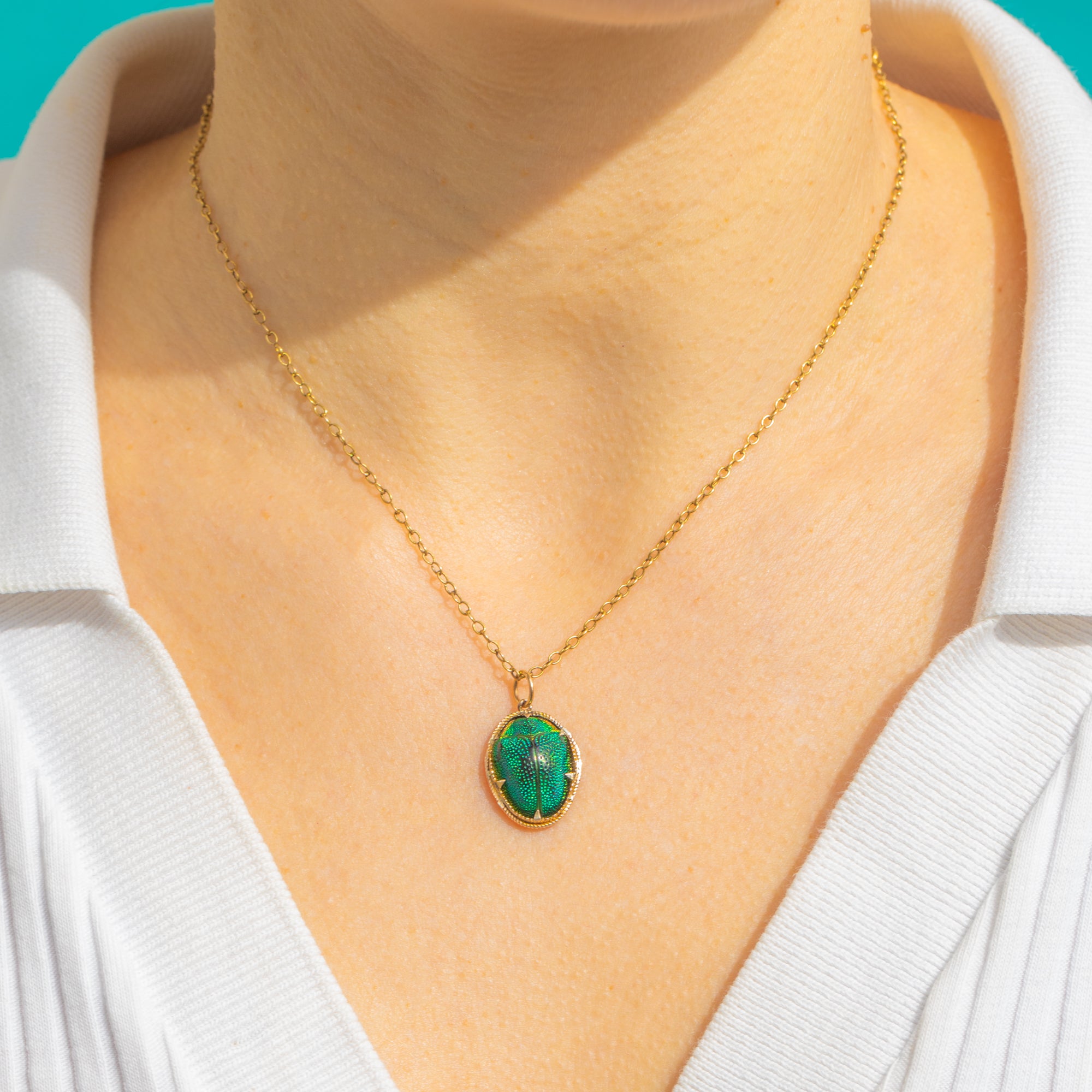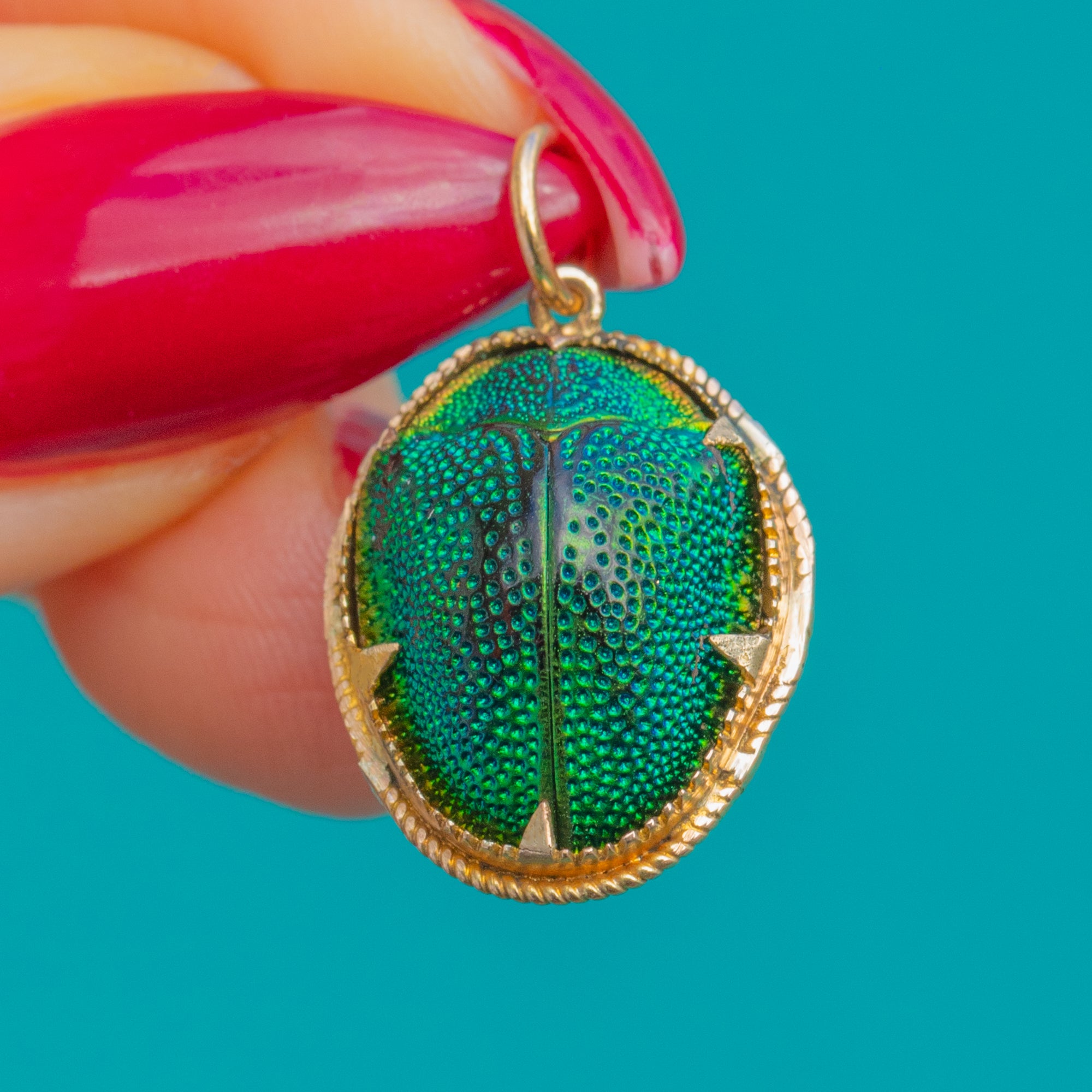 Dazzling with peacock-green and teal iridescence, this Victorian 9ct Gold scarab charm captures the era’s fascination with the natural world. The domed oval Scarab Beetle wing glows with shifting colour, framed by a finely detailed rope-edge bezel and held securely by neat triangular prongs over a closed back.