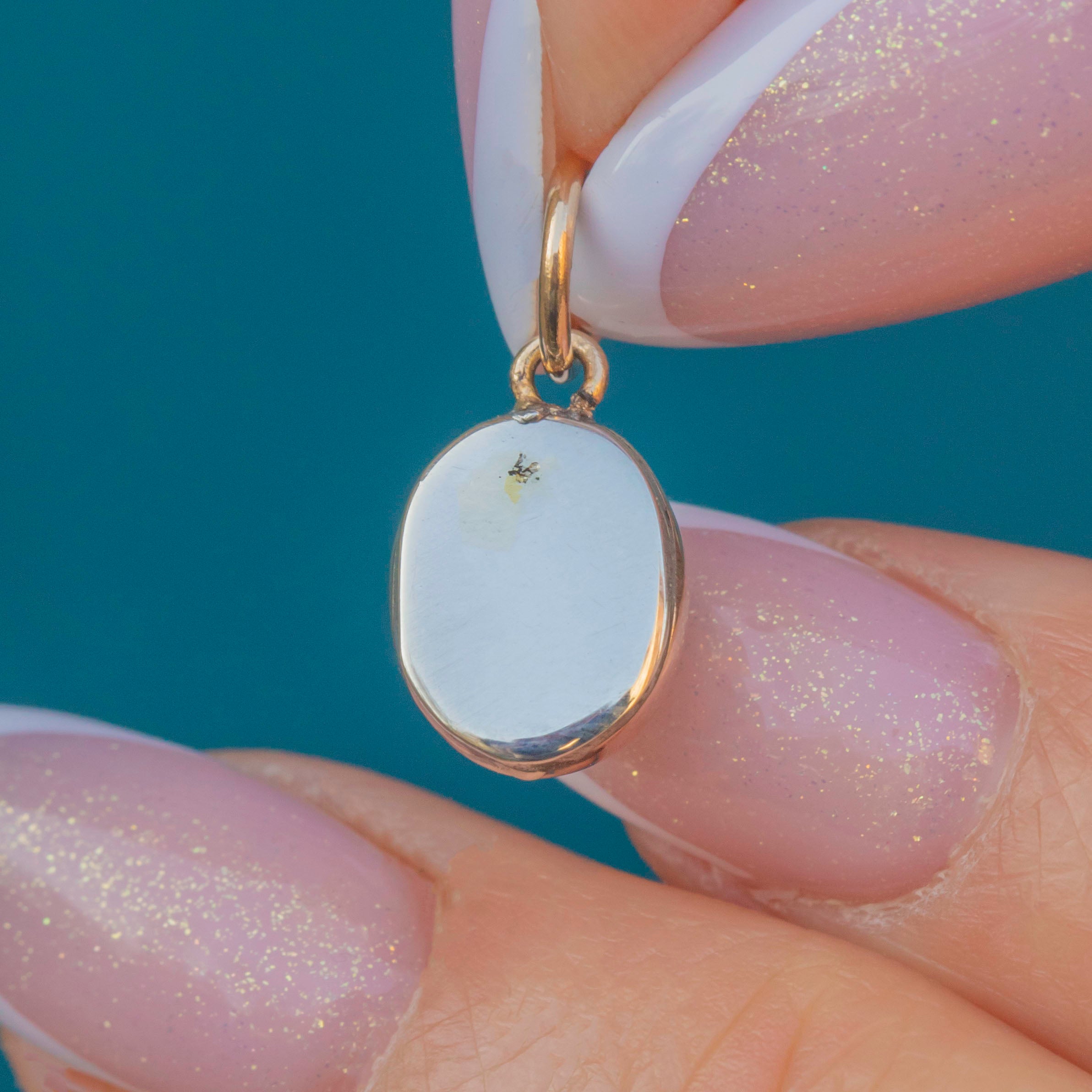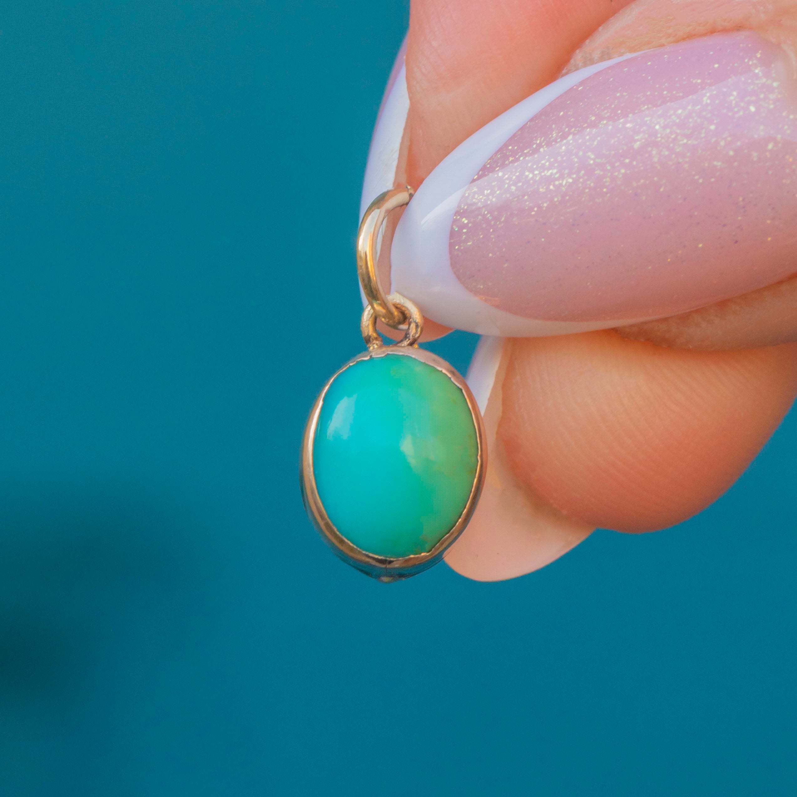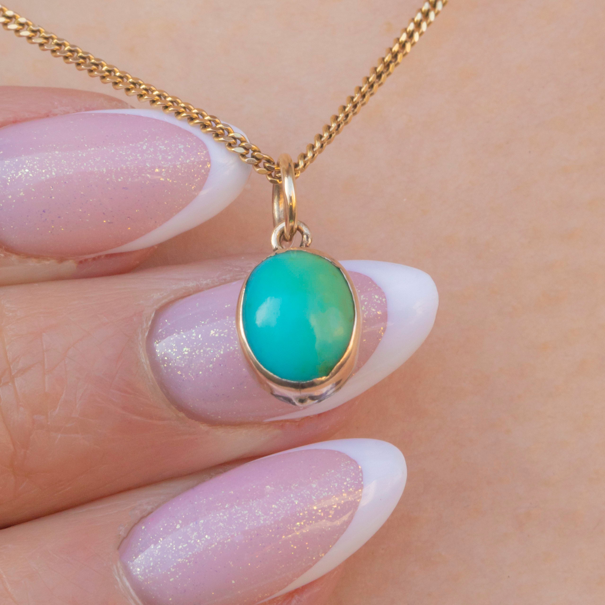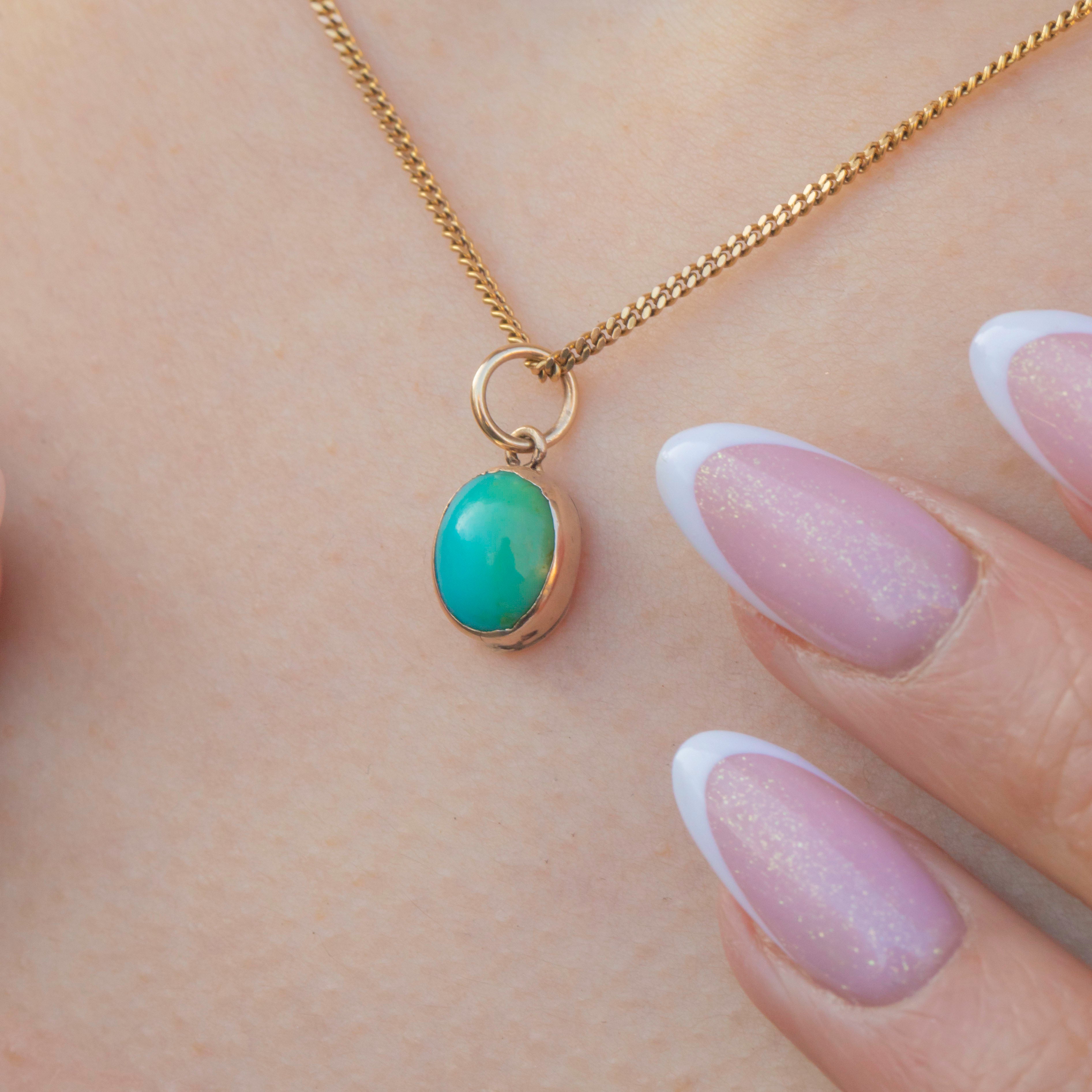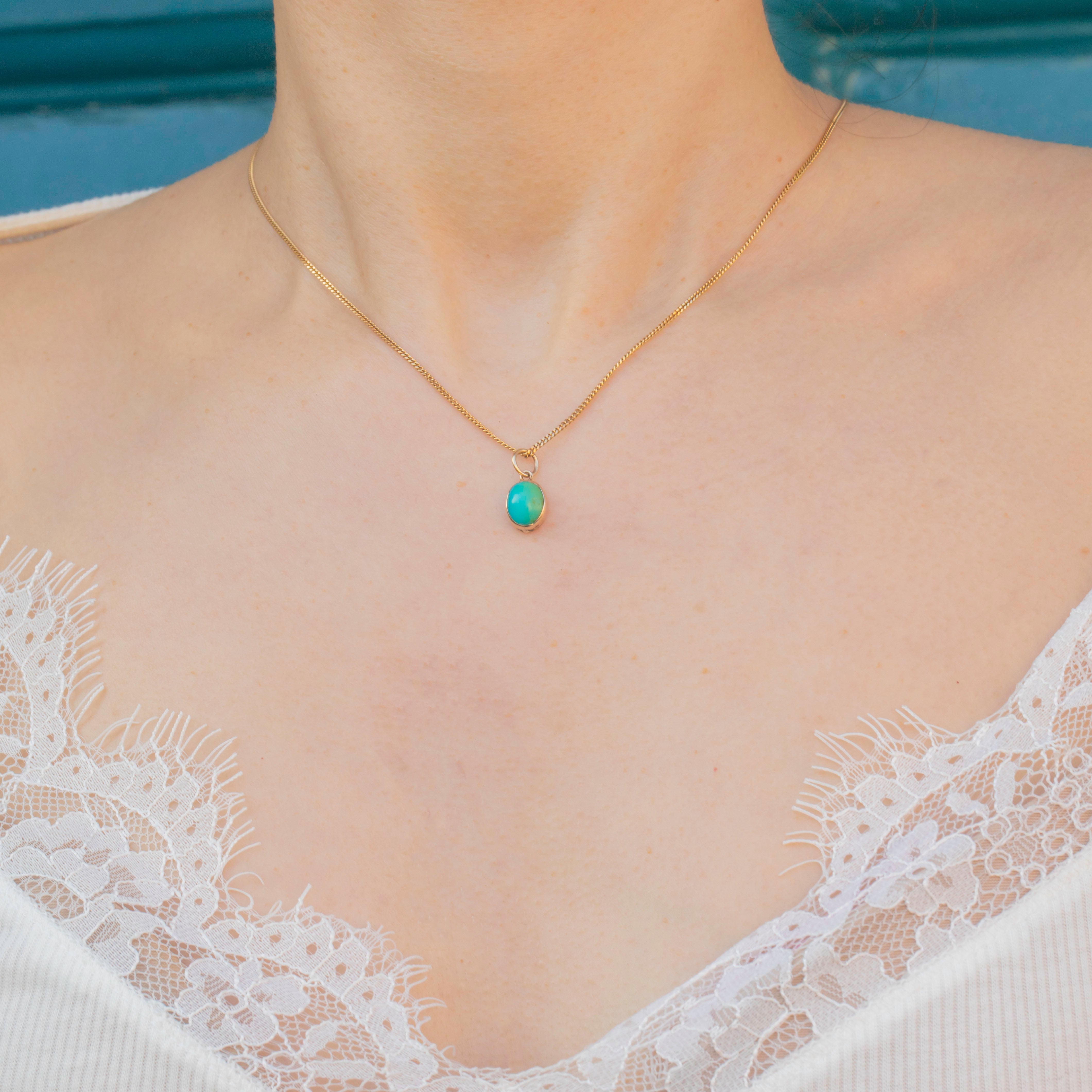 This antique 9ct Gold Turquoise cabochon charm will add a vibrant pop of colour to your décolleatge! The smoothly domed Turquoise cabochon has a gorgeous saturation, with a bright blue hue that gently transitions into green, adding to its antique charm.