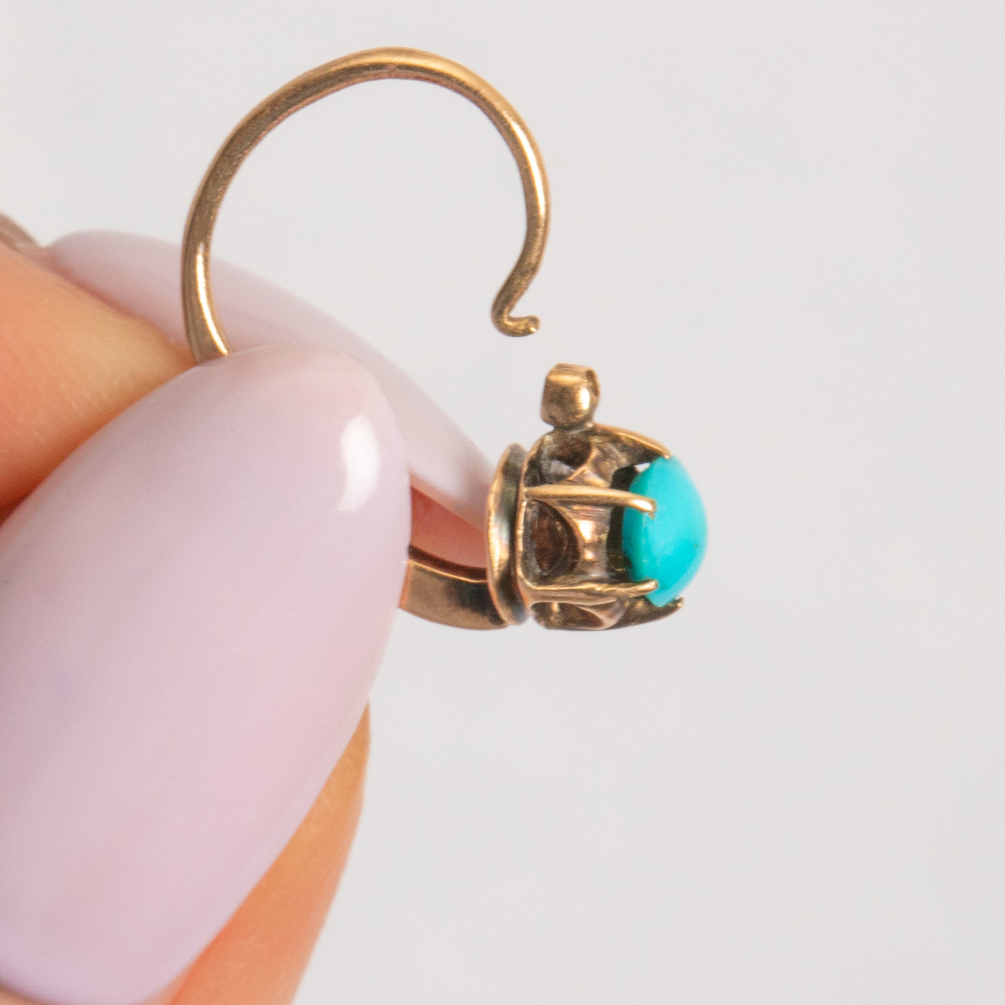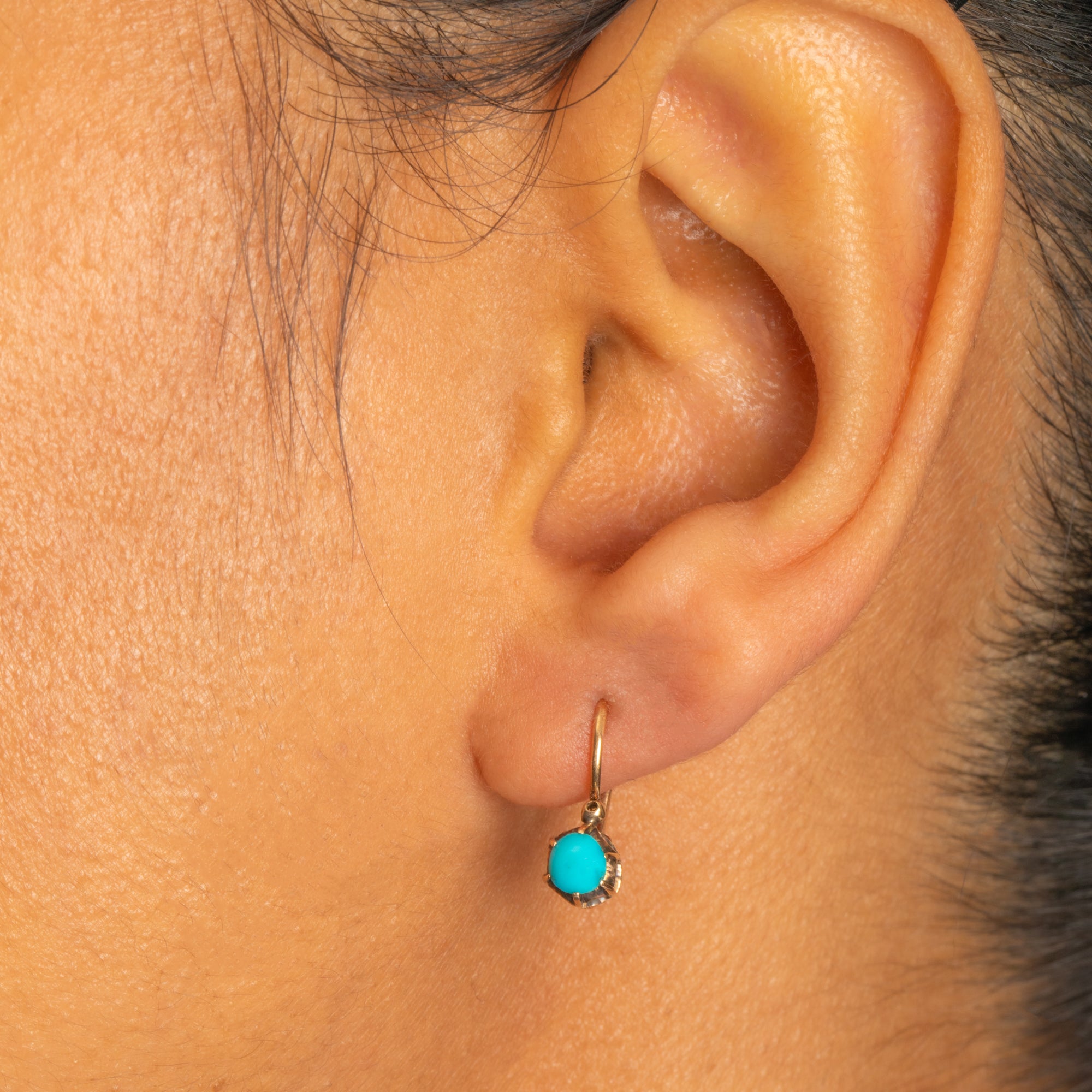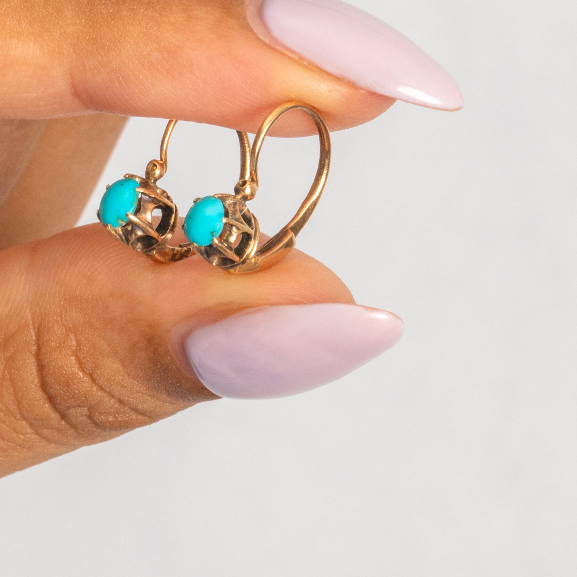 Add a pop of colour to your lobes with these sweet antique 9ct Gold Turquoise lever-back earrings! Exuding Victorian splendour, each duck-egg blue Turquoise cabochon is proudly displayed within buttery 9ct Gold claws.