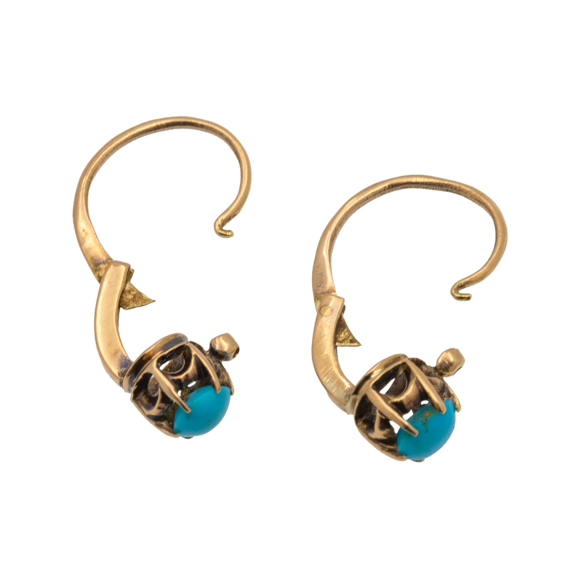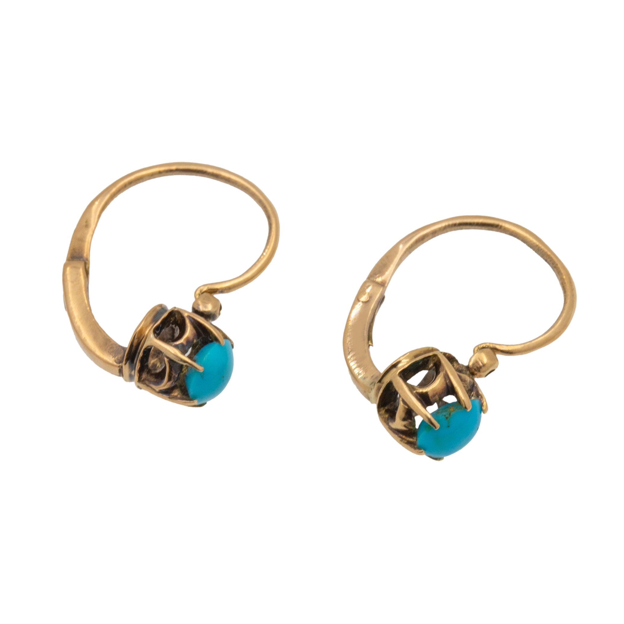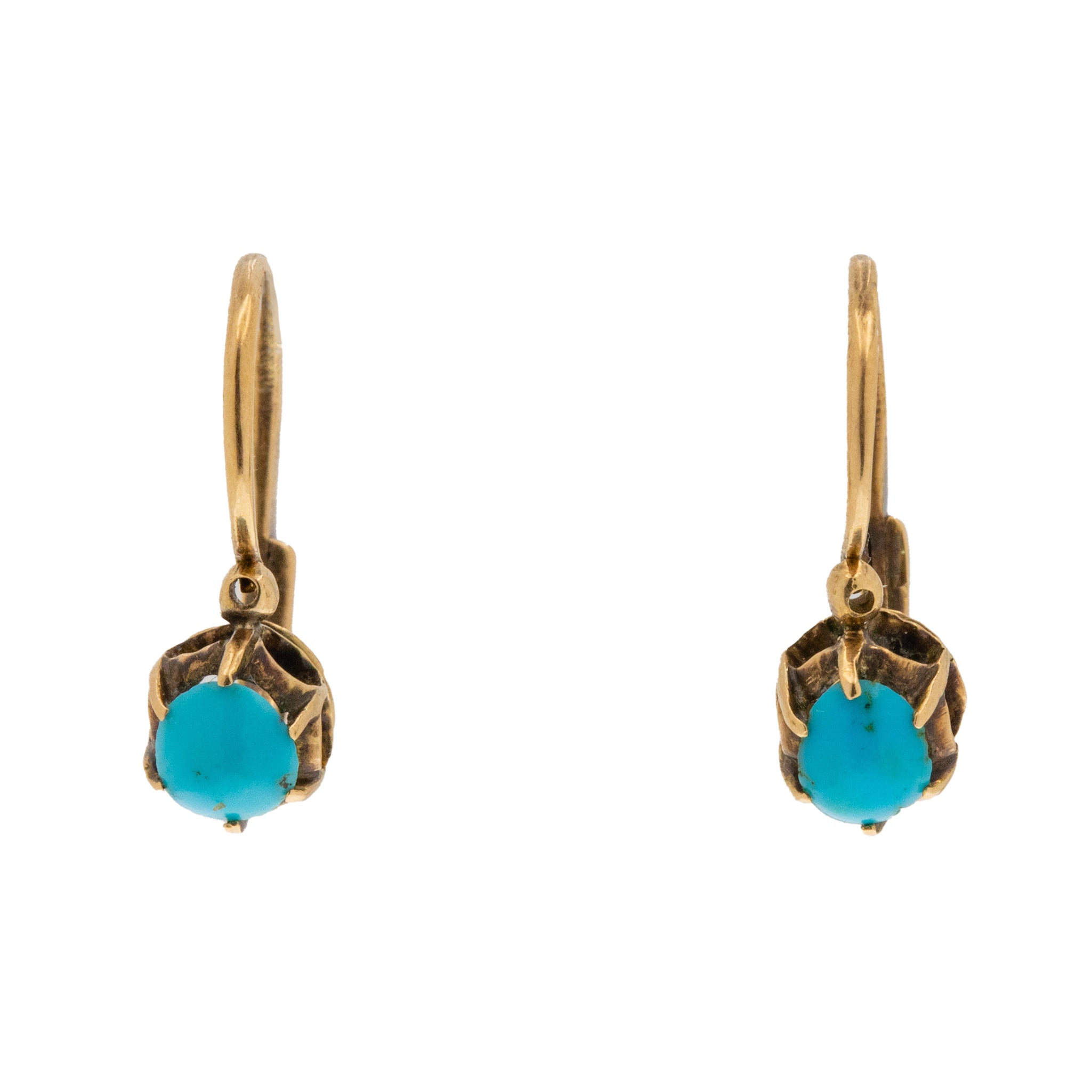 VERY GOOD TO EXCELLENT. These antique 9ct Gold Turquoise lever-back earrings are in fabulous condition. The Turquoise cabochons are smooth with vibrant hues, each one free from chips and securely held within their claws. The Gold is buttery with some darkening on the back of the earrings, but this cannot be seen while the earrings are worn. The lever-backs provide a safe and smooth closure, allowing you to wear these earrings with confidence!