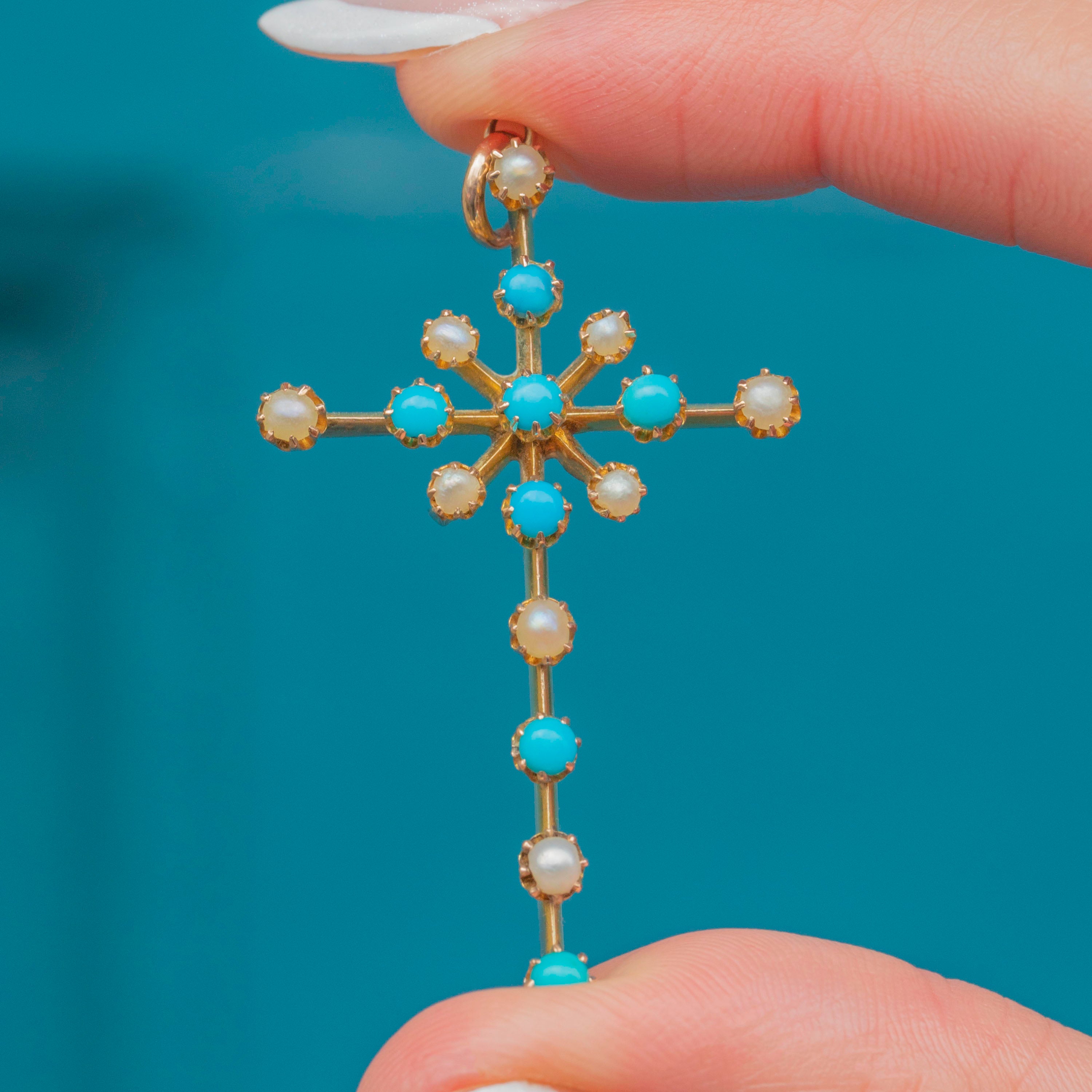 VERY GOOD: This antique 9ct Gold Turquoise Pearl cross pendant is in very good condition. The gemstones are all present, and although some of the claws have worn or misshapen slightly, they all remain securely set. The Gold is buttery with only minor evidence on the back from a previous repair. The cross has held its form well, promising many more years of wear and enjoyment!