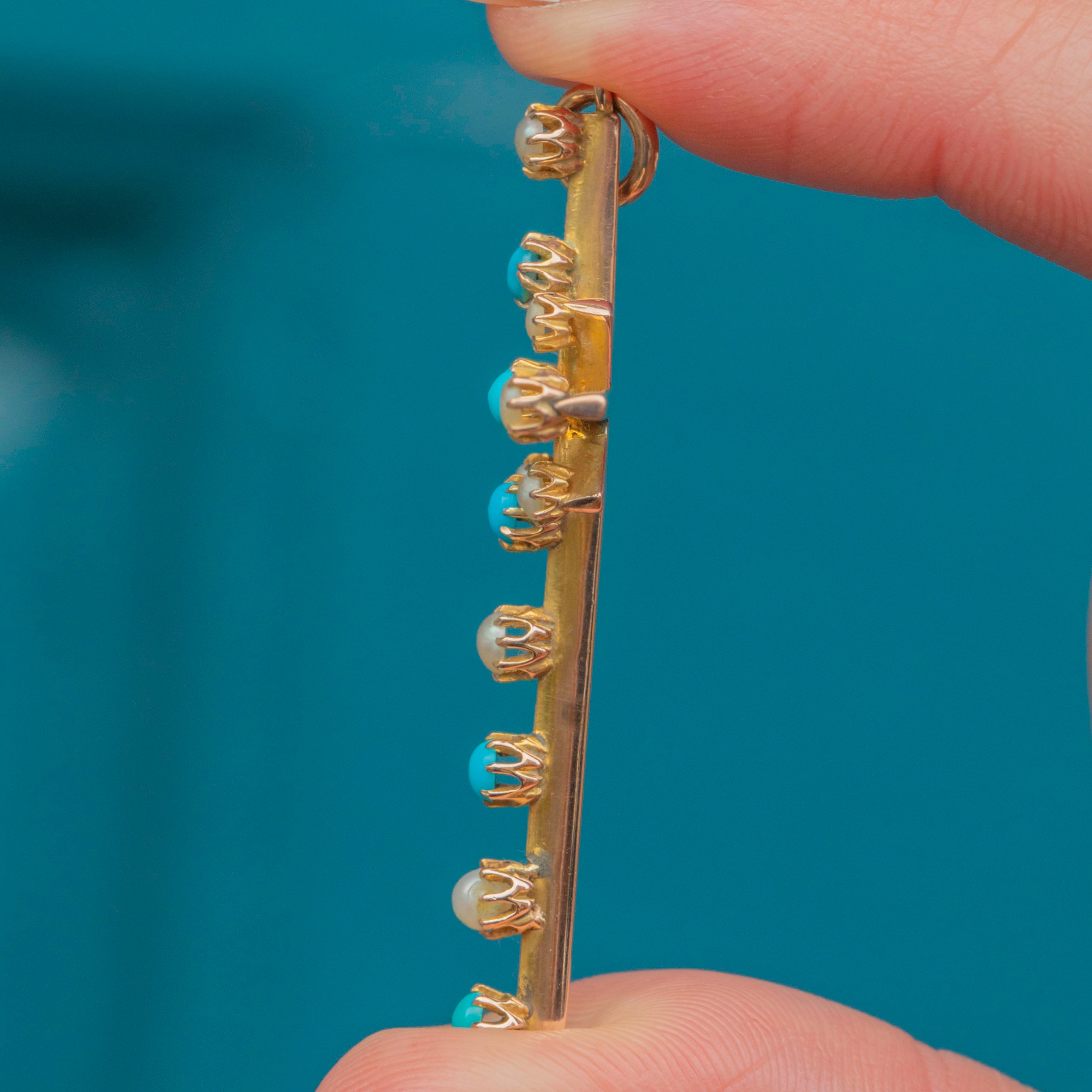 This antique 9ct Gold Turquoise Pearl cross pendant is an eye-catching piece! The striking cross design displays vibrant sky-blue Turquoise cabochons and crisp white Pearls, creating an elegant colour palette.