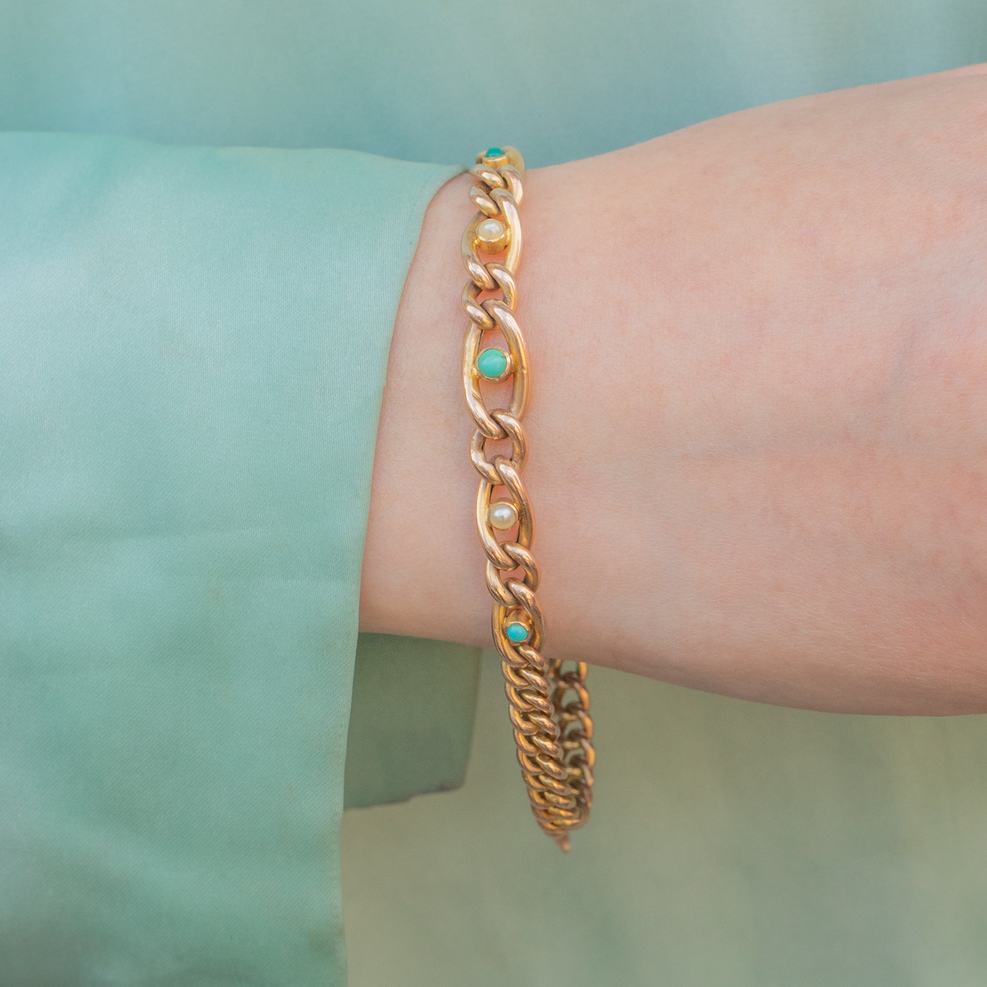 Antique 9ct Gold Turquoise Pearl Curb Link Bracelet