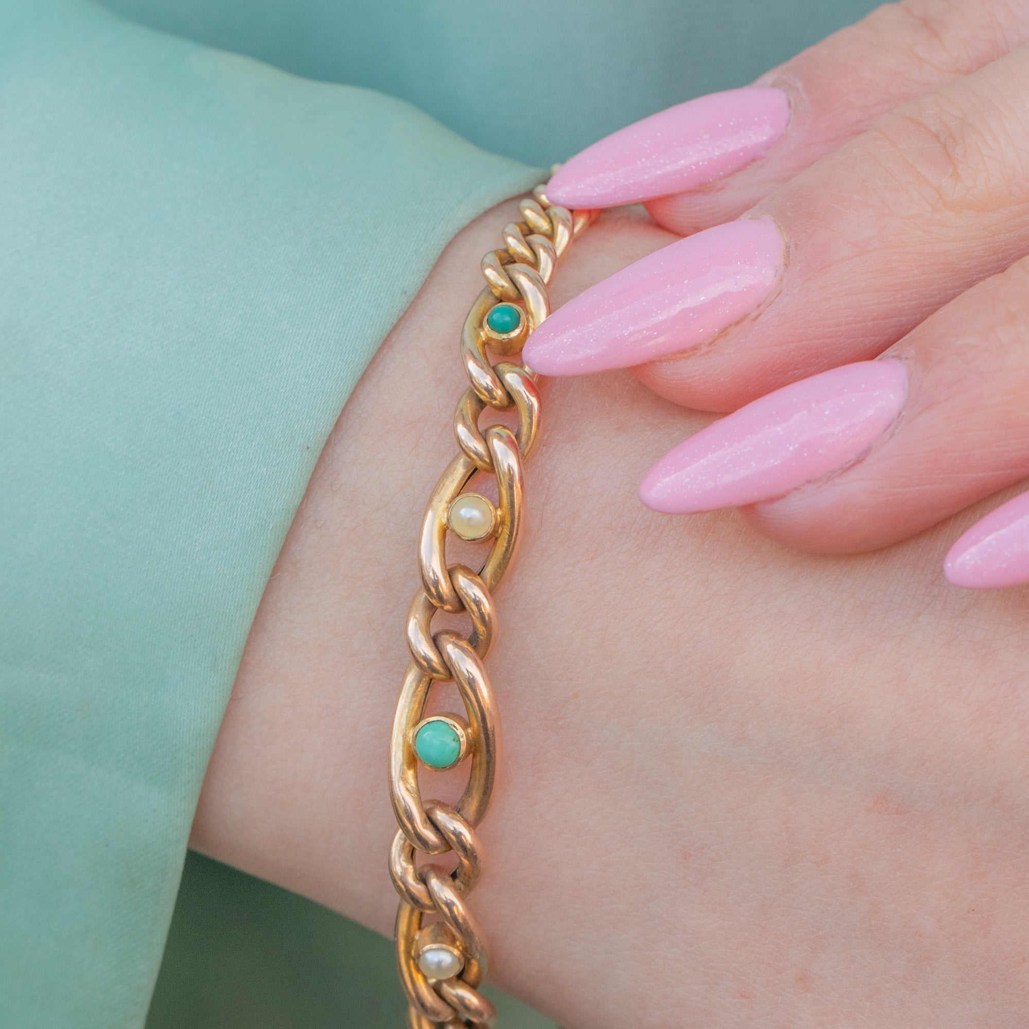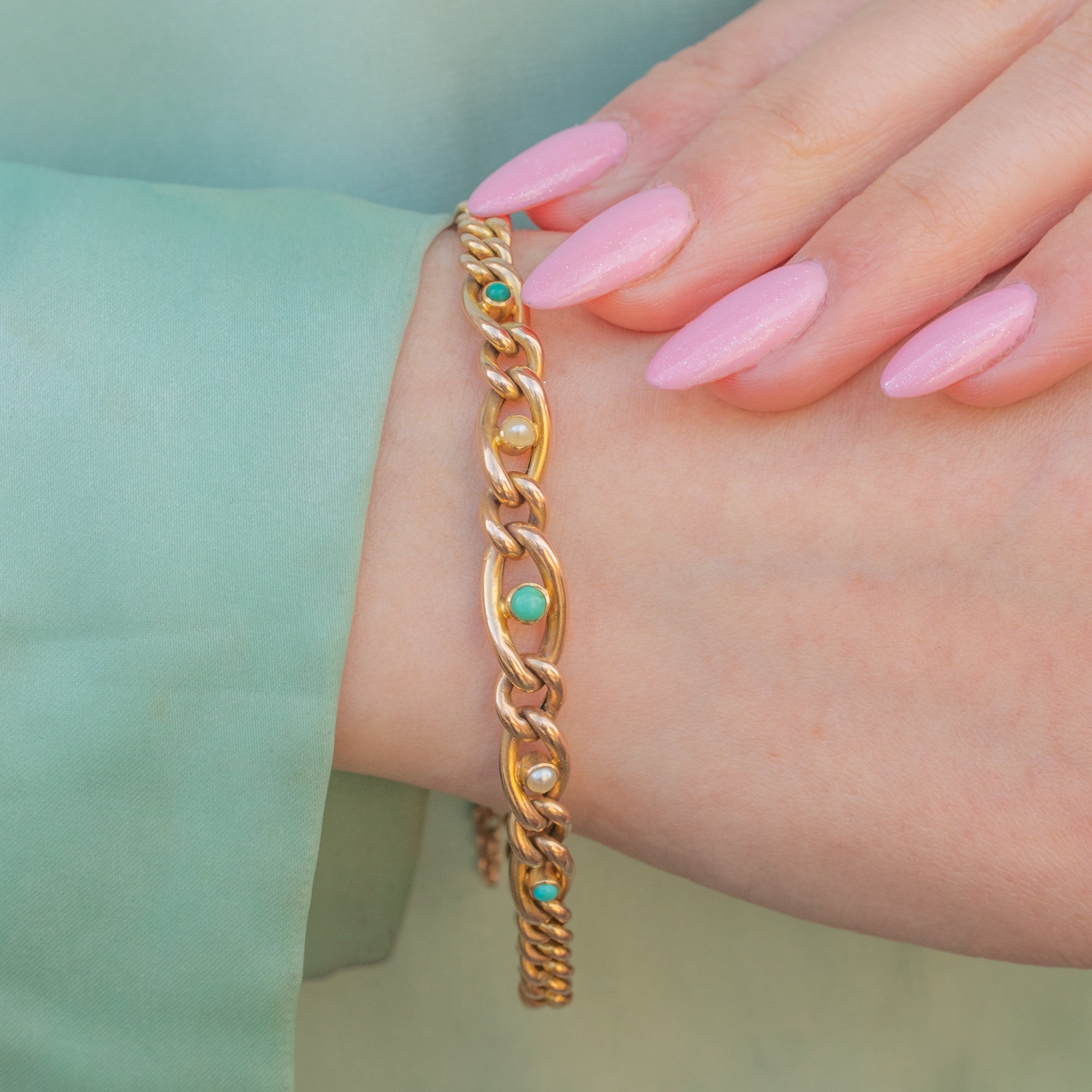 Elevate your collection with this antique 9ct Gold Turquoise and Pearl curb link bracelet!