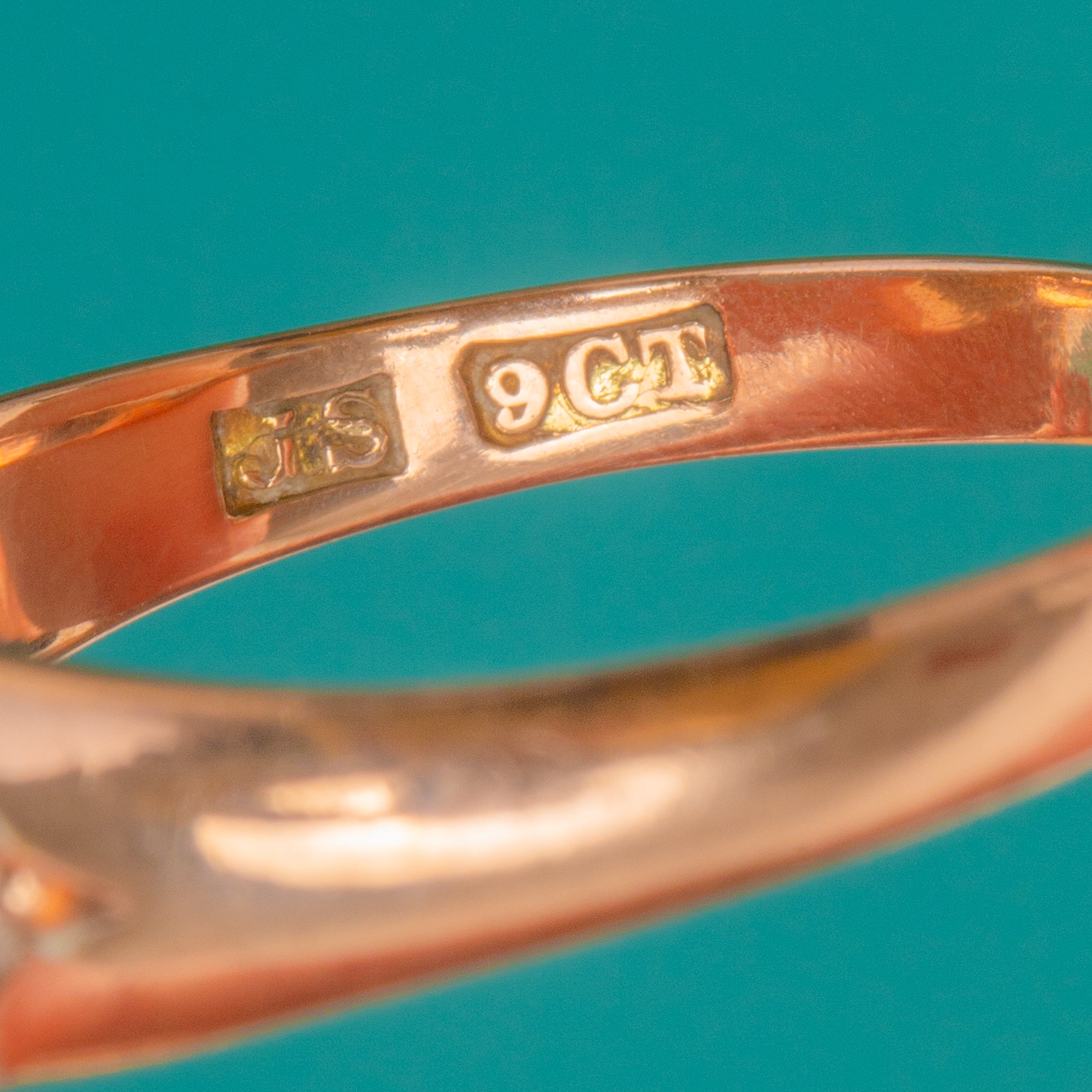 Period detailing elevates the simplicity: crisp star and lozenge engraving around the side stones, polished shoulders, and a slim, tapering shank for a refined finish. Understated yet characterful, it’s a beautiful pop of colour and sparkle with that softly worn, antique allure.