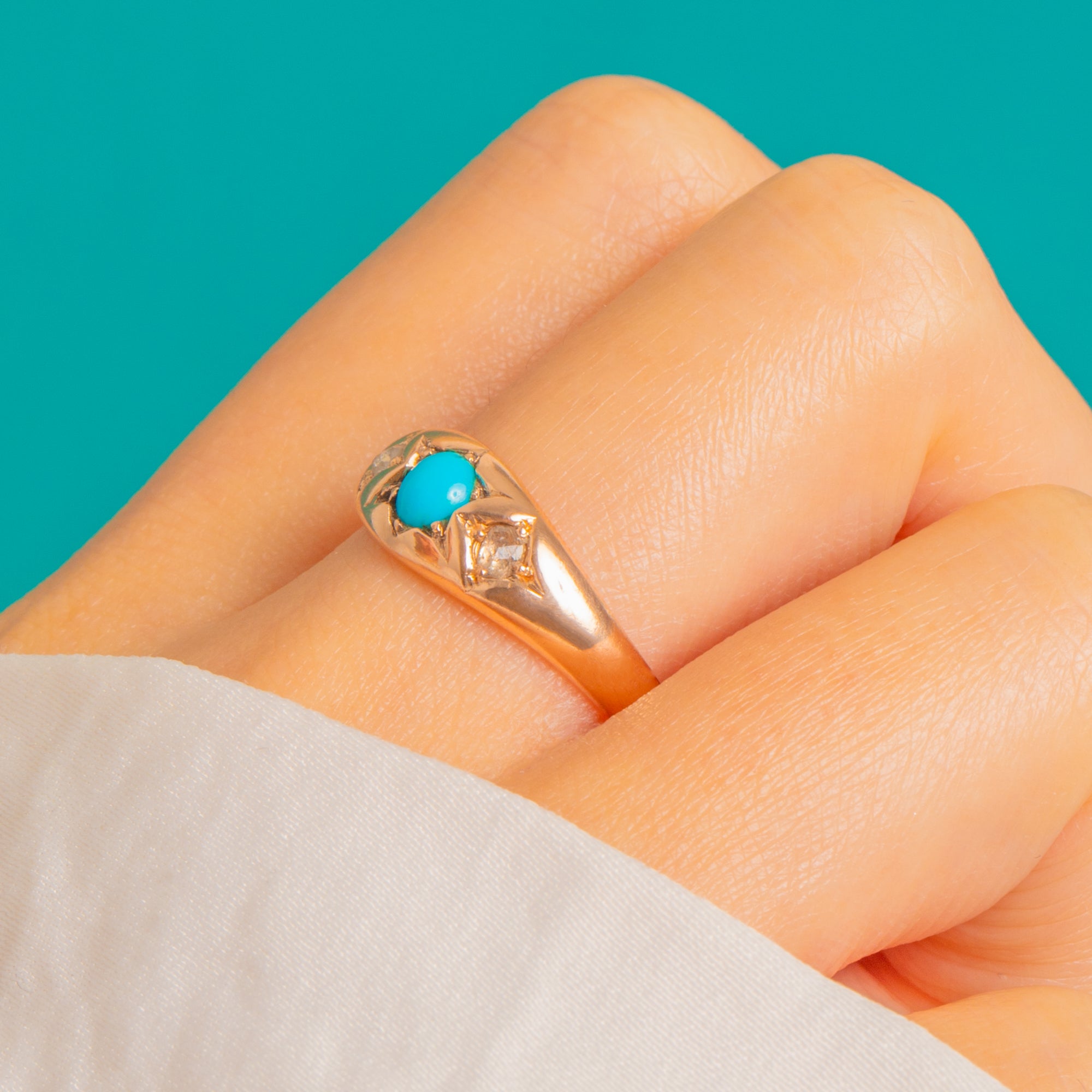 This Victorian 9ct Gold three-stone ring is a delicate treasure with timeless charm. A vivid sky-blue Turquoise cabochon sits centre stage, flanked by two twinkling Diamonds in engraved, star-point settings. The warm, rosy hue of the Gold and the low-profile silhouette make it an easy, elegant piece to wear every day.