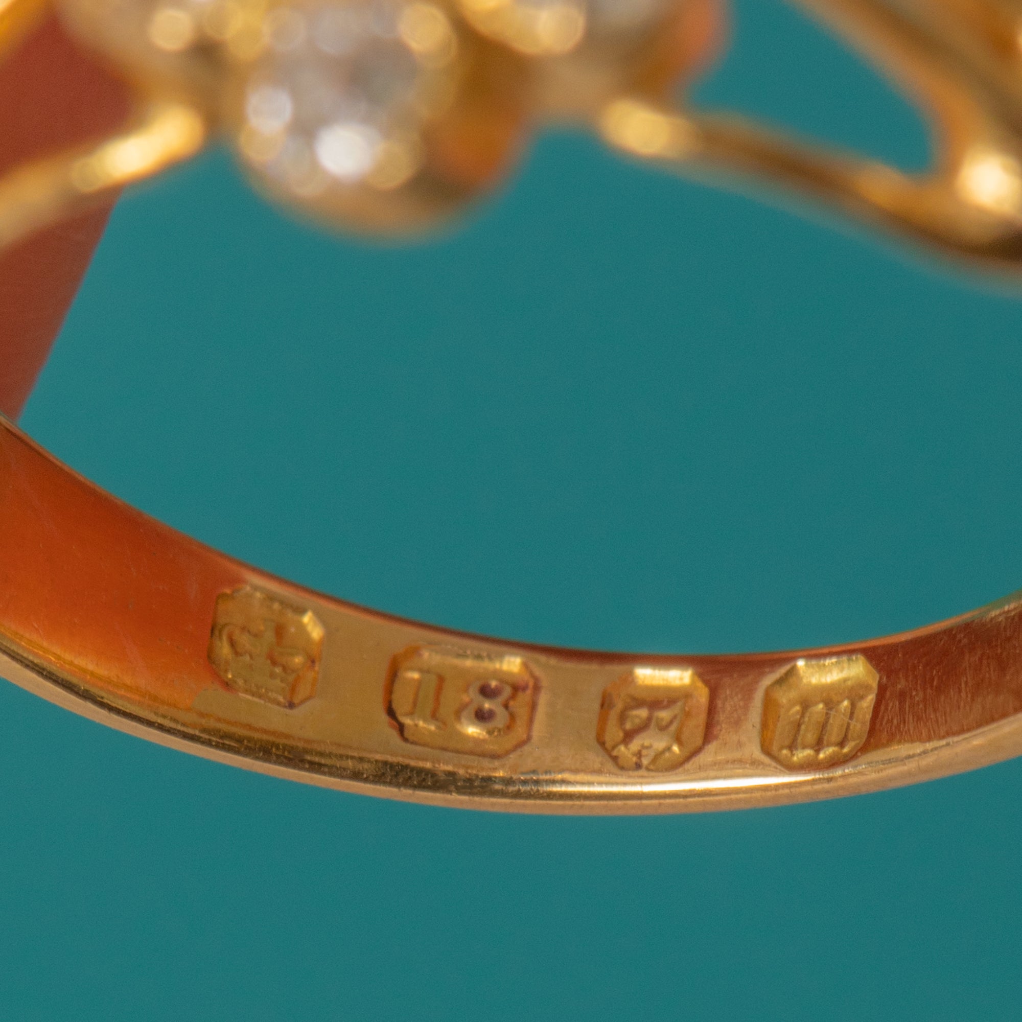 Crafted in rich 18ct Gold, the hands meet around a sparkling cluster of six antique Old Mine Cut Diamonds, forming a delicate flower at the centre.