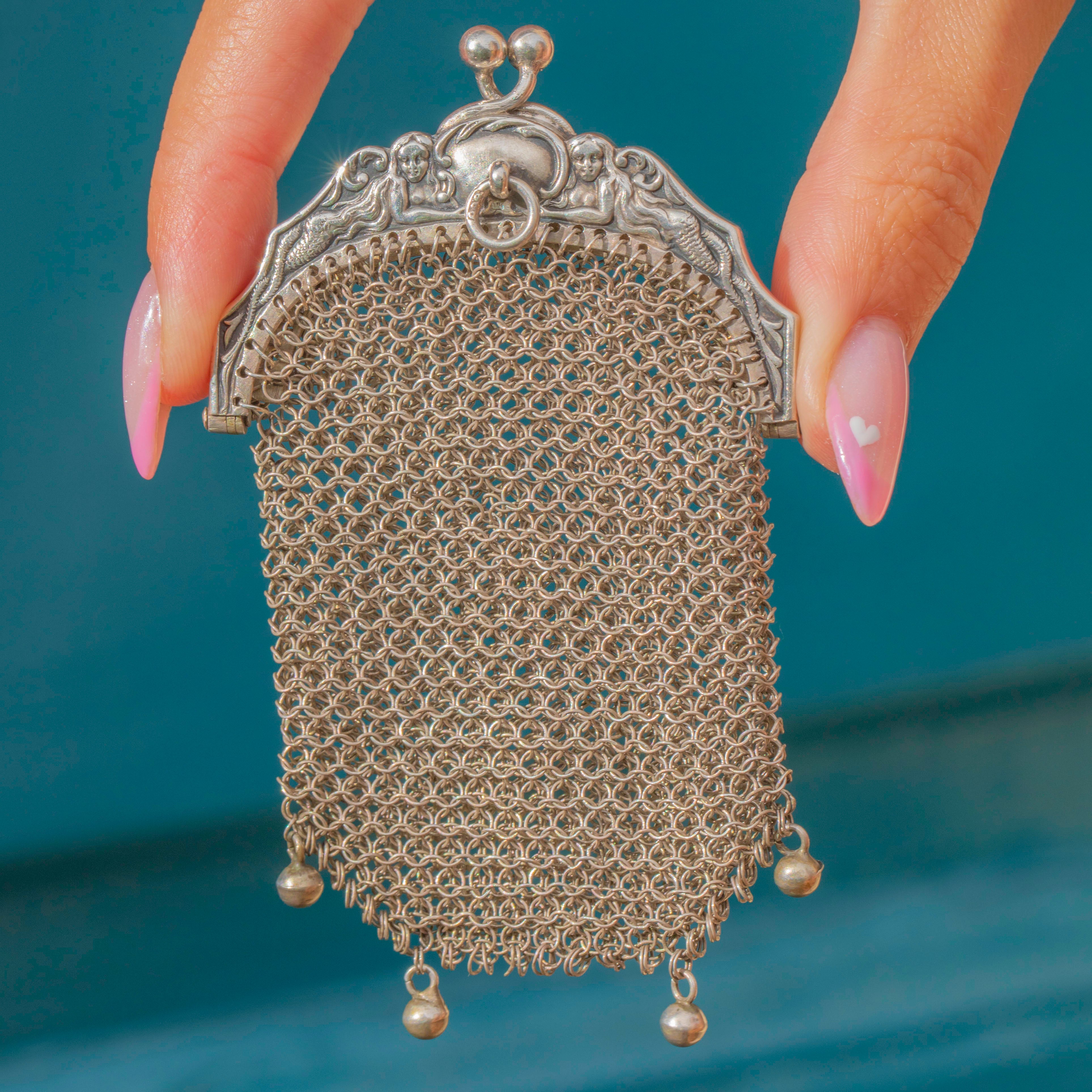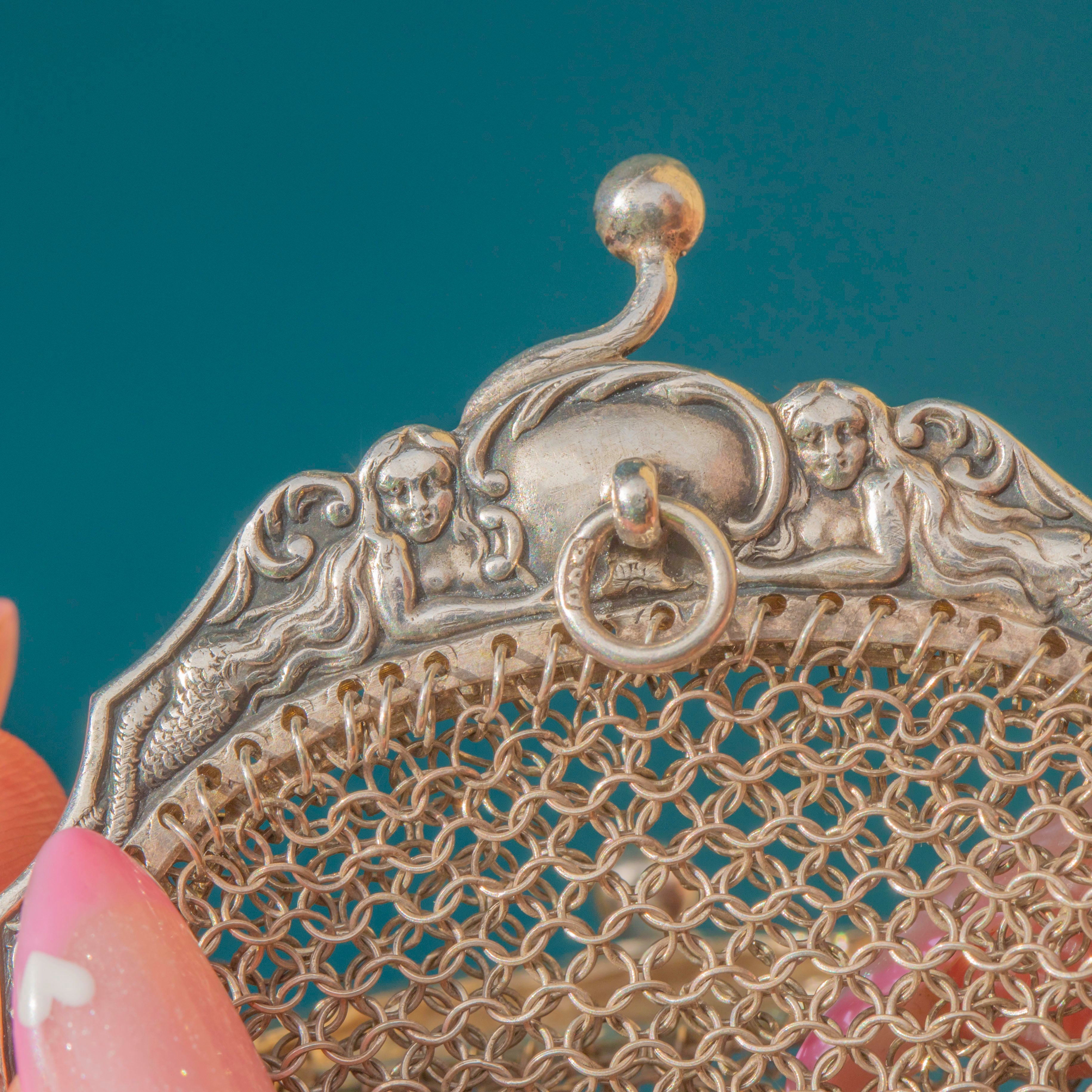 Antique Art Nouveau Silver Chainmail Coin purse with Mermaids.