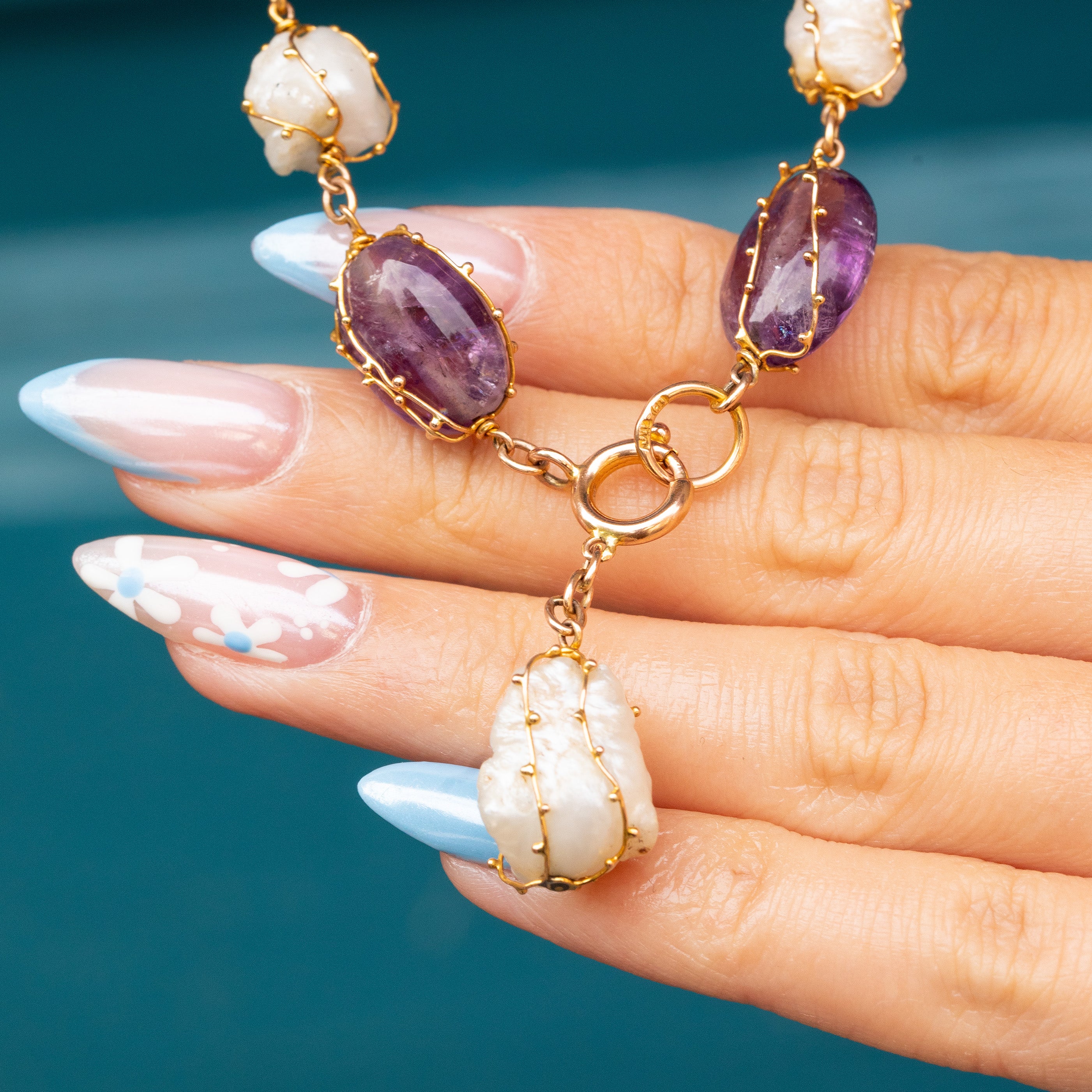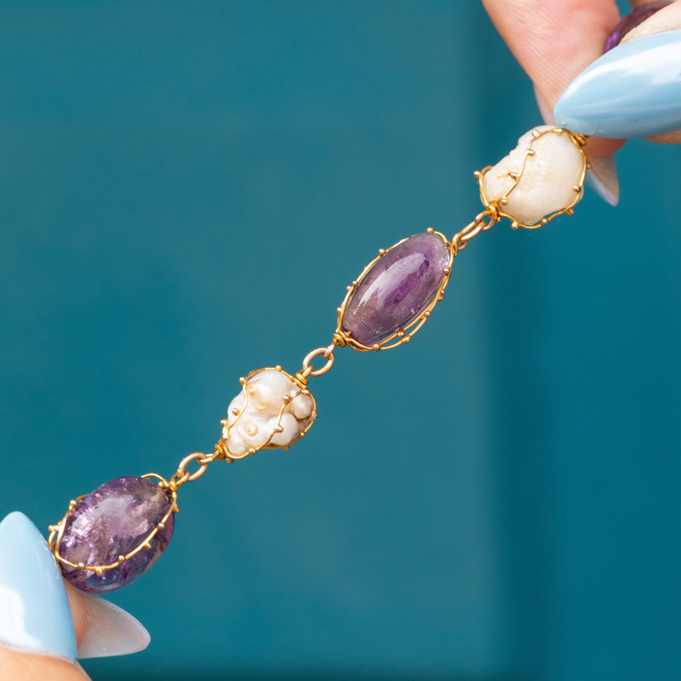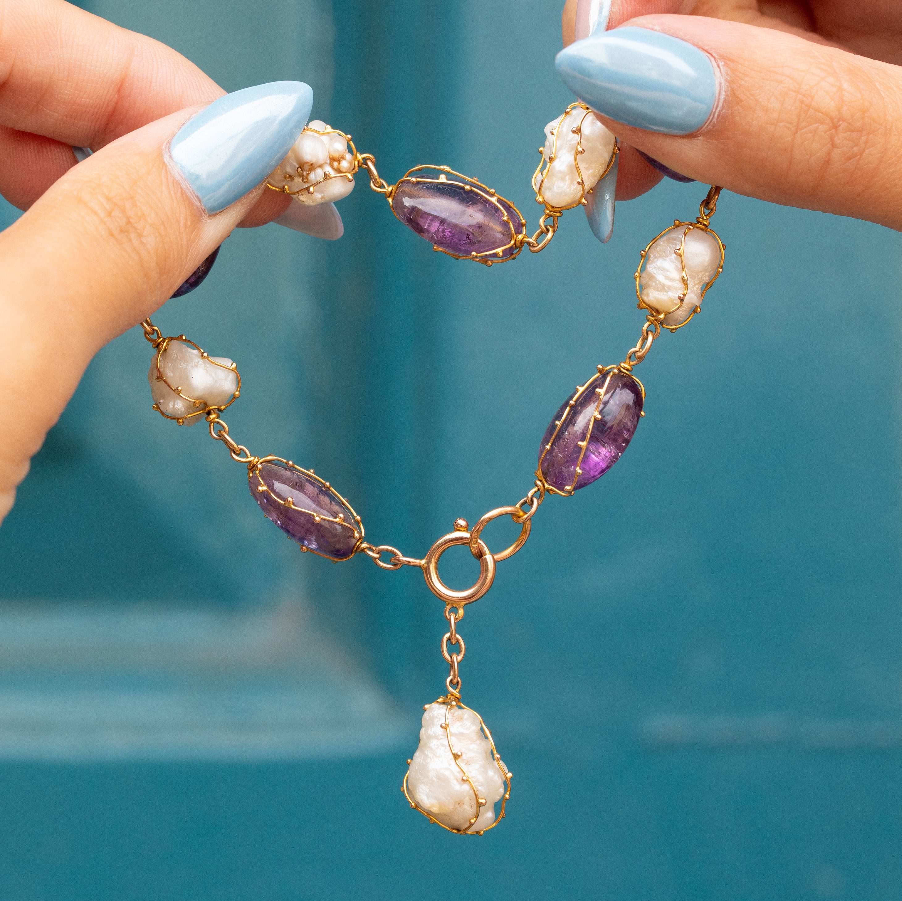 Beautiful and bold, this antique Amethyst & Baroque Pearl bracelet perfectly captures the organic-inspired designs of the Arts & Crafts movement, with its exquisite selection of gemstones displayed within free-flowing, ornate 15ct Gold cage settings.