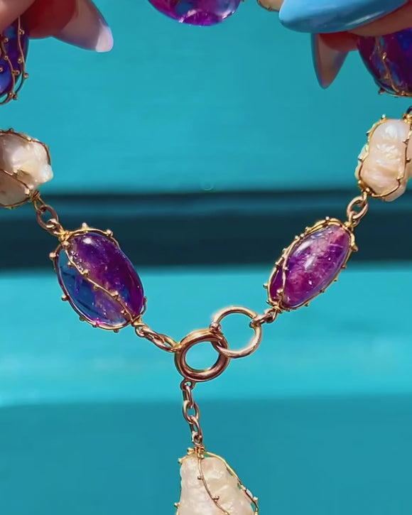 Antique Arts & Crafts Era 15ct Gold Caged Amethyst & Baroque Pearl Bracelet