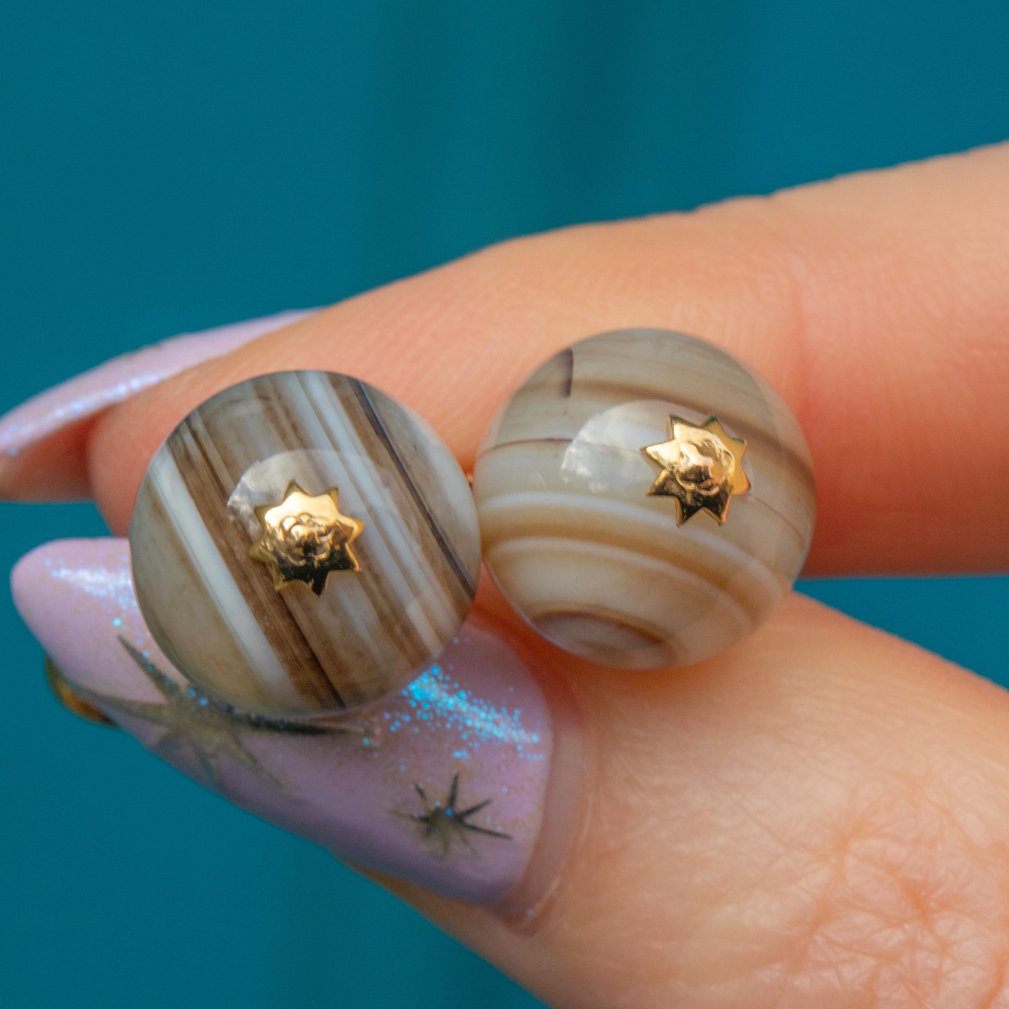 Each Victorian drop earring suspends a gorgeous Agate sphere, with stunning earthy tones, akin to the rings of Saturn. Each Agate is adorned with a petite 9ct Gold star bead on their base, adding an ethereal, celestial allure to this antique pair.