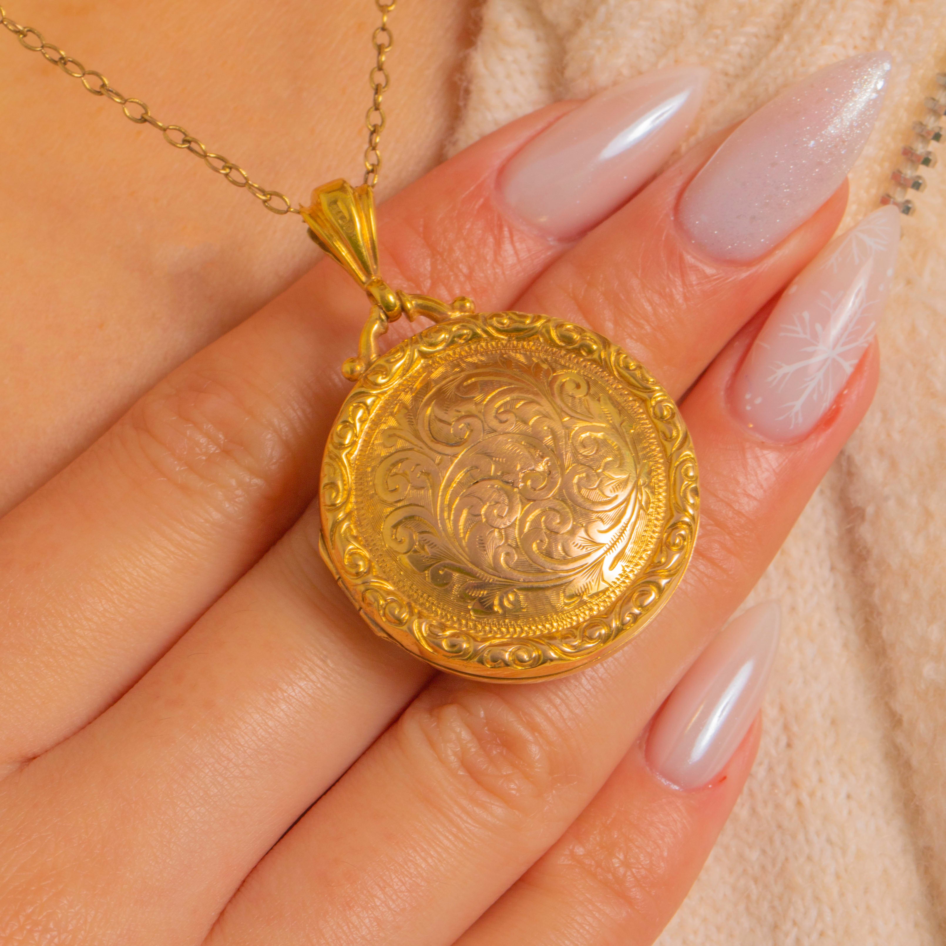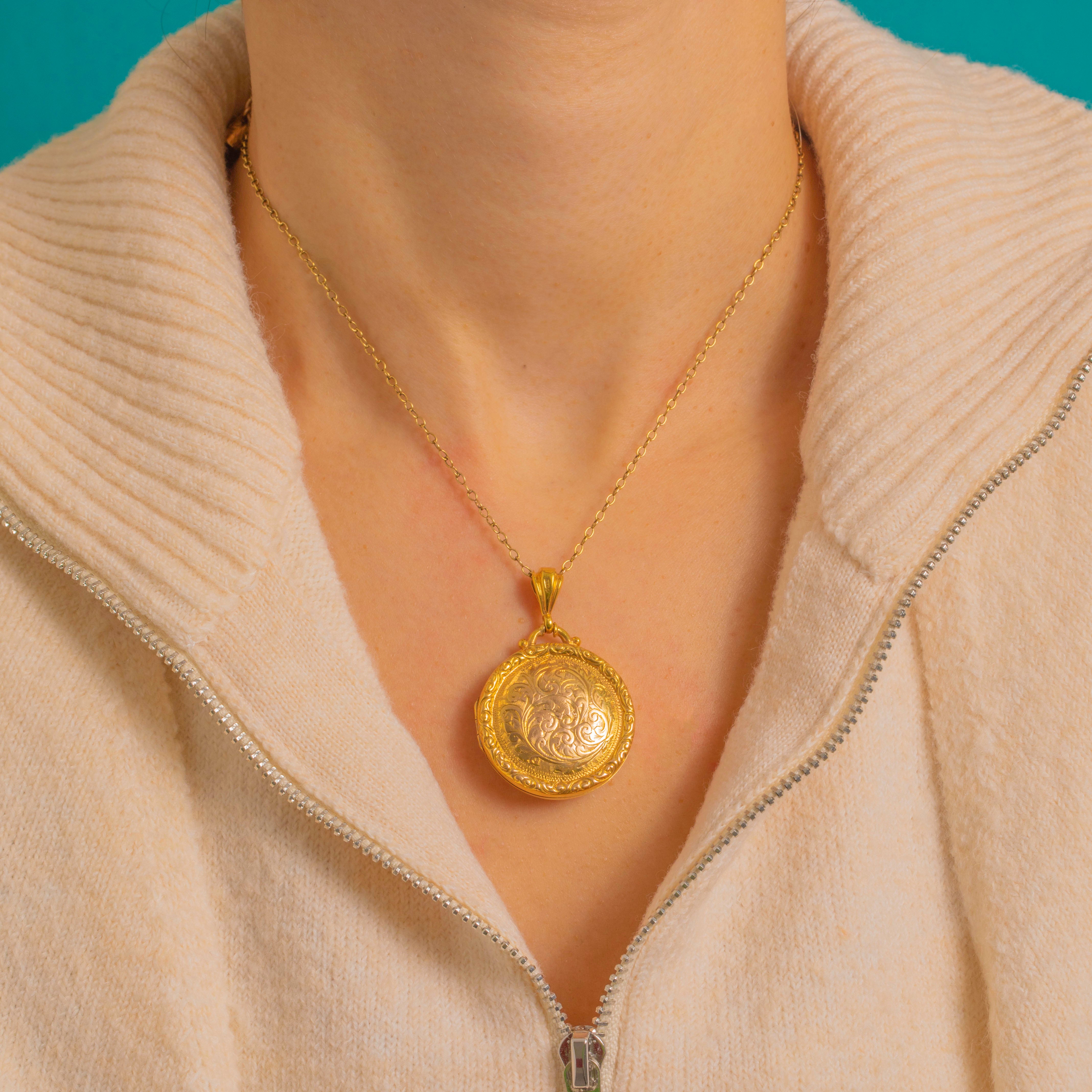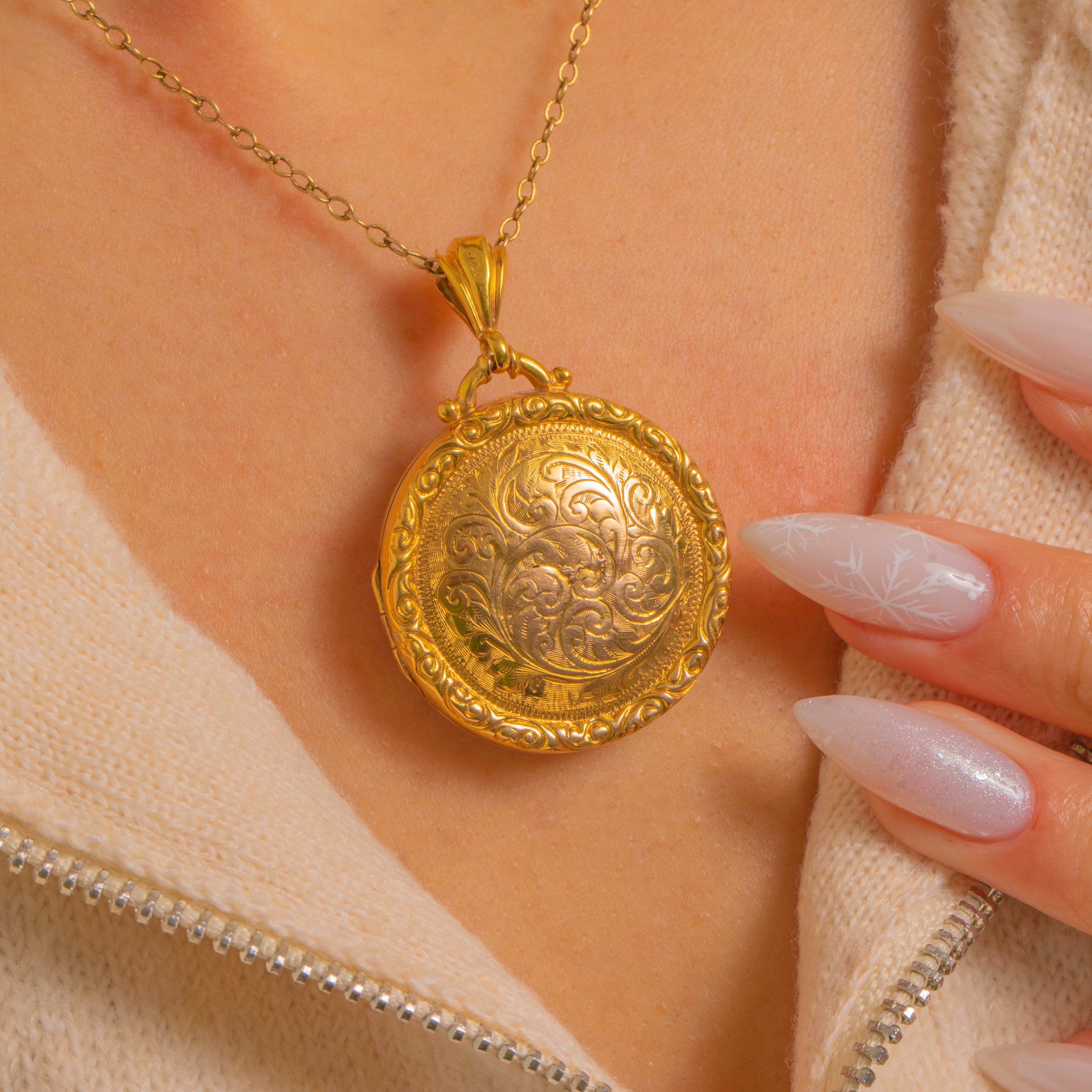 Brimming with late Victorian romance, this antique round locket is crafted in bright 9ct Gold and richly hand-engraved with scrolling foliate motifs. A raised, repoussé border frames the design beautifully, while a substantial fluted bail completes the opulent, Rococo-revival look.