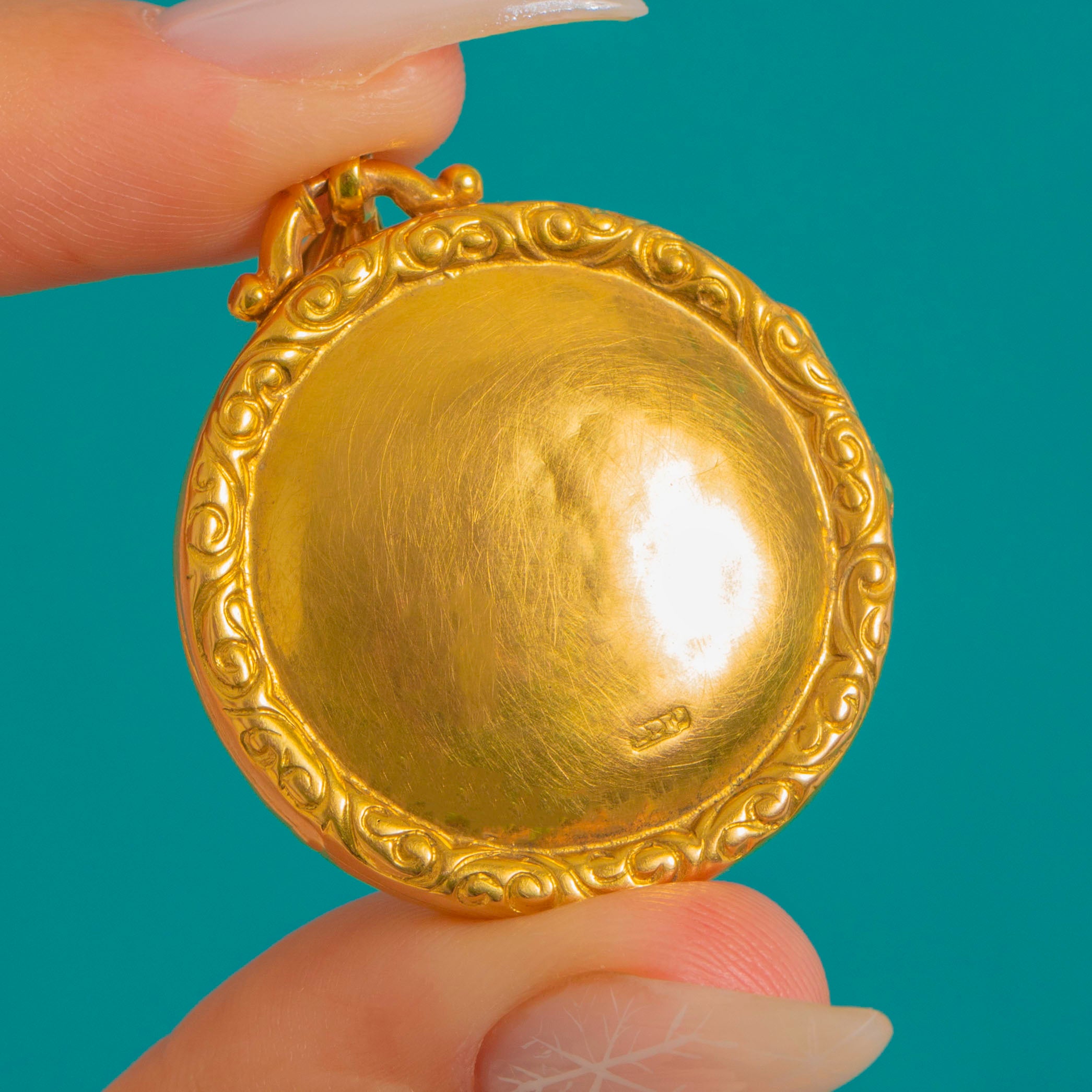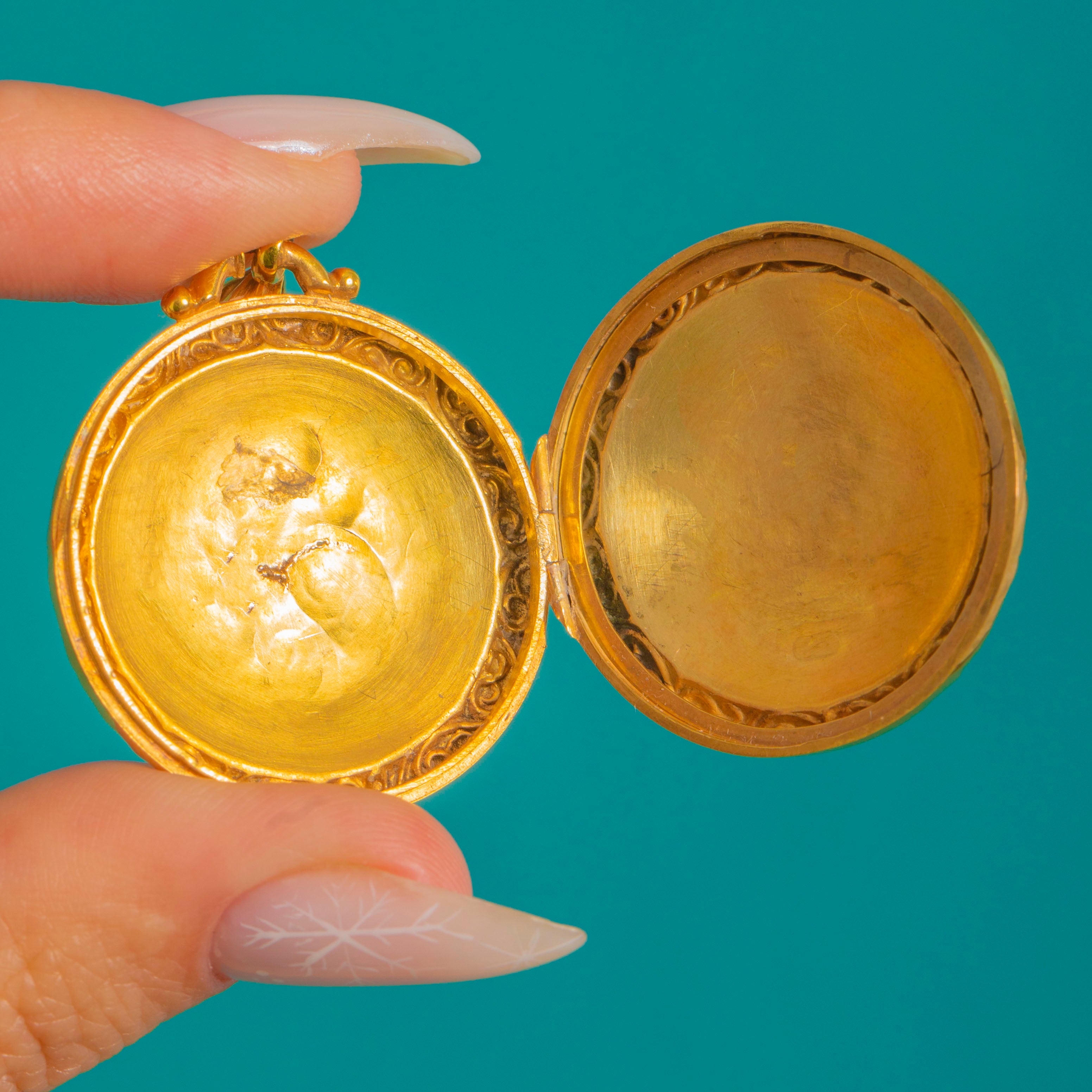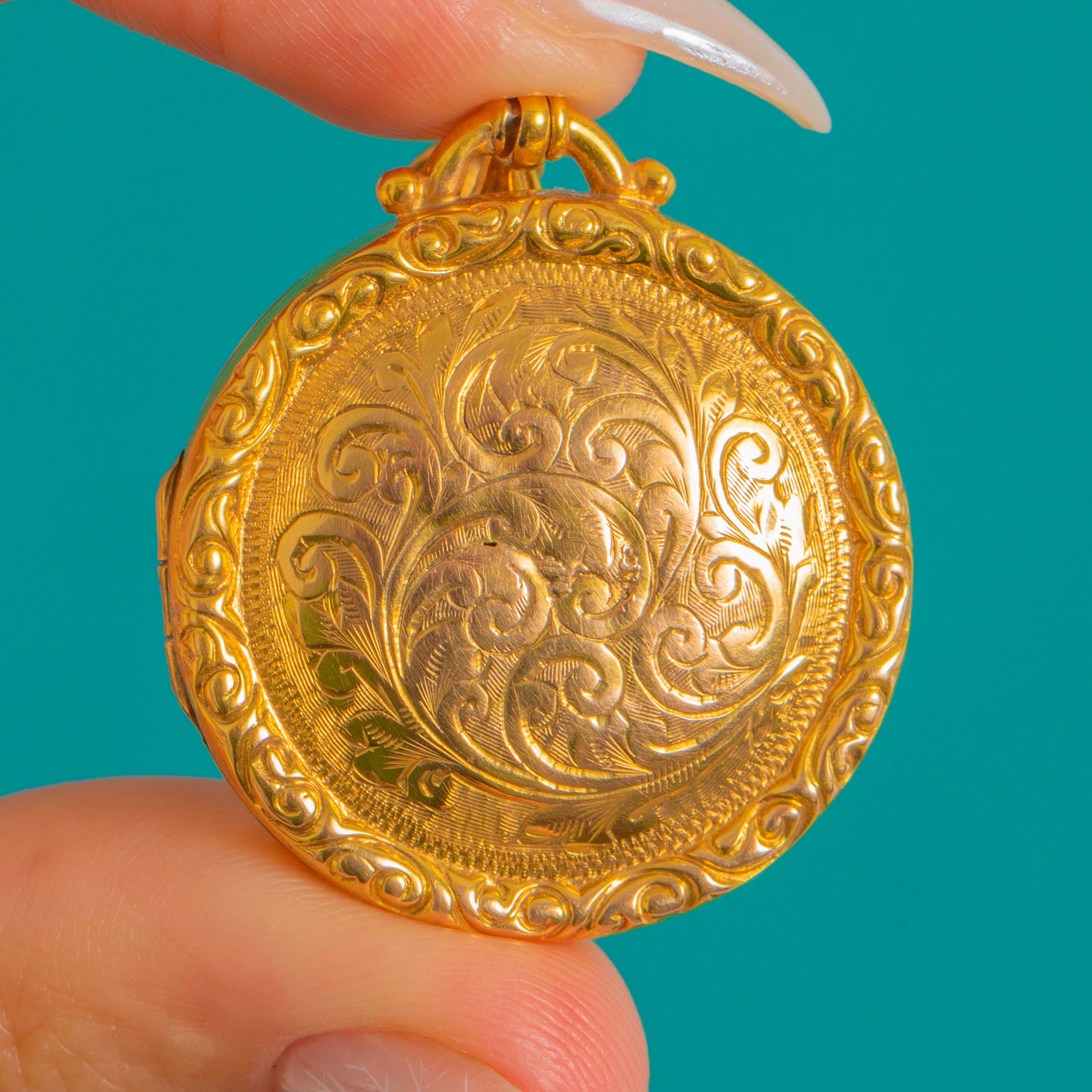 Brimming with late Victorian romance, this antique round locket is crafted in bright 9ct Gold and richly hand-engraved with scrolling foliate motifs. A raised, repoussé border frames the design beautifully, while a substantial fluted bail completes the opulent, Rococo-revival look.