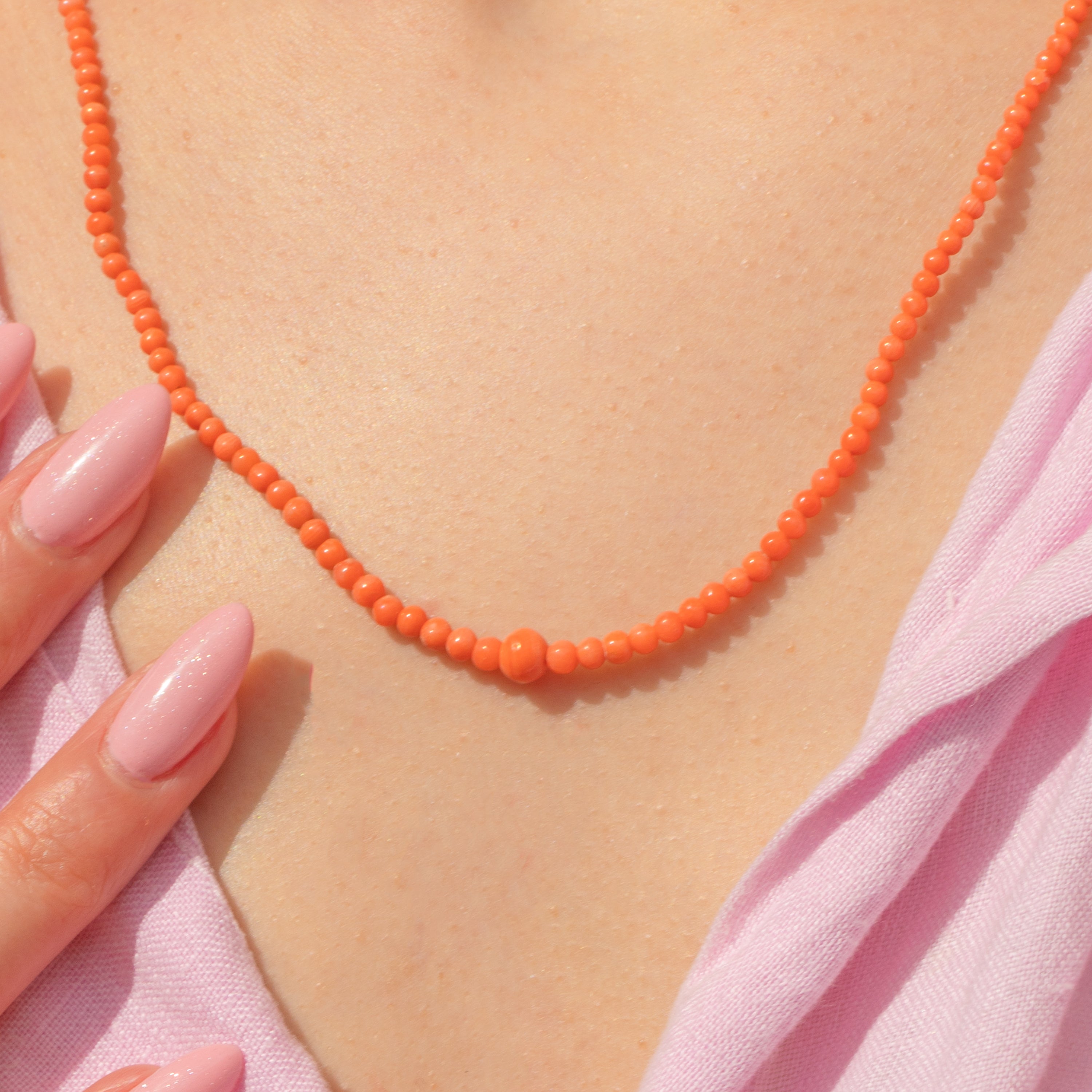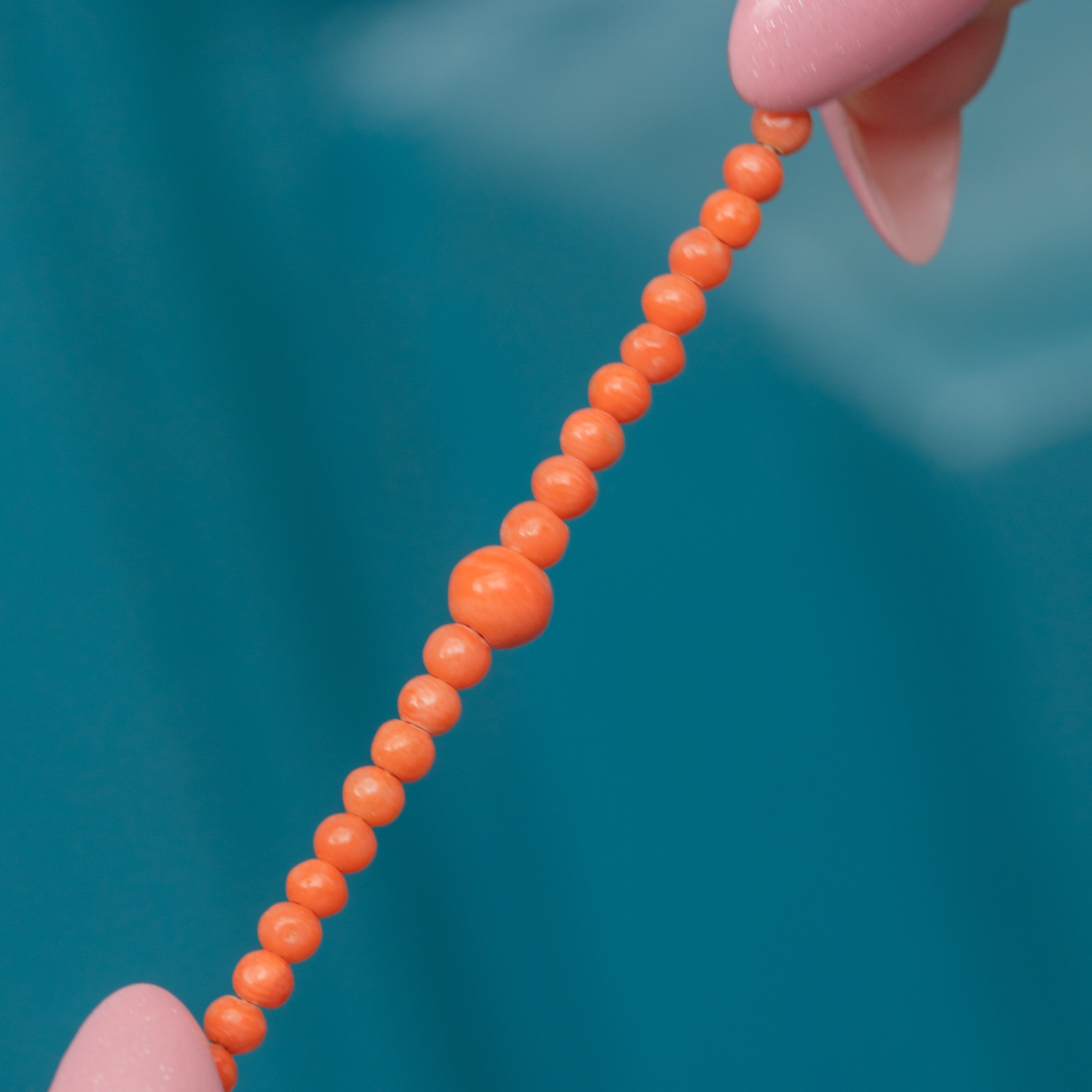 This antique Coral beaded necklace will add a feminine flourish to your décolletage! The graduating Coral beads display a lovely variation in hue, highlighting their natural beauty, and are centred by a larger bead that will rest elegantly between your collarbones.