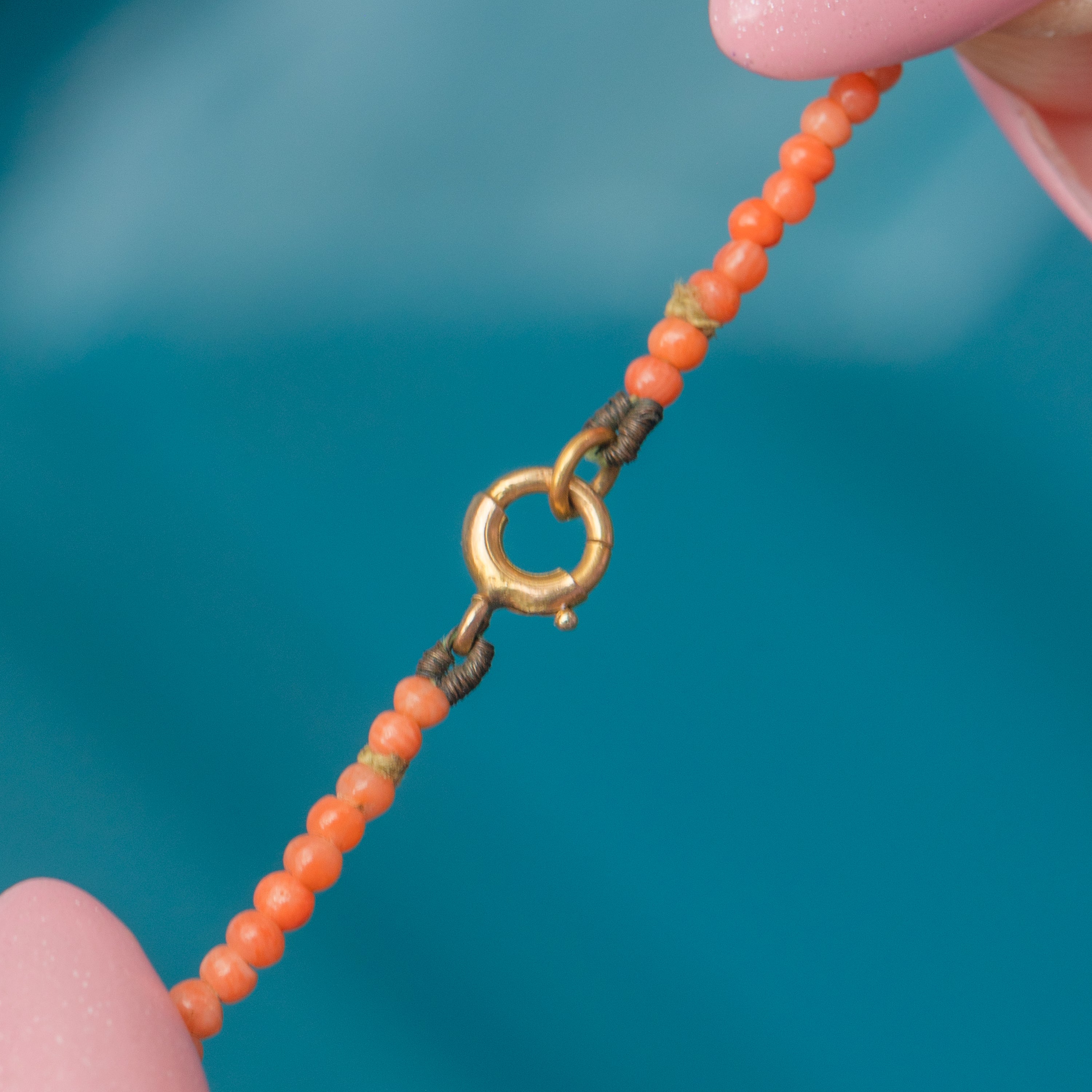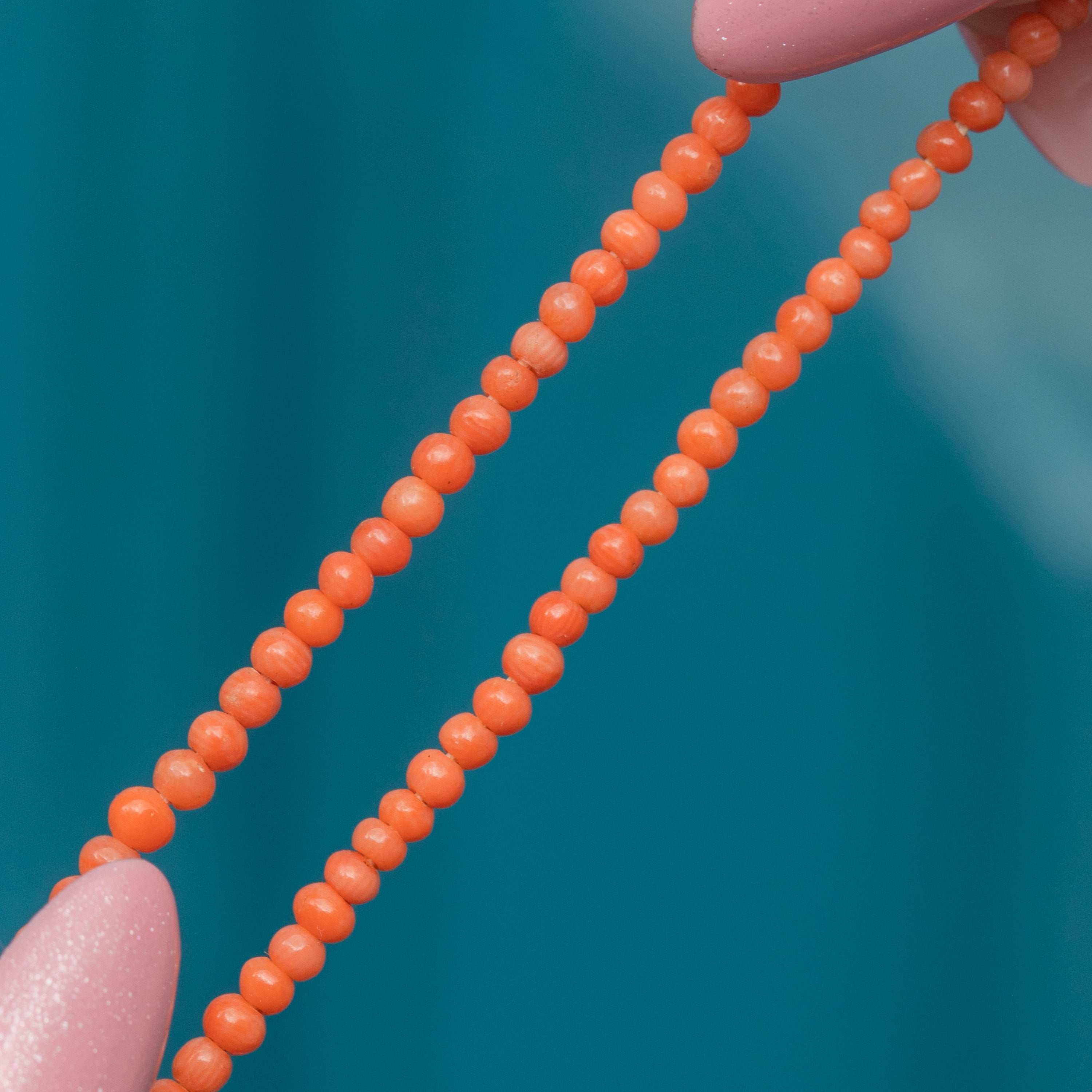 VERY GOOD-EXCELLENT: This antique Coral beaded necklace is in wonderful condition. The Coral beads are all present and securely strung with only mild surface wear, commensurate with age. There is slight wear around the bolt ring, but when considering the impressive age of the piece, this can easily be forgiven. The bolt ring is in perfect working order, so you can wear this Victorian necklace with utmost confidence!