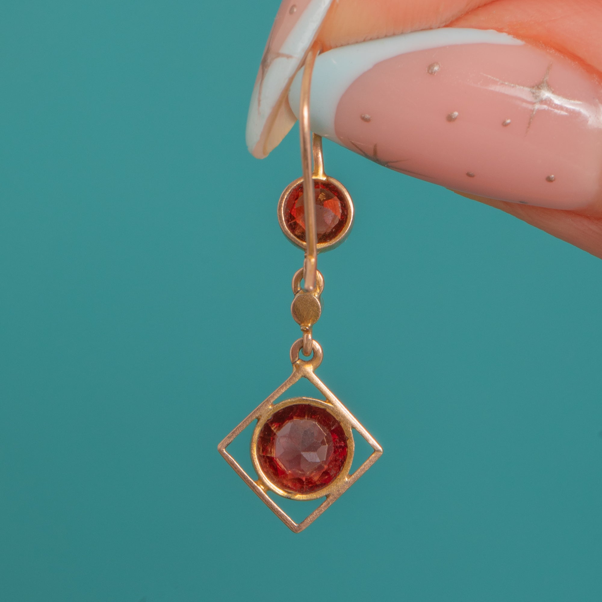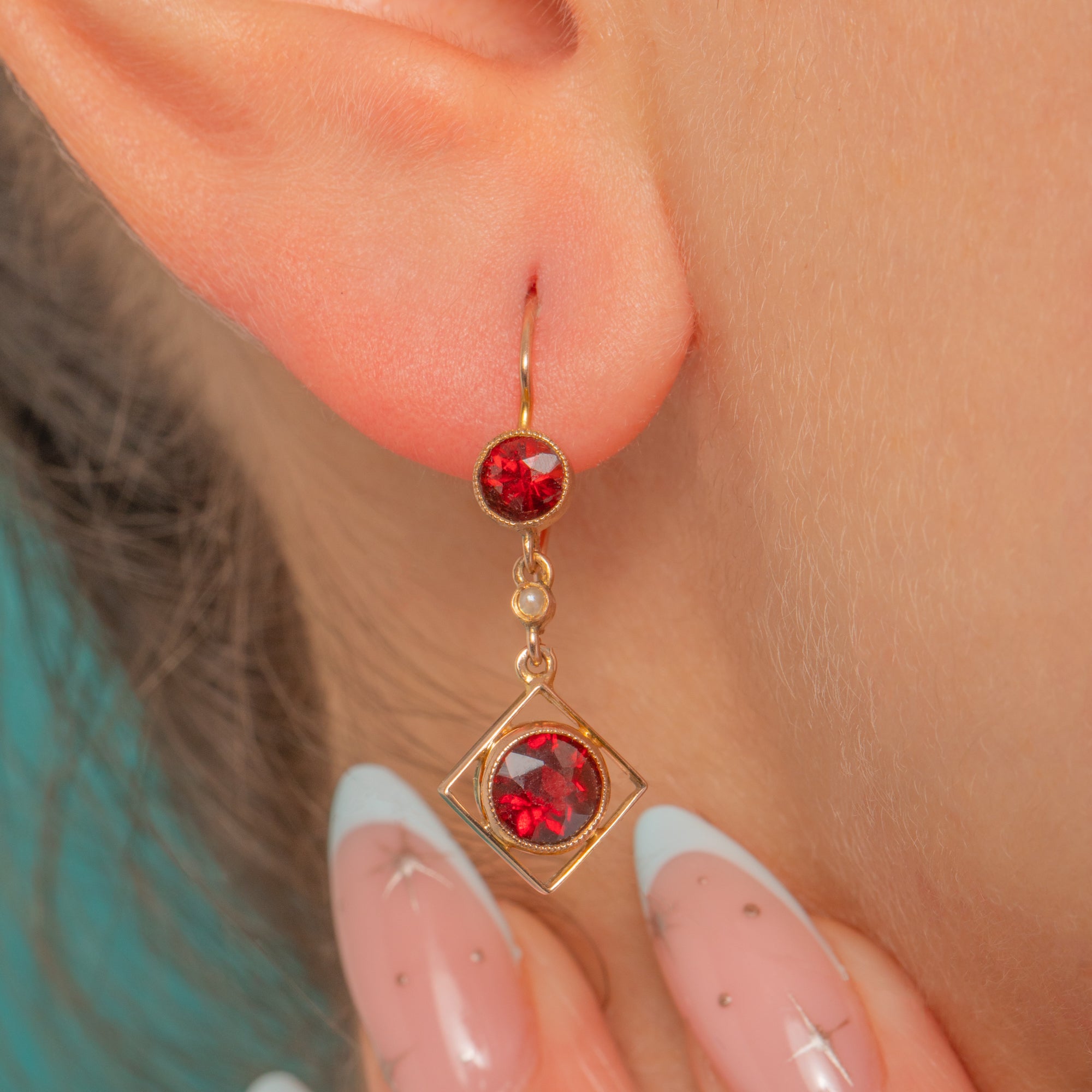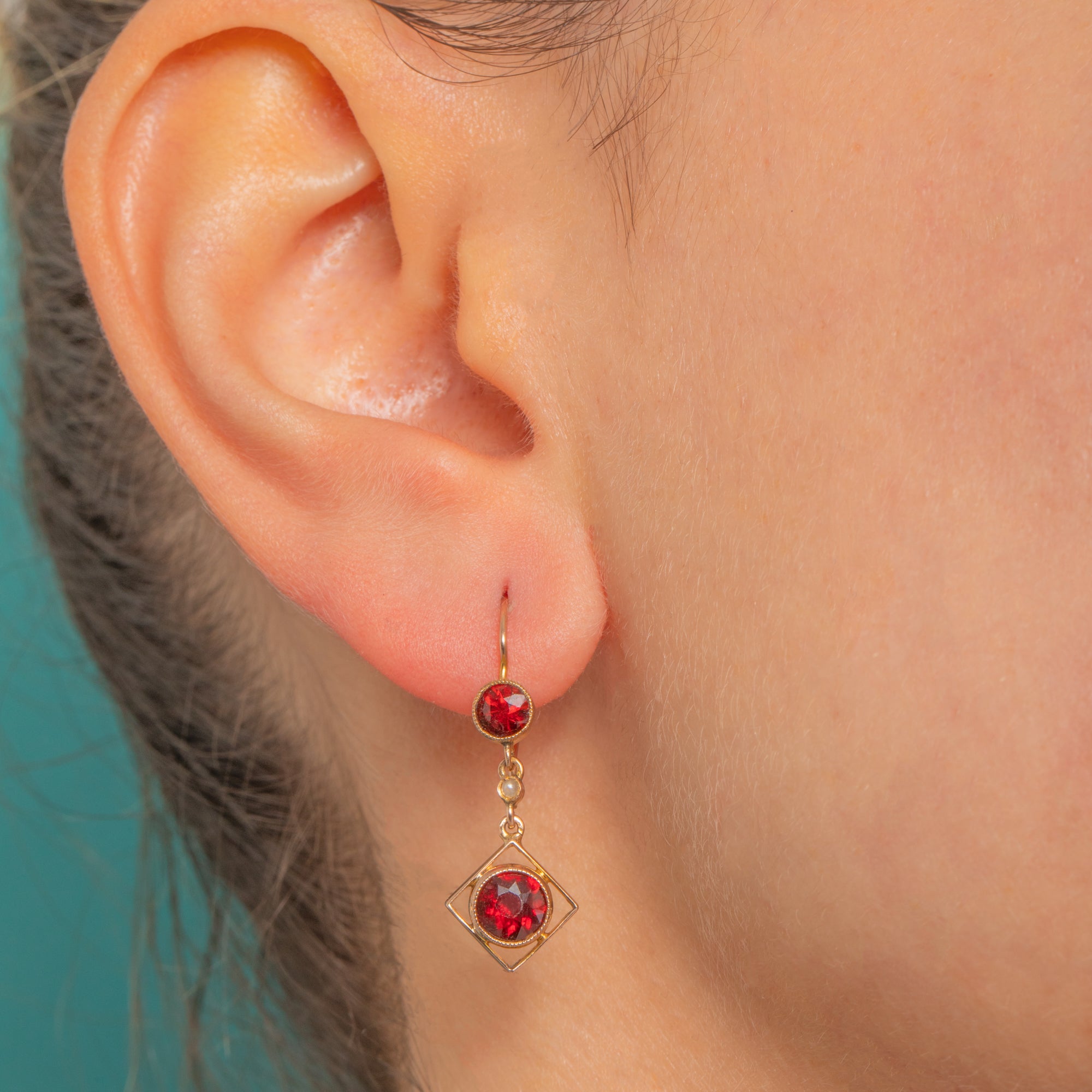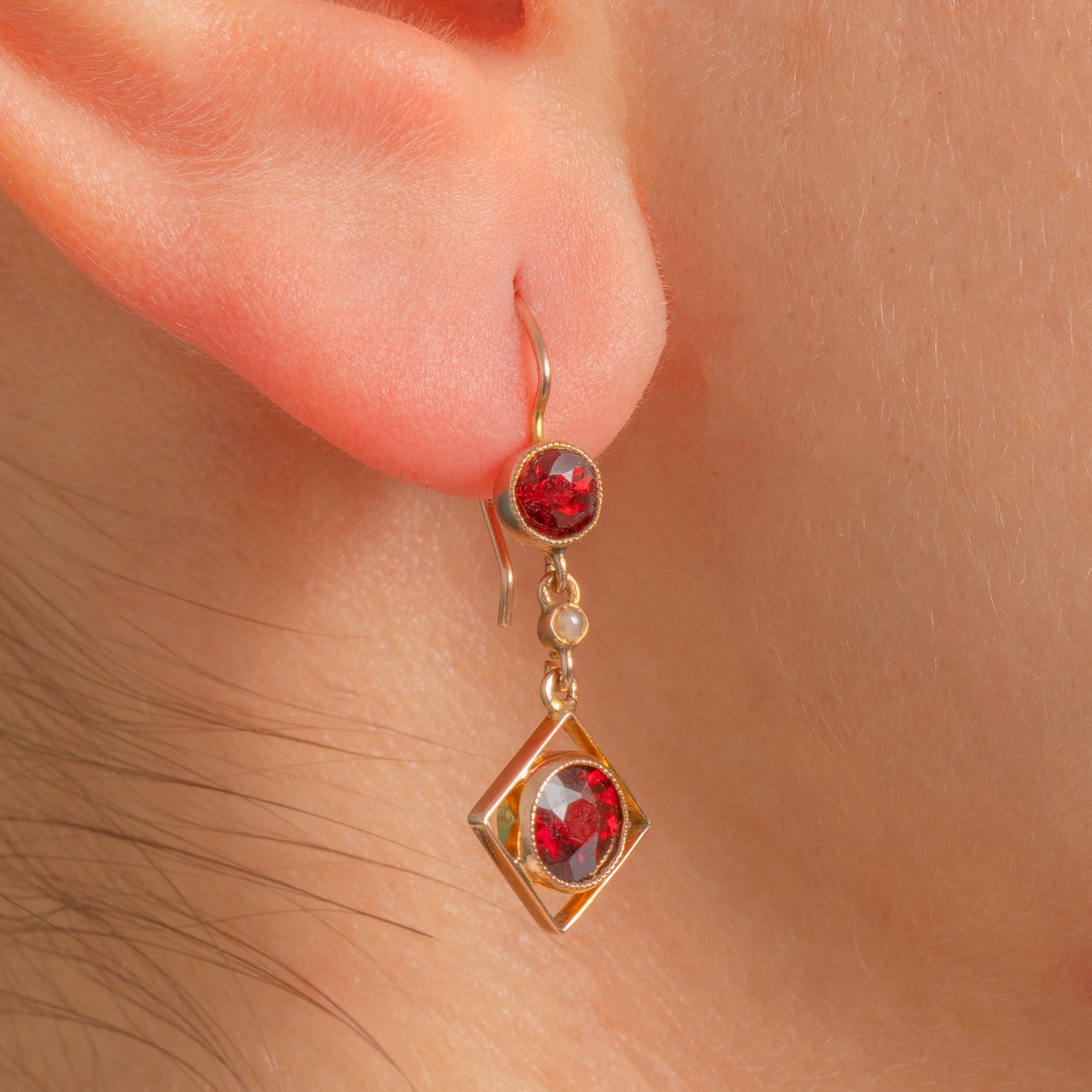 Alive with Edwardian elegance, these 9ct Gold drop earrings pair rich Garnet with a tiny luminous Pearl for a look that’s both delicate and striking. A petite round Garnet sits at the lobe, while a larger Garnet is beautifully suspended within a refined open diamond-shaped frame, joined by a dainty Pearl spacer for a light, graceful fall.