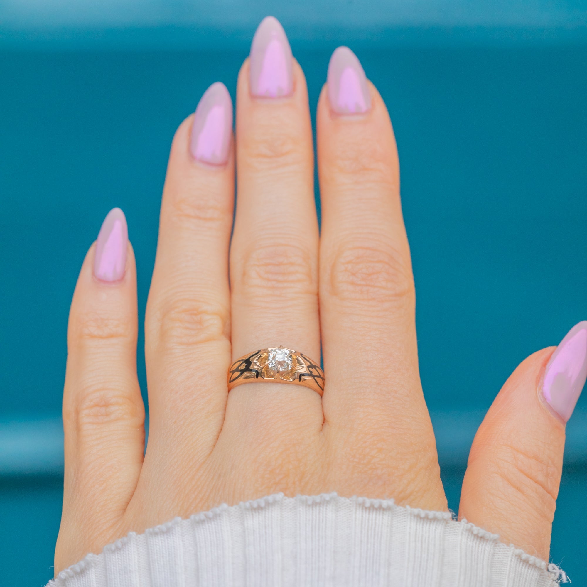 Cirda 1860, this exquisite French Victorian ring is crafted in 15ct Gold and set with a bright 0.35ct rare Peruzzi-Cut Diamond. One of the most legendary and sought-after antique cuts in the world of Diamonds, the so-called 'Peruzzi' cut, is credited to a Venetian lapidary named Vincenzo Peruzzi during the 1600's. The distinctive Diamond sits proudly in a beautifully hand-carved buttercup setting, flanked by fine black Enamel details that add depth and drama to the design.