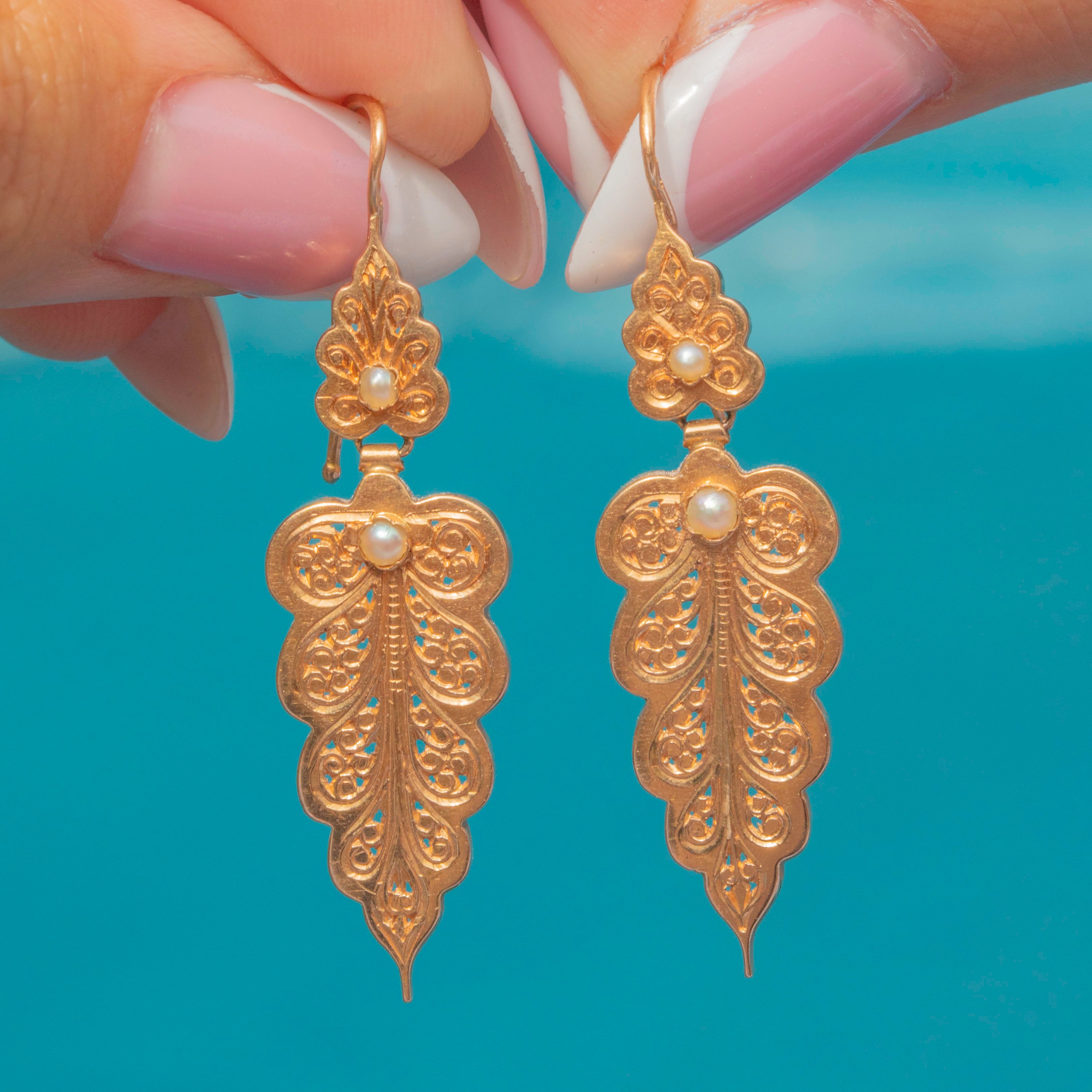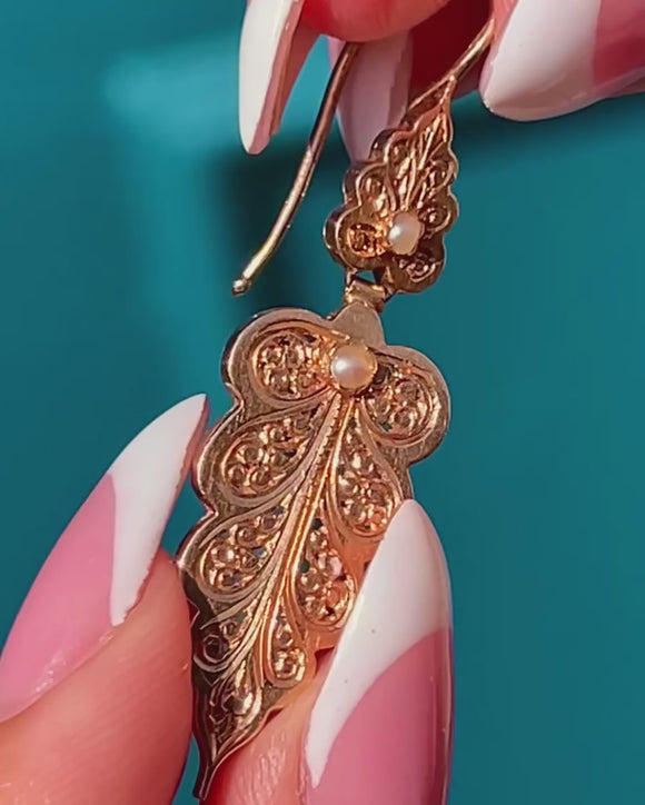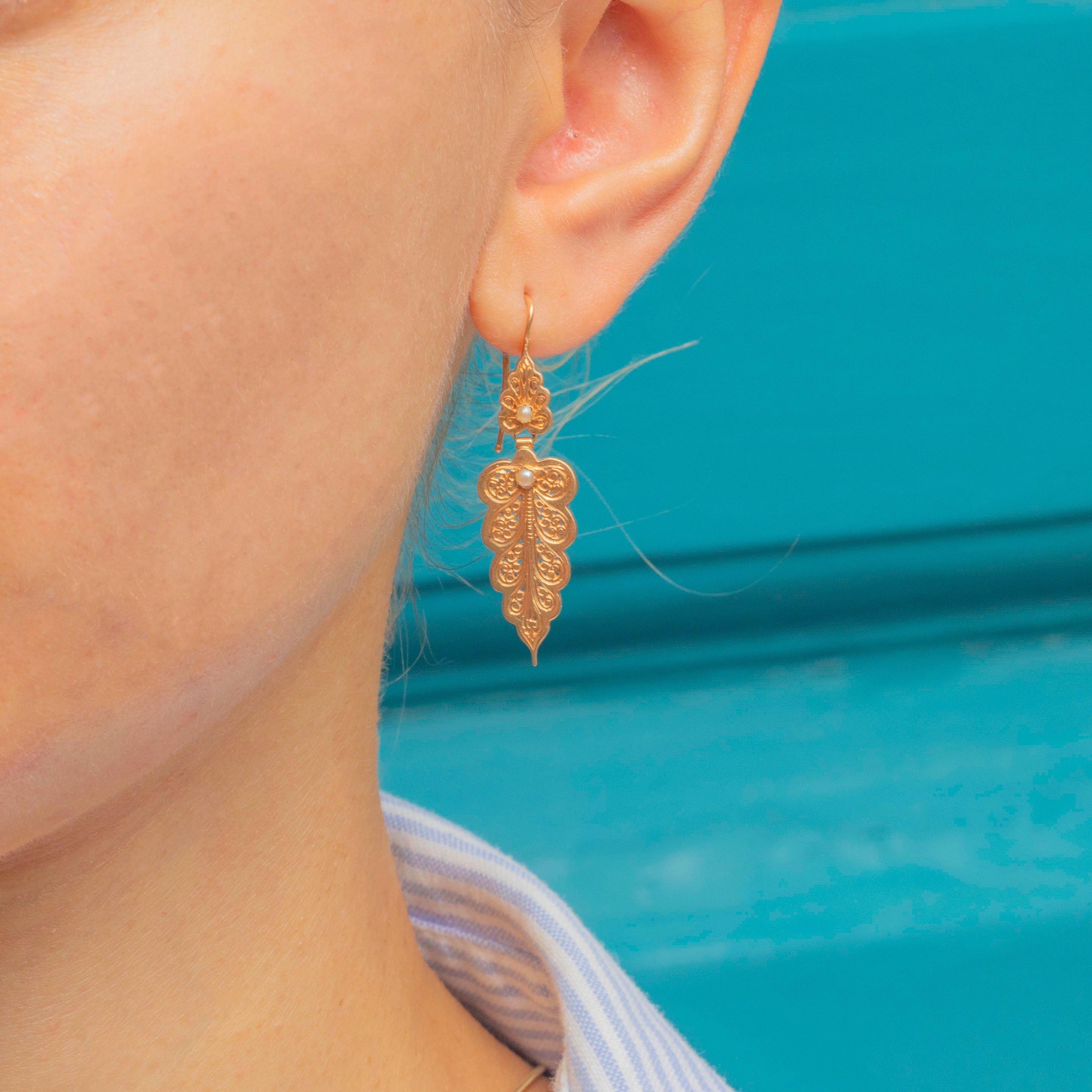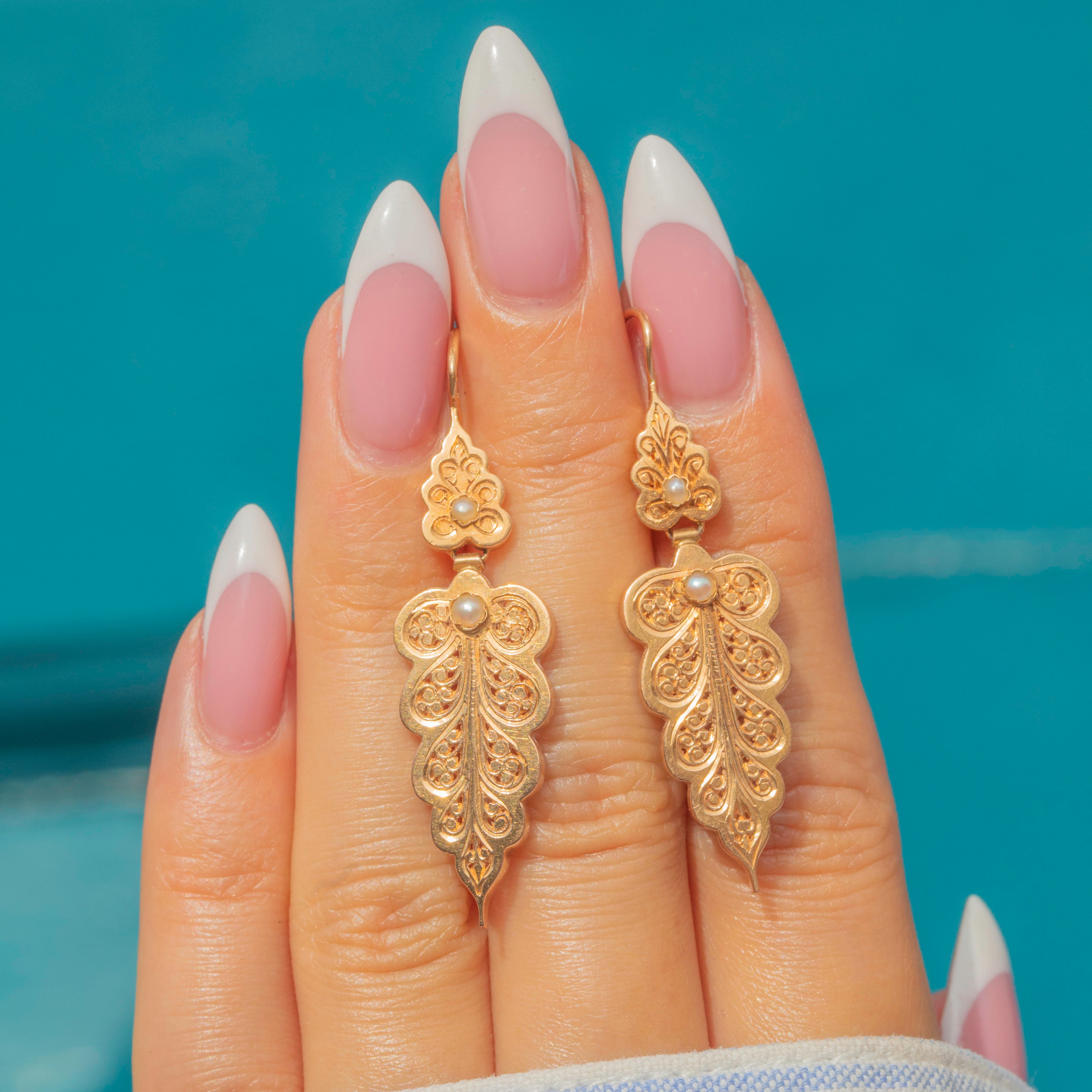 These elegant antique French earrings are crafted in warm 18ct Gold and adorned with natural Pearls. Each earring is shaped as an ornate leaf, featuring beautiful filigree detailing that adds depth and texture to the design. The Gold has a rich, even tone, enhancing the delicate craftsmanship.
