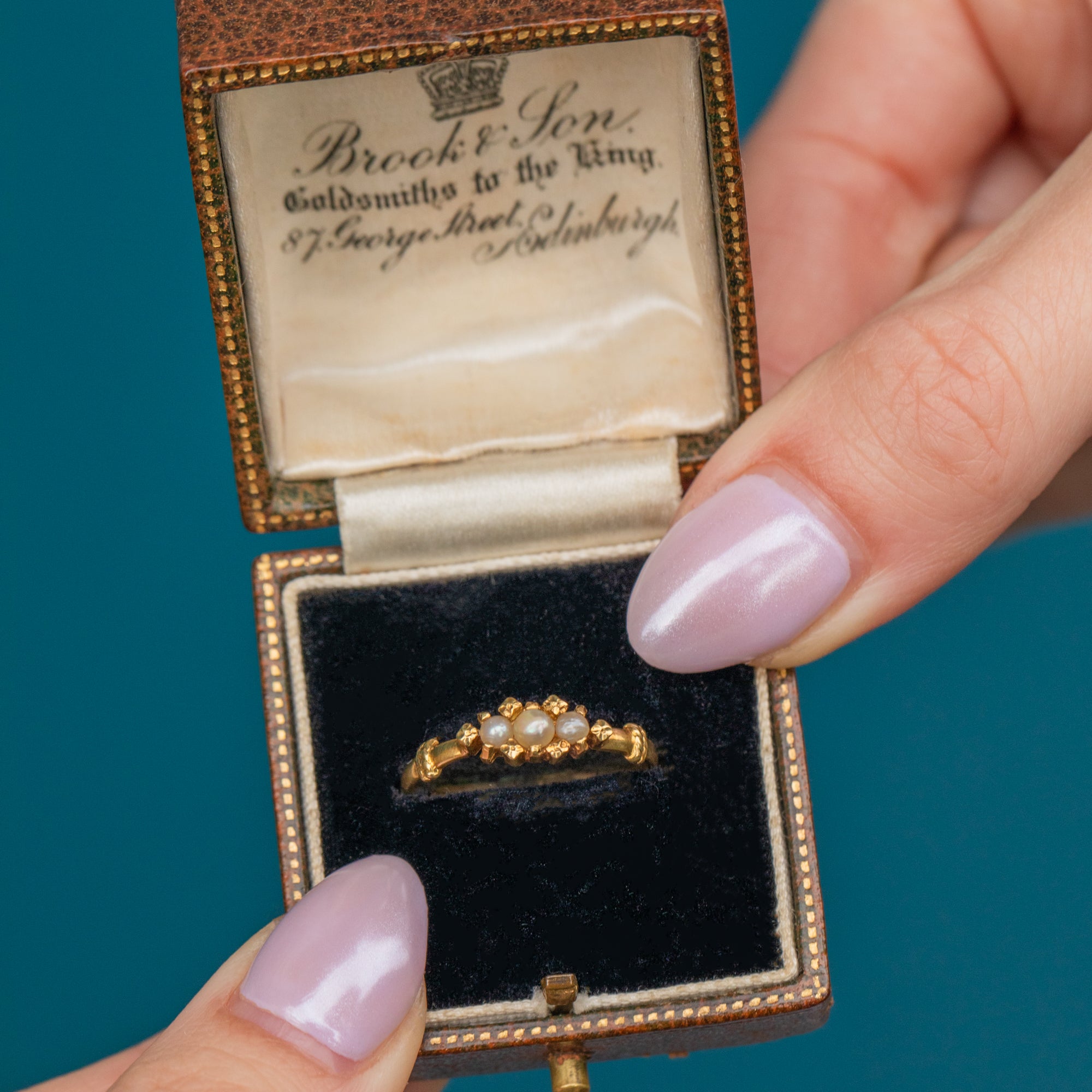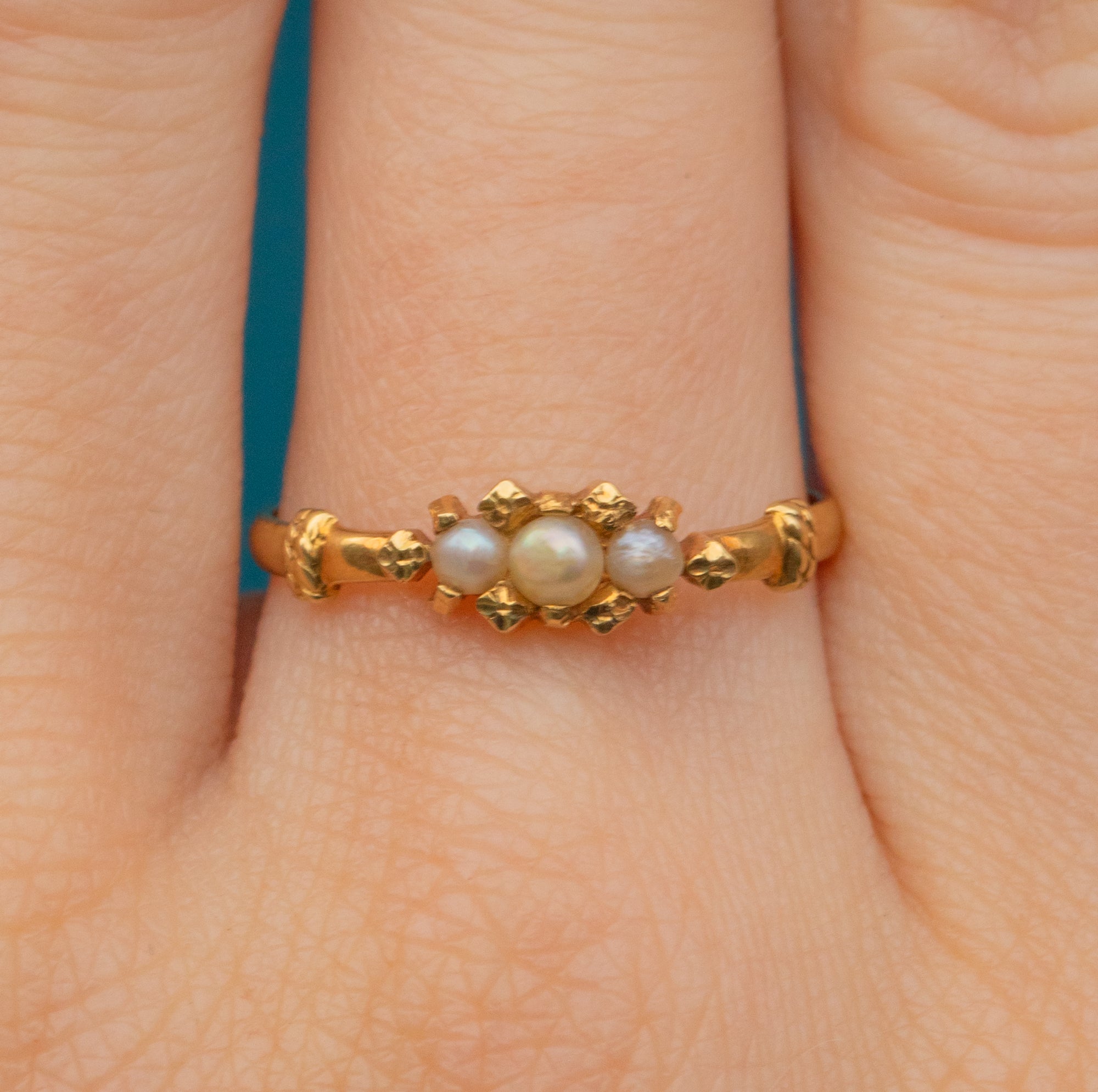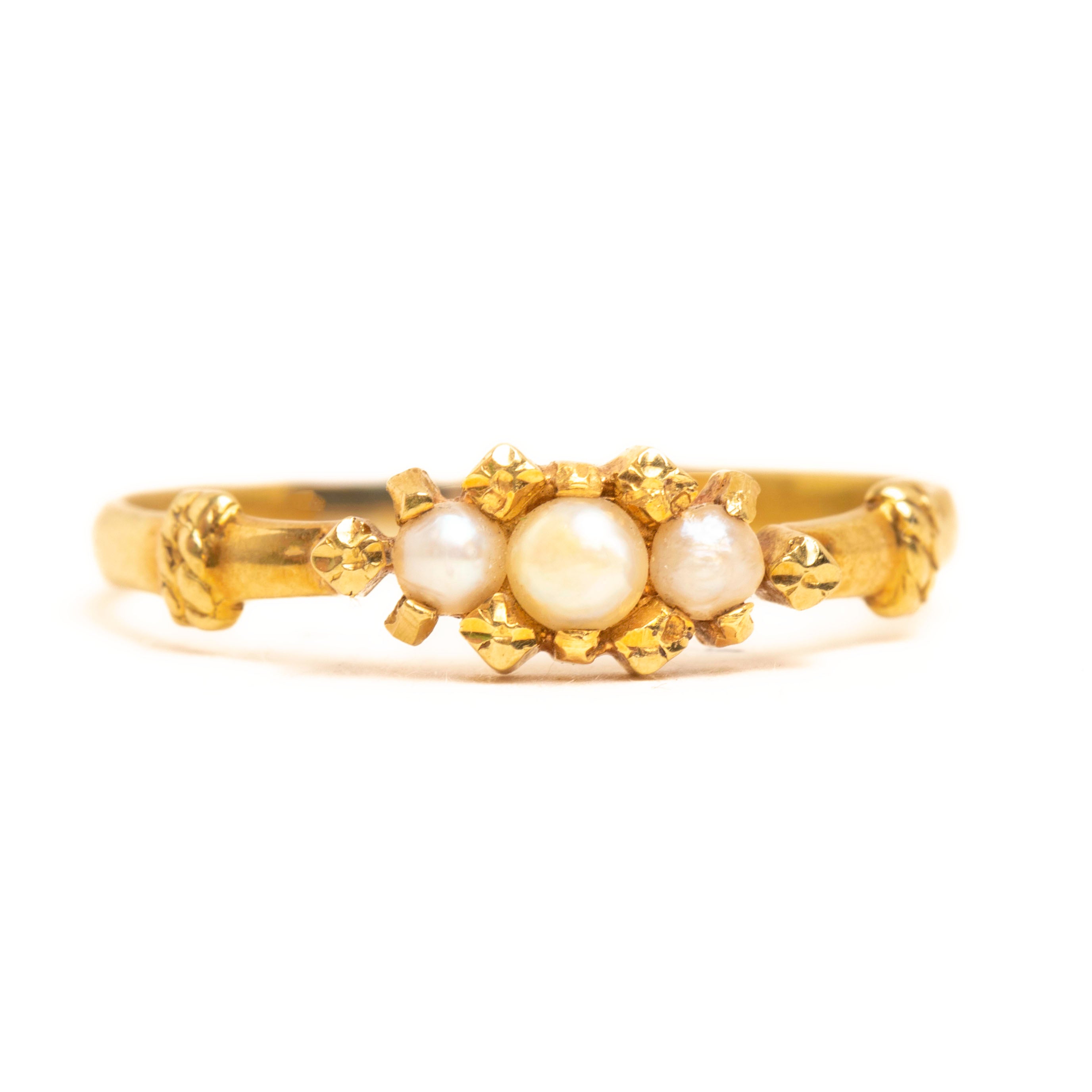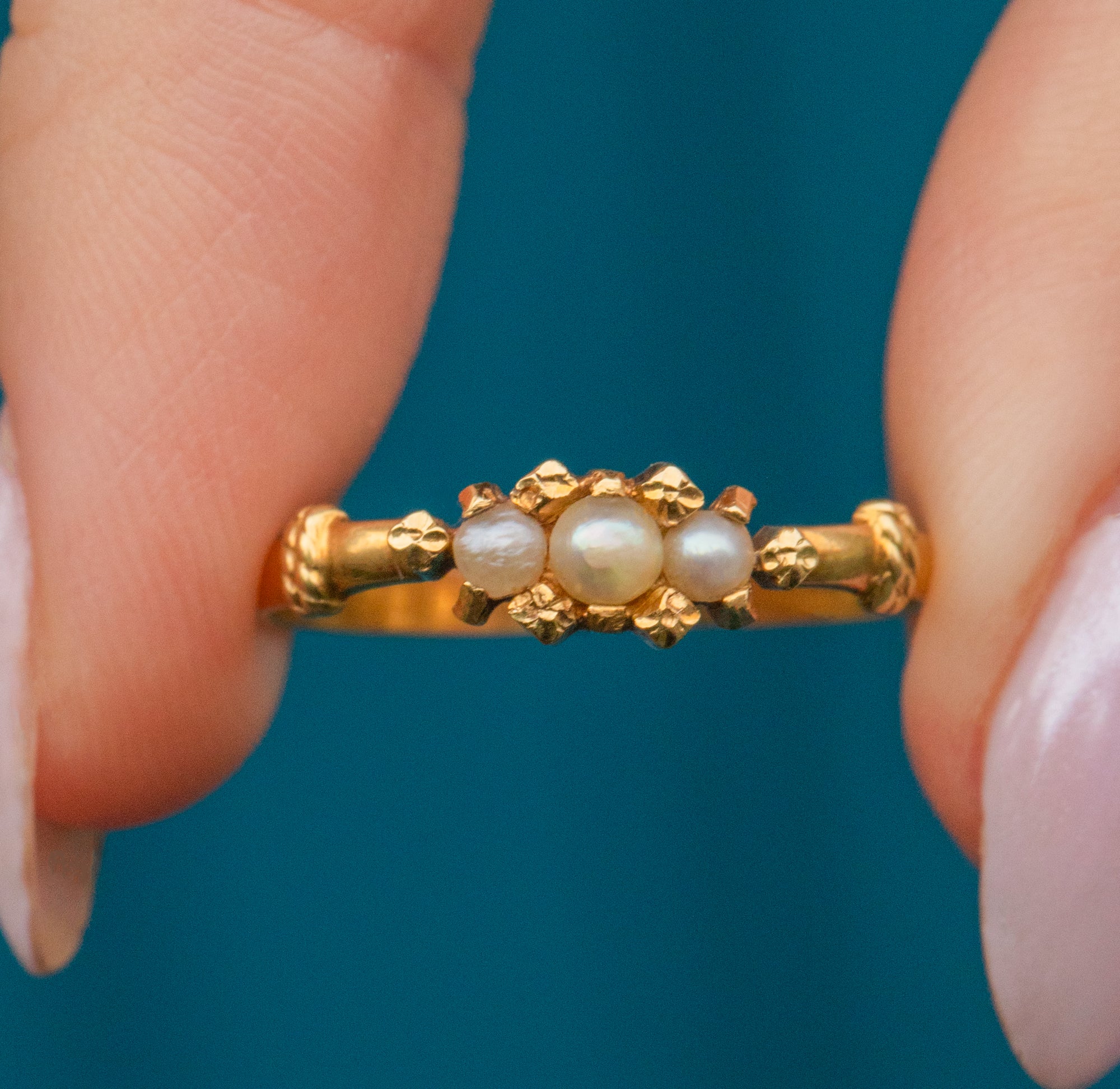 Isn't this antique French 18ct Gold Pearl three stone ring just the sweetest?! Inlaid with three shimmering Pearls across her centre framed by rope details on either shoulder, this Victorian ring is a truly gorgeous piece from the 19th century.
