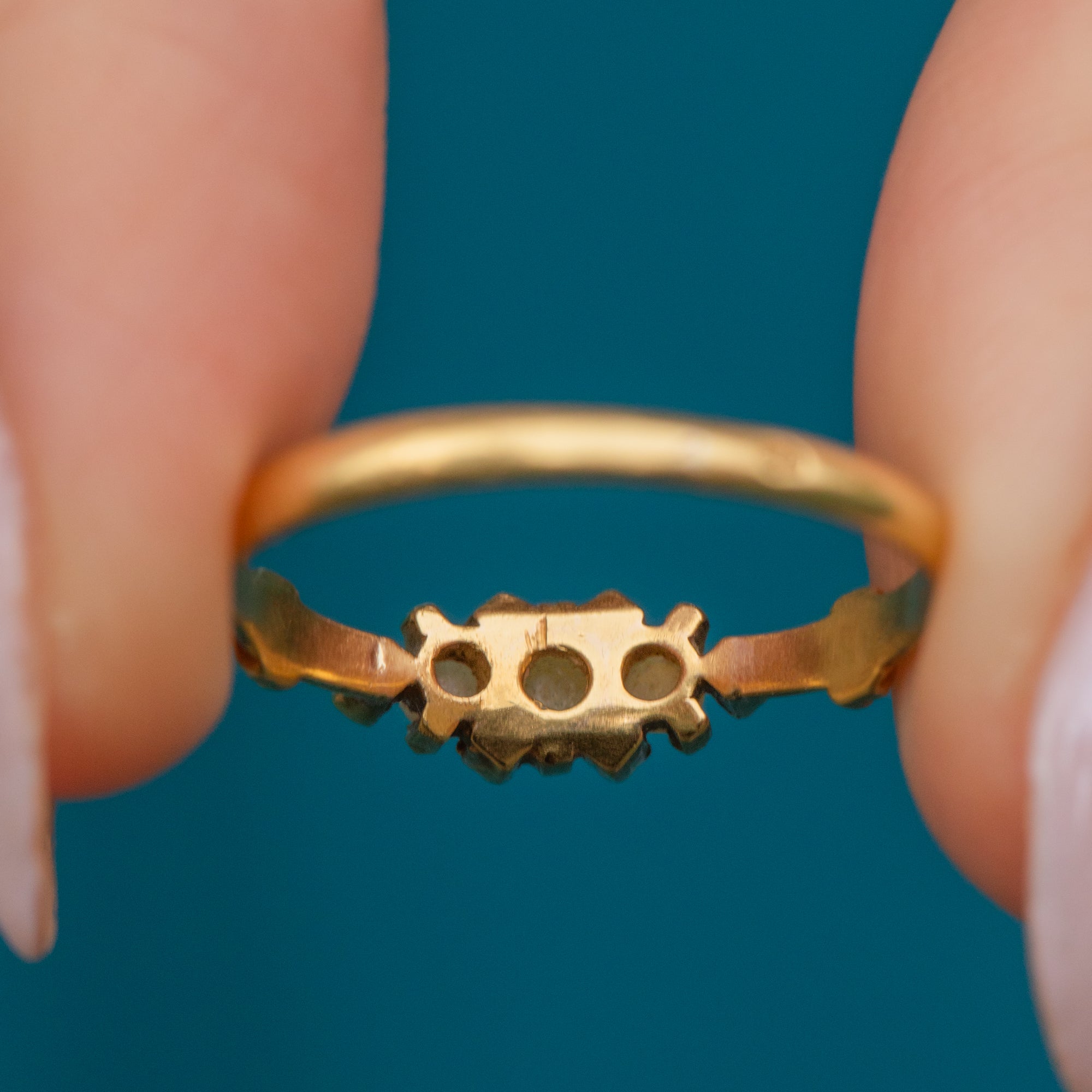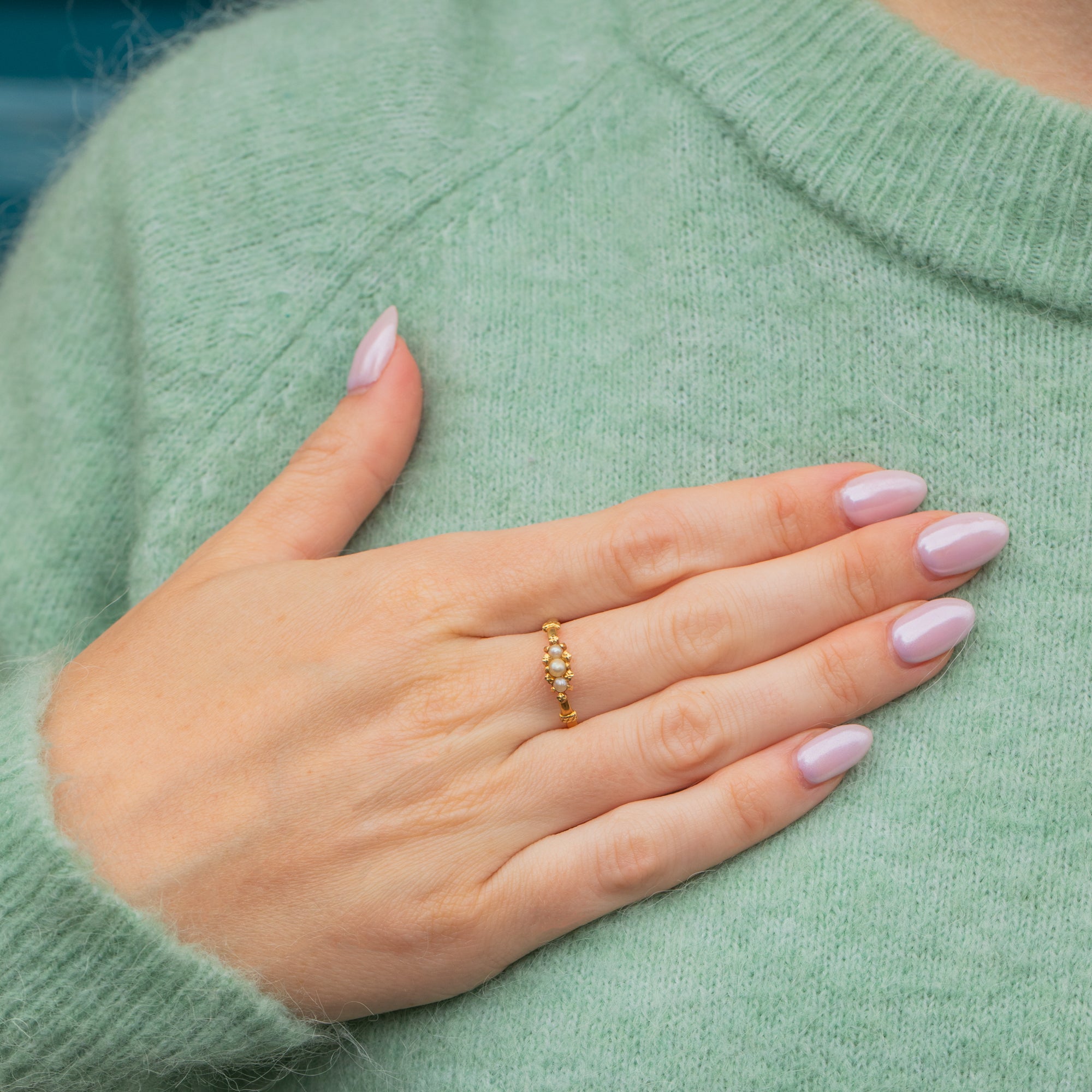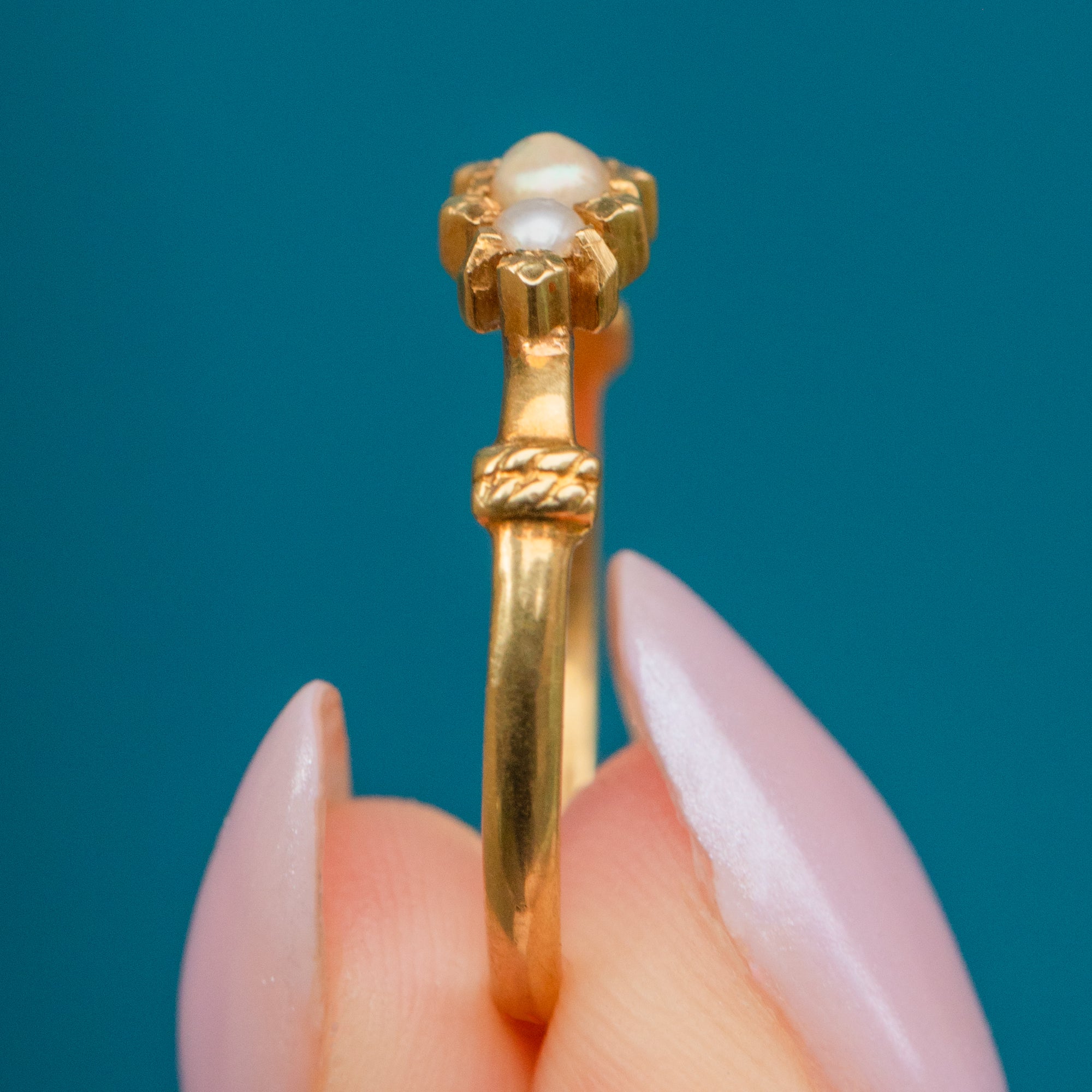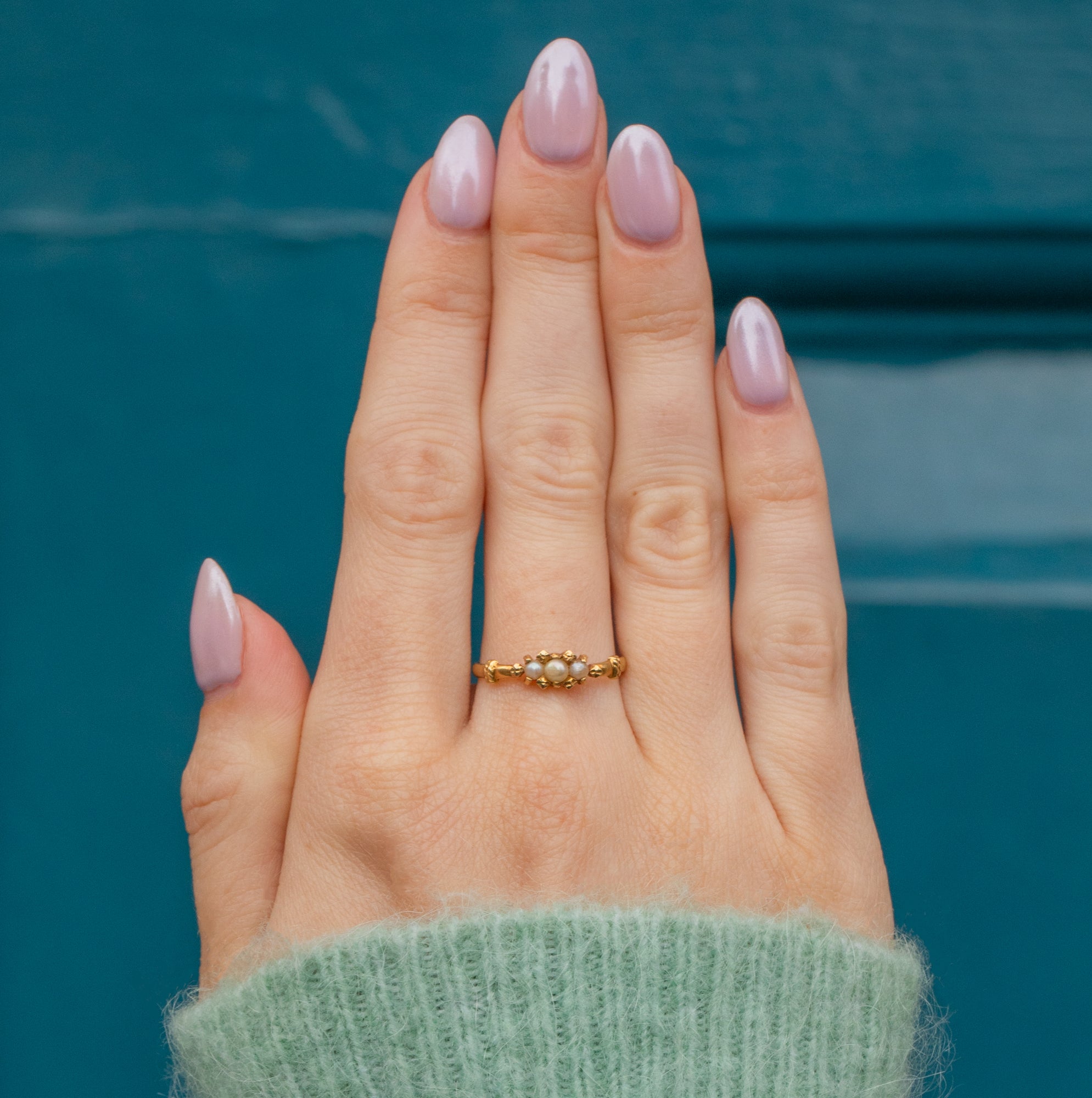 Isn't this antique French 18ct Gold Pearl three stone ring just the sweetest?! Inlaid with three shimmering Pearls across her centre framed by rope details on either shoulder, this Victorian ring is a truly gorgeous piece from the 19th century.