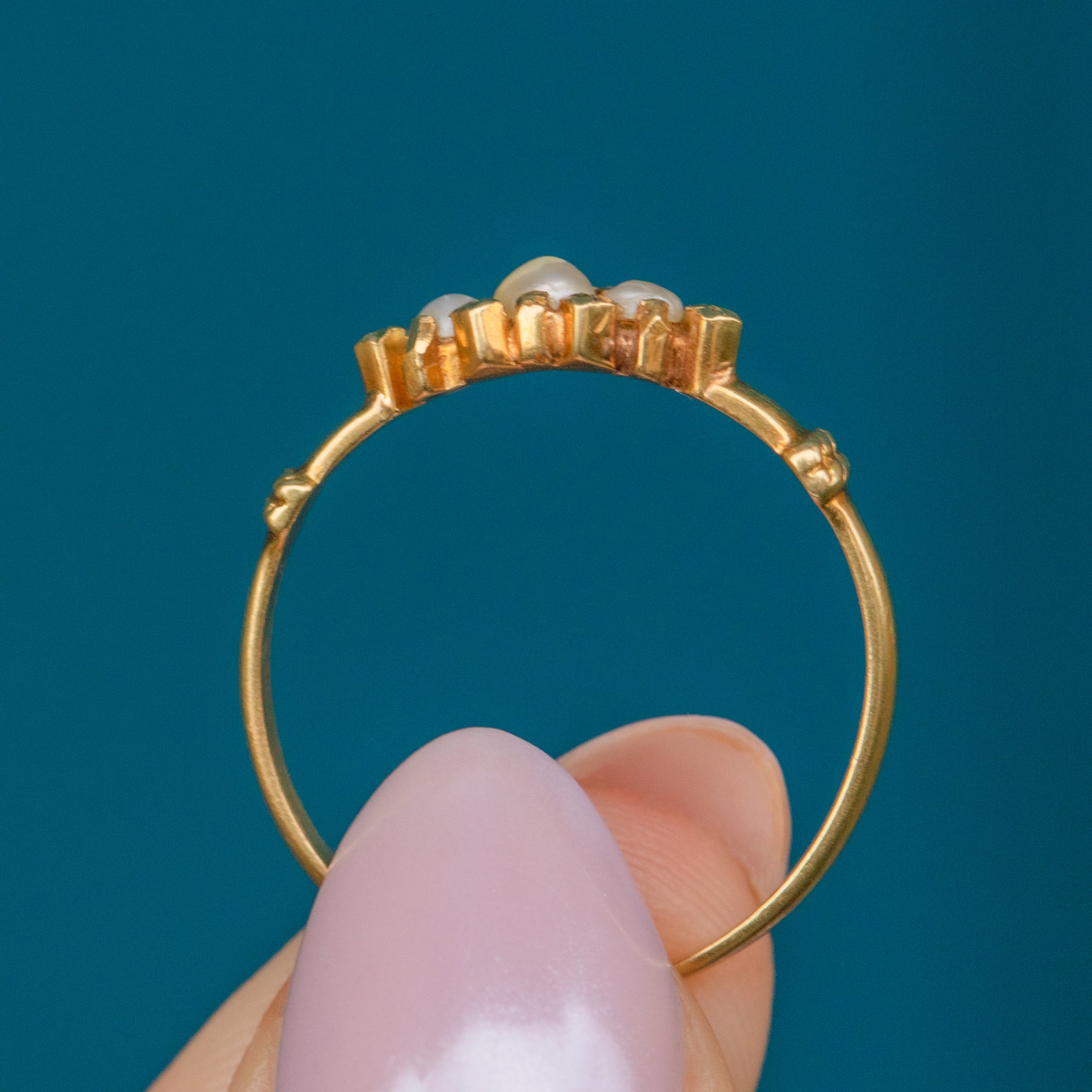 EXCELLENT. We are pleased to present this antique French 18ct Gold Pearl three-stone ring in excellent condition! The Pearls are nestled snugly with an eye-catching iridescence throughout. The Gold is bright and well formed and the ring band sits comfortably upon your hand. You will have no problems finding an excuse to wear this Gold Pearl ring!