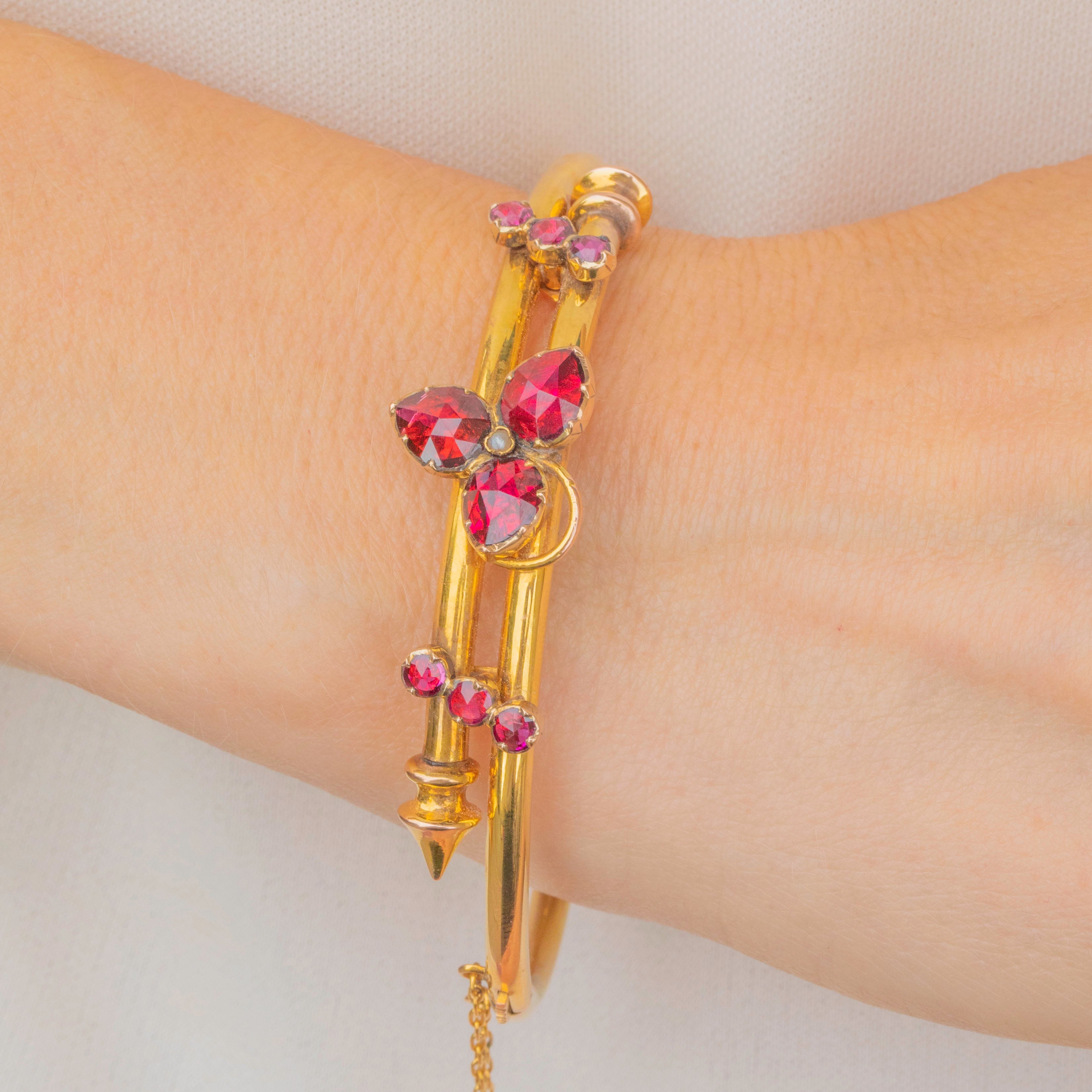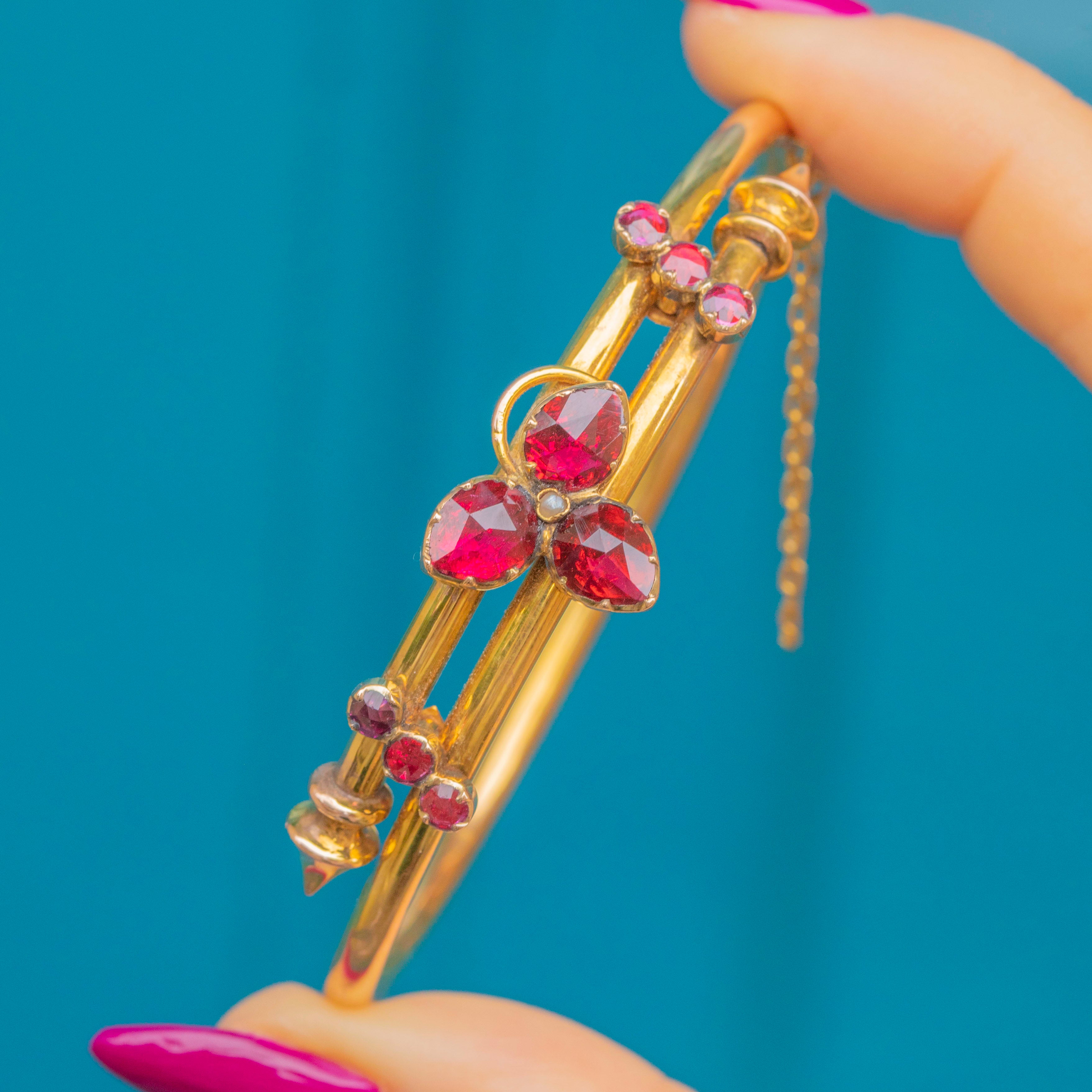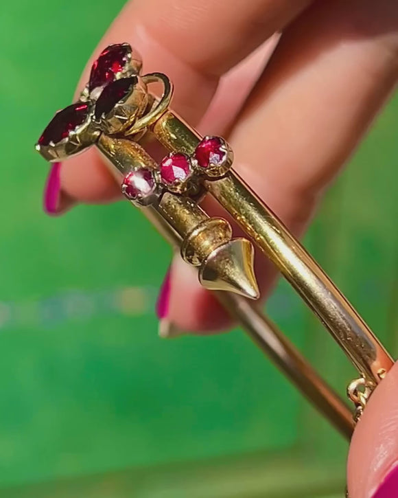 EXCELLENT: Each Garnet is radiant, with distinct facets and no visible chips or nibbles. The Gold is bright and buttery, with very minor signs of wear. Closing with a nice click and complete with a safety chain for added security, this Victorian bangle can be worn with utmost confidence.