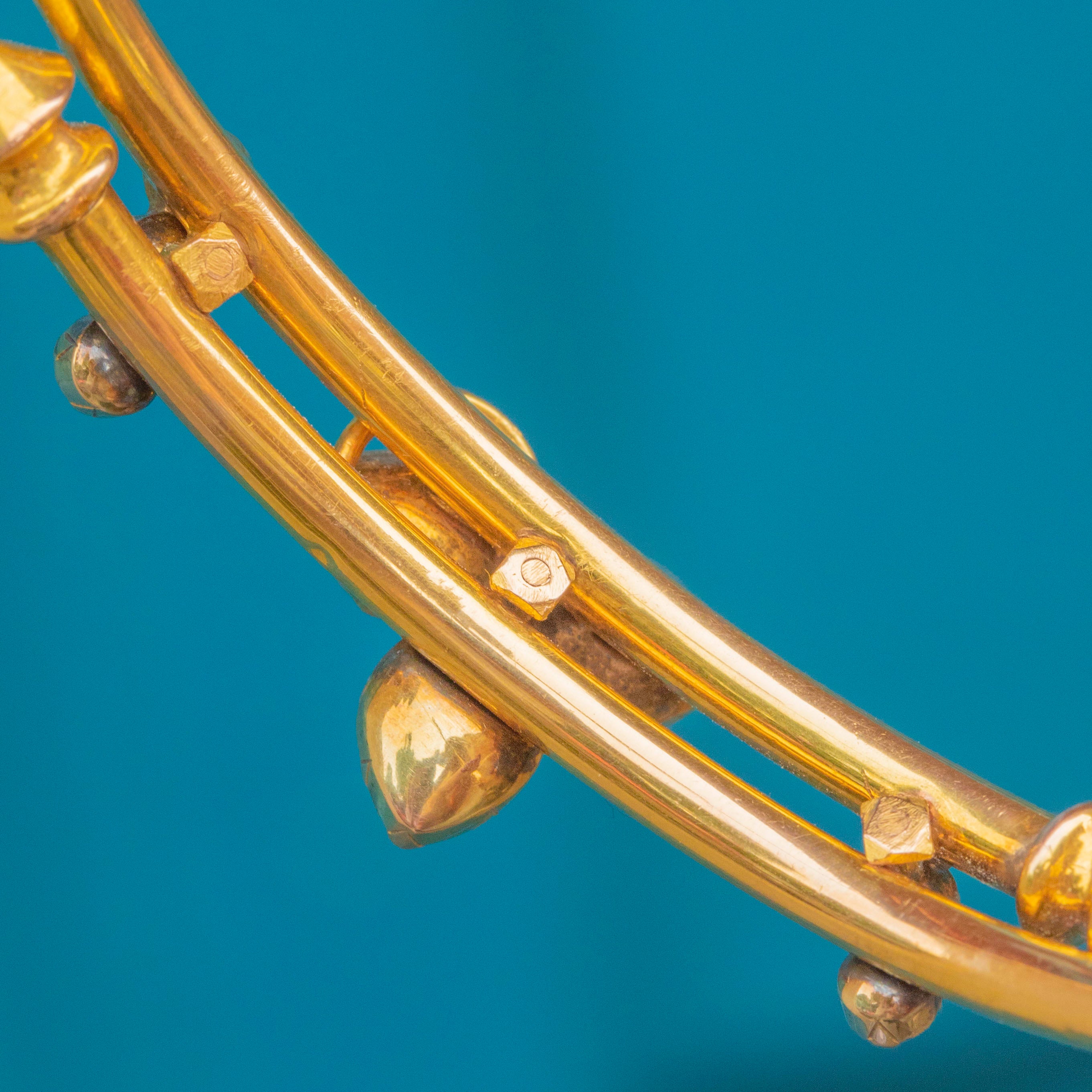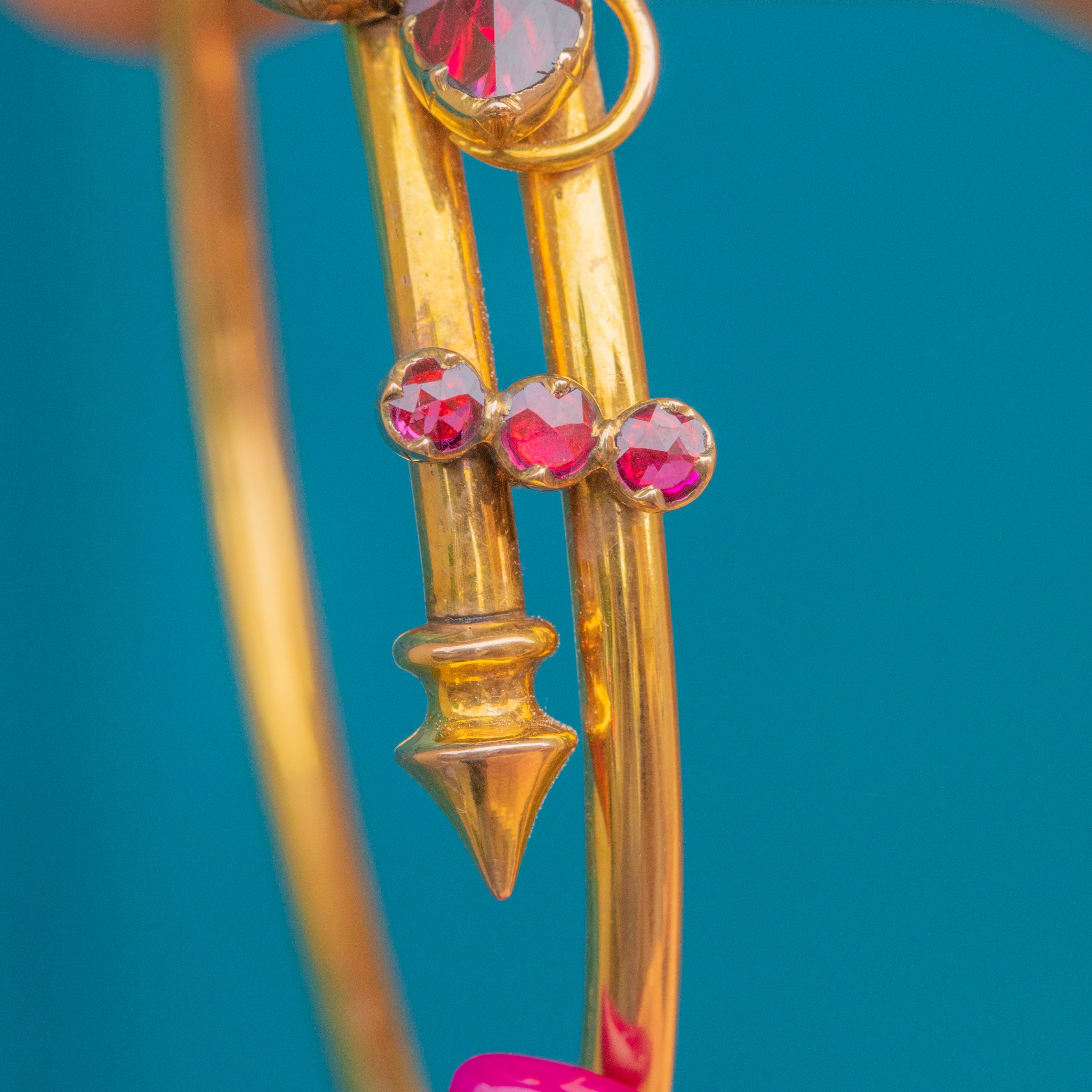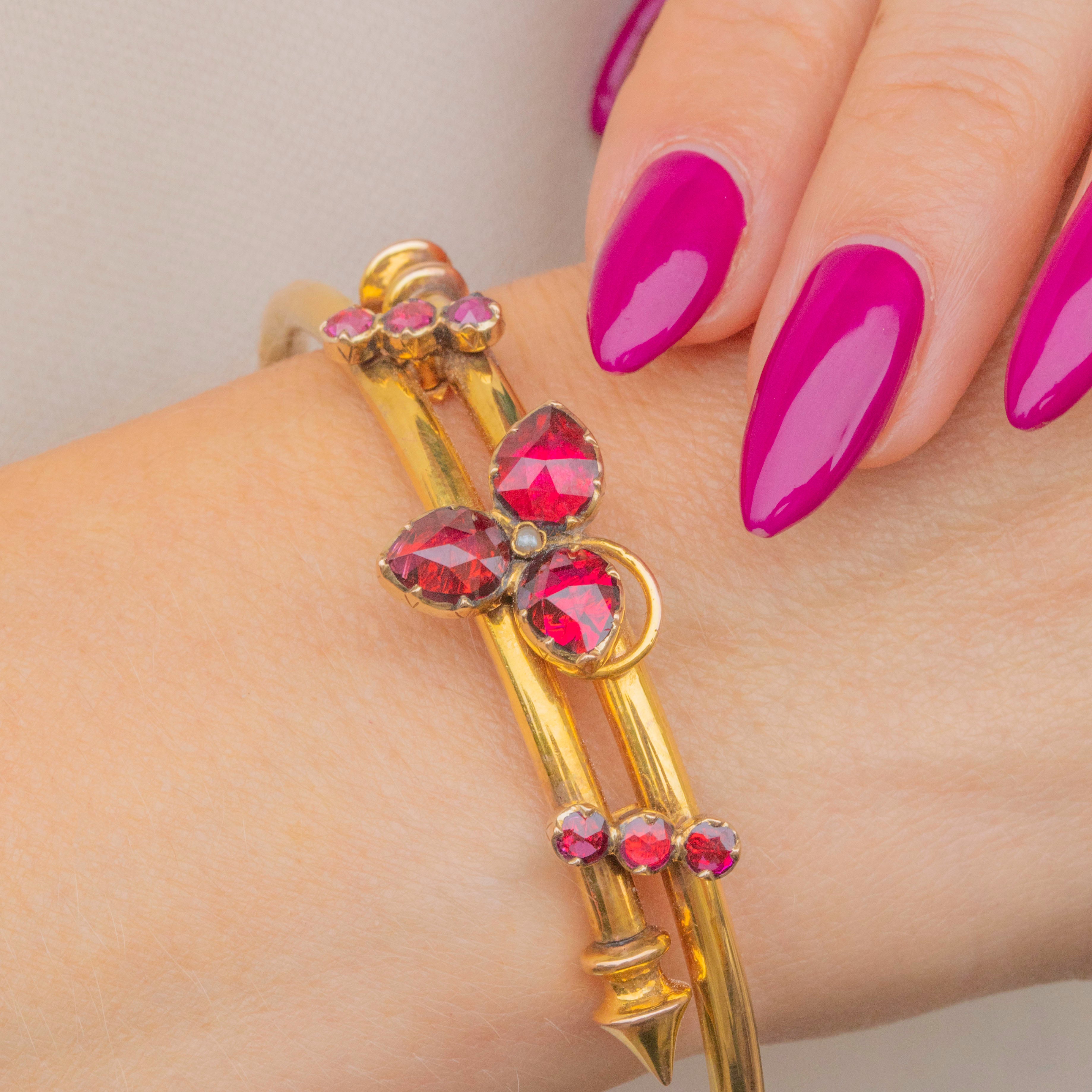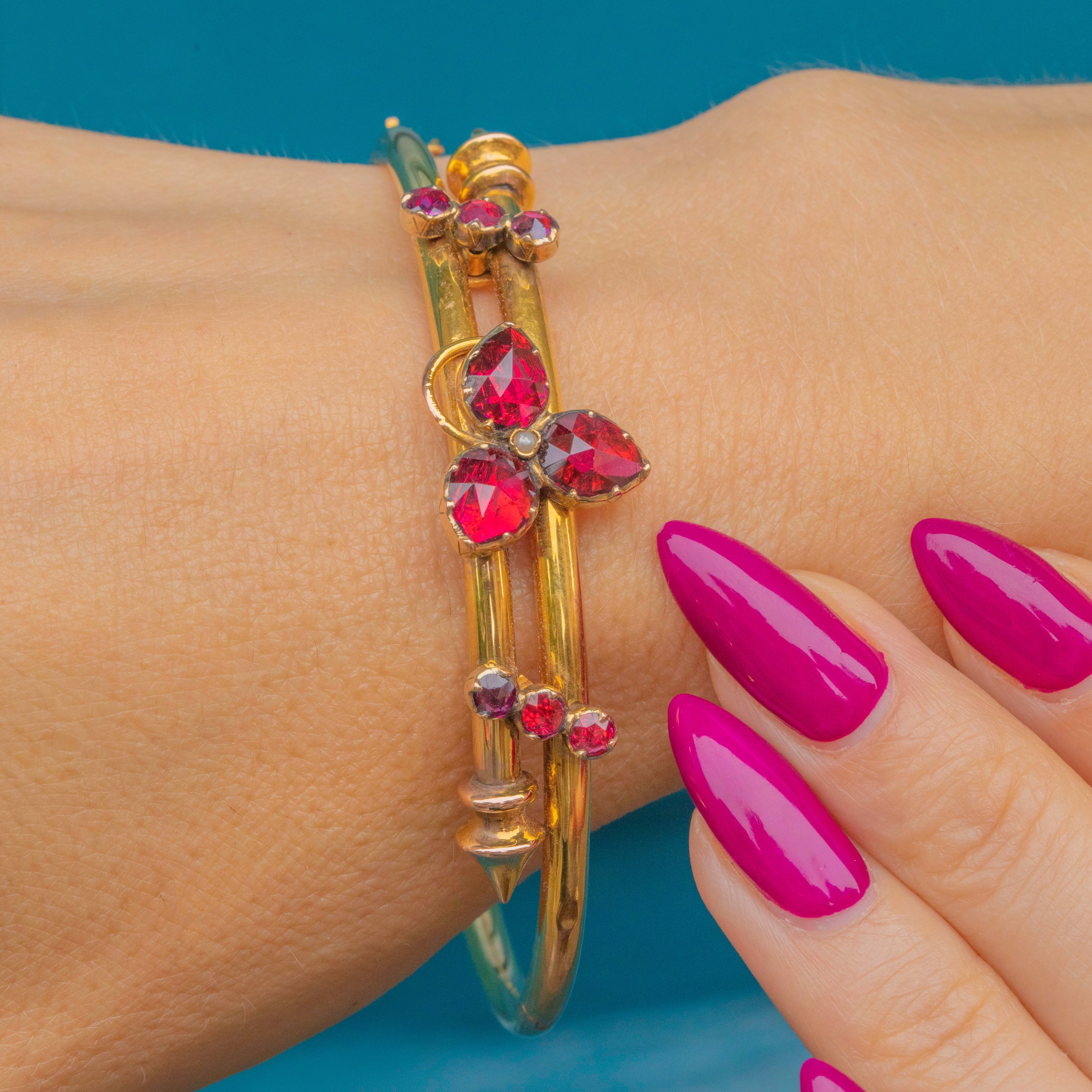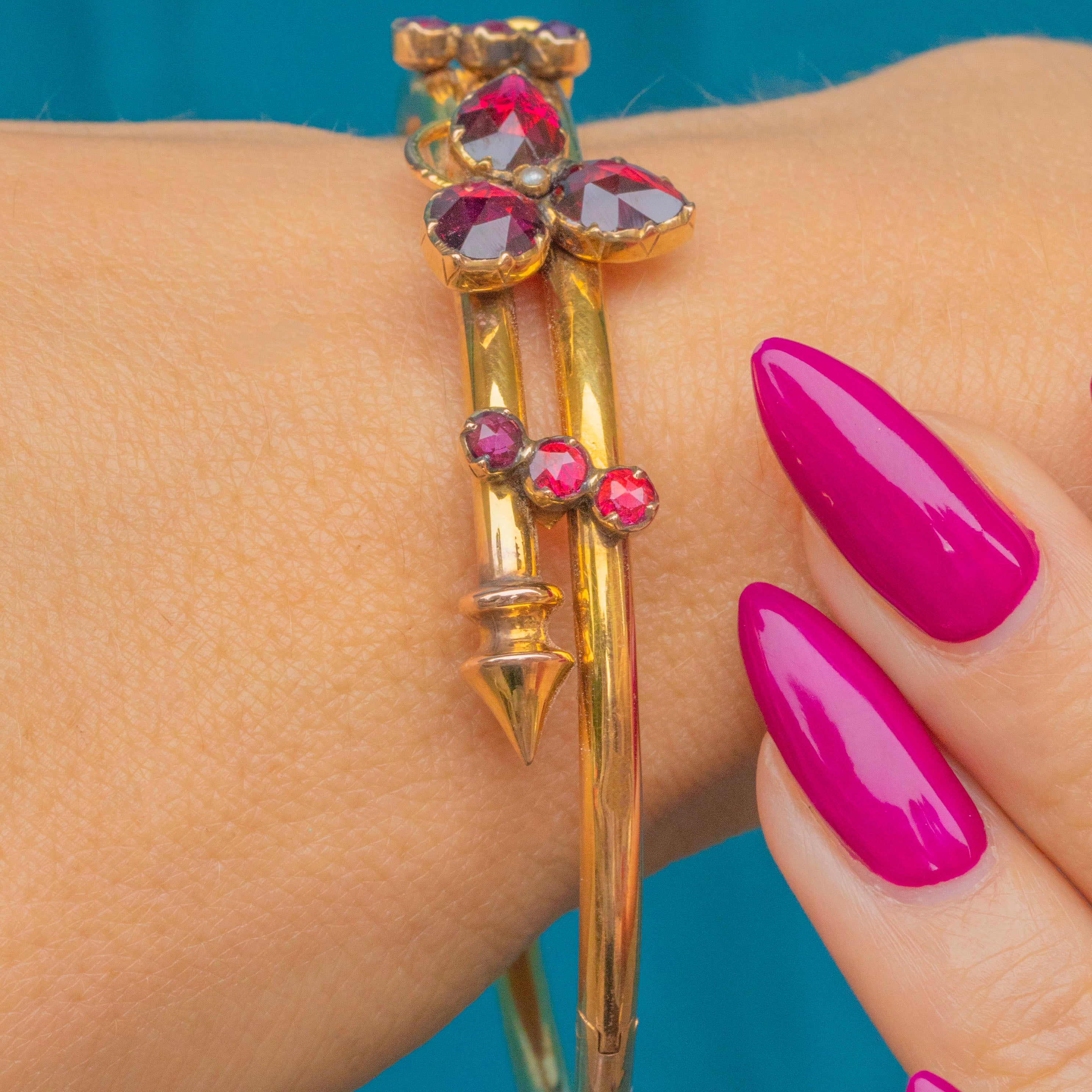 This resplendent 18ct Victorian French bangle flaunts 3.65ct of radiant Perpignan Garnets, each boasting a juicy sangria hue from their crisp facets.